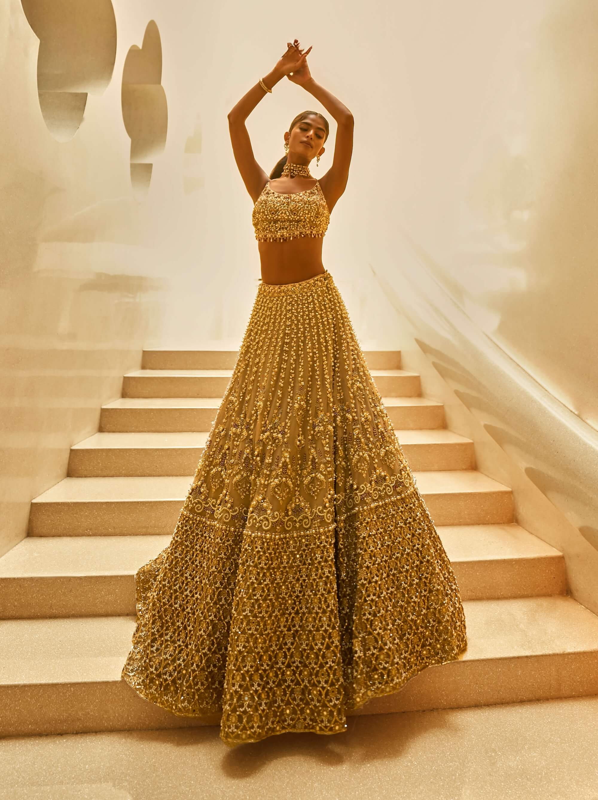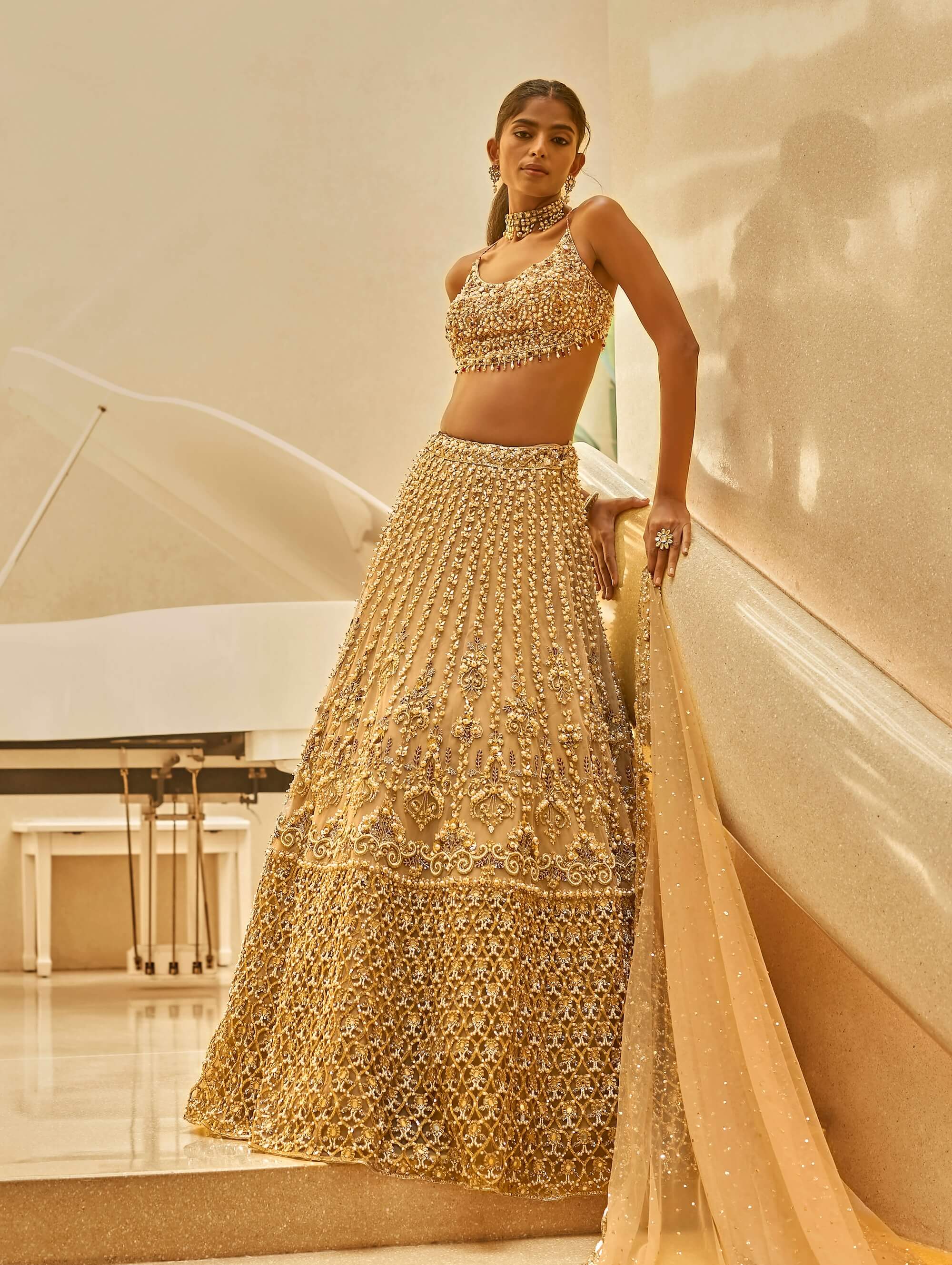A vision in biscuit-toned luxury, this lehenga blends contemporary glamour with timeless craft. A biscuit-tone lehenga set in tulle or structured fabric with sequins, beads, metallic threadwork, stones, pearls, zari, cutdana, mirror, and resham embroidery. Paired with an embroidered blouse and sheer dupatta.