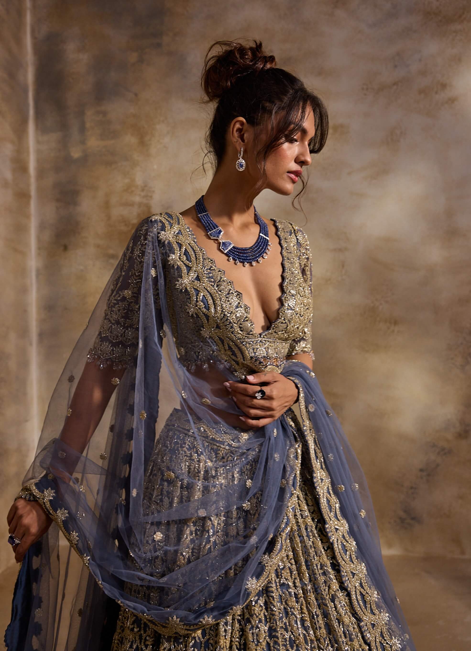 A blue-gray canvas comes alive with silver and gold beads, sequins and crystals that create a balanced metallic glow. Luxe yet understated, this net lehenga is perfect for receptions, cocktail nights and glamorous evening events.