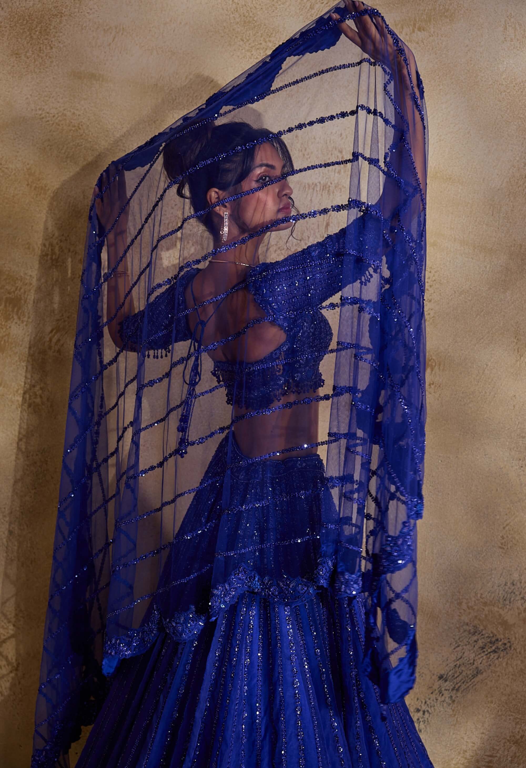 An electric burst of couture glamour defines this striking blue lehenga, drenched in tonal beads, crystals and sequins for uninterrupted brilliance, paired with a heavily worked organza dupatta. Designed for sangeets, receptions and high-impact celebrations where sparkle takes centre stage.