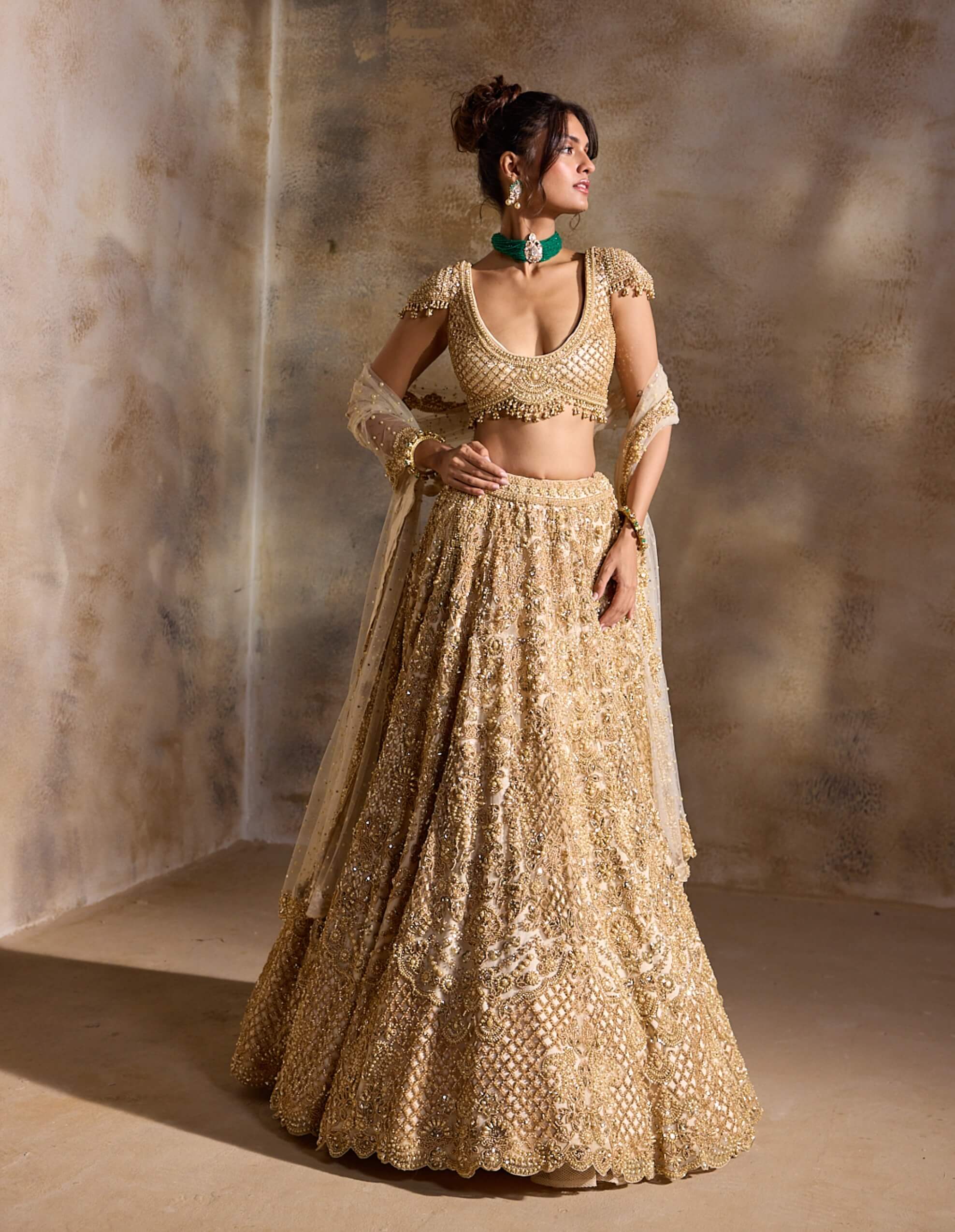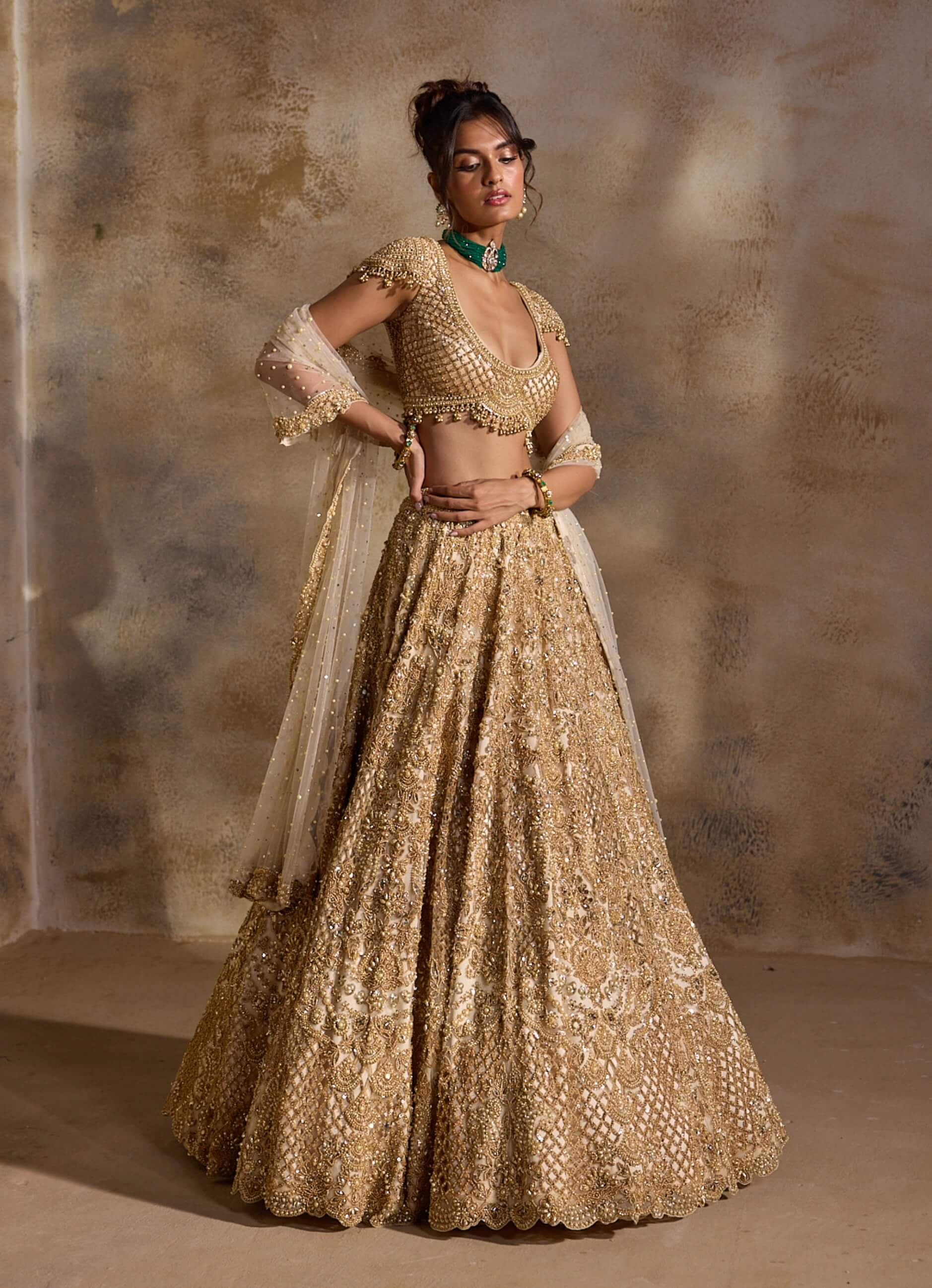 Golden cream couture unfolds in this tulle lehenga featuring intricate cutwork embroidery highlighted with metallic beads, sequins and crystals. Radiant yet refined, it’s a stunning choice for wedding pheras, grand receptions and opulent celebration evenings.