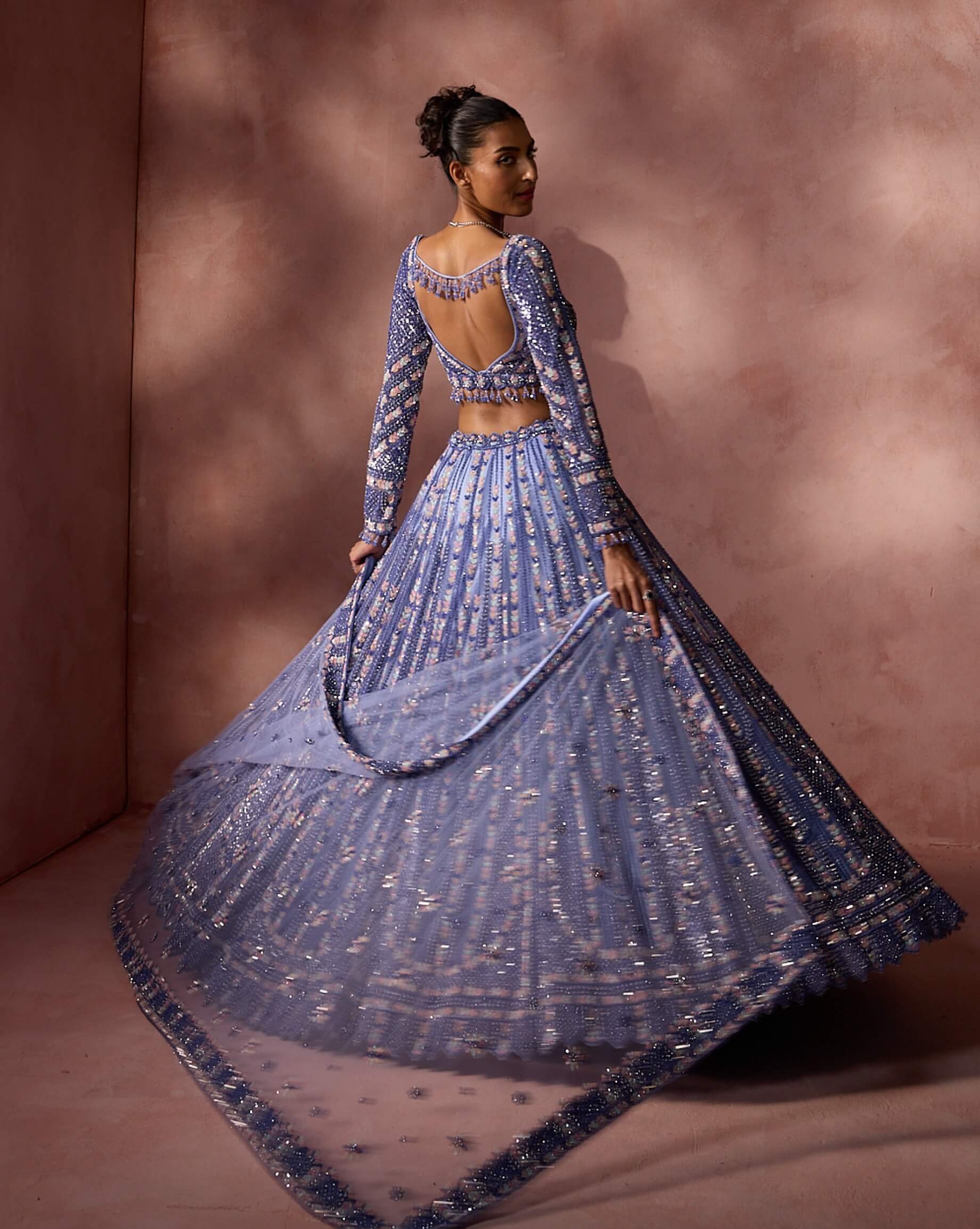 A deep, captivating ink-blue palette defines this net lehenga, detailed with self and contrast sequins, beads and crystals for multidimensional shine. Regal and striking, it’s suited for receptions, sangeet nights and midnight celebration themes.