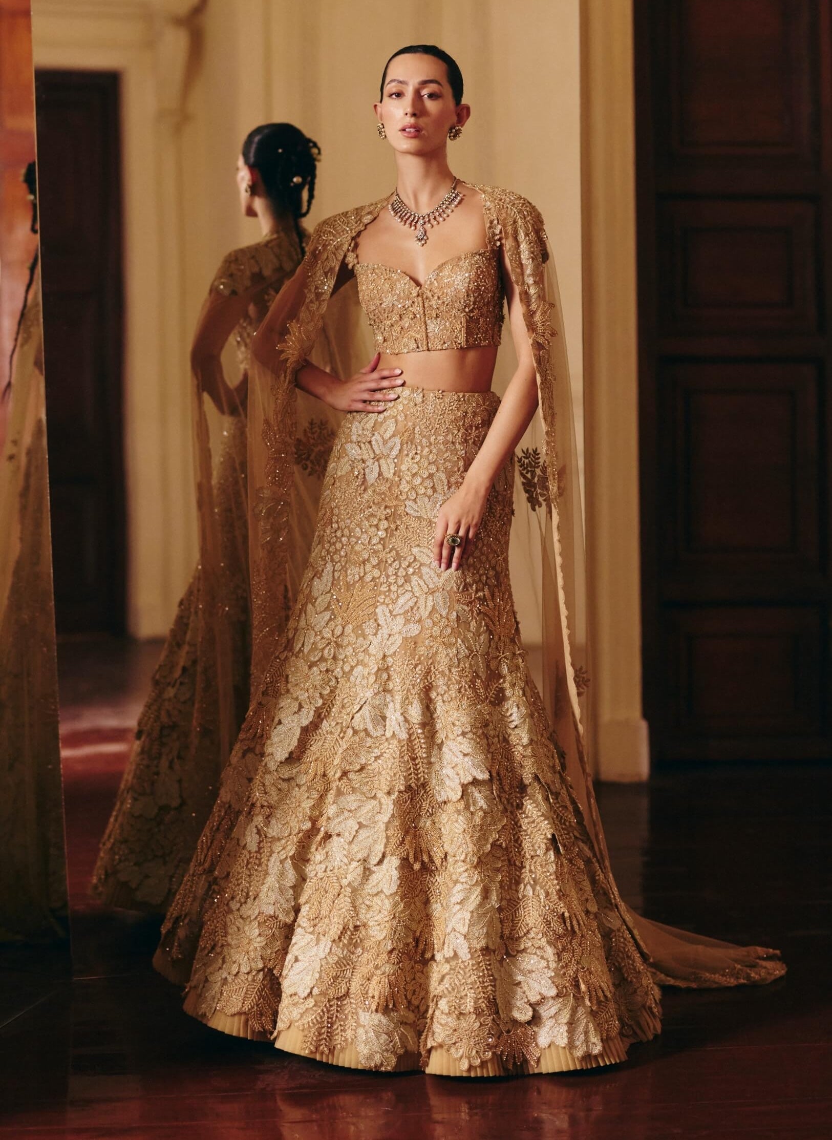 A dramatic interplay of texture and shine, this gold tulle skirt set features a layered fishcut silhouette embroidered with assorted leaf motifs. Paired with a sleek corset and a sheer cape, it creates an effortlessly striking look. Perfect for sangeet nights, fashion-forward wedding events, or elegant evening soirées.