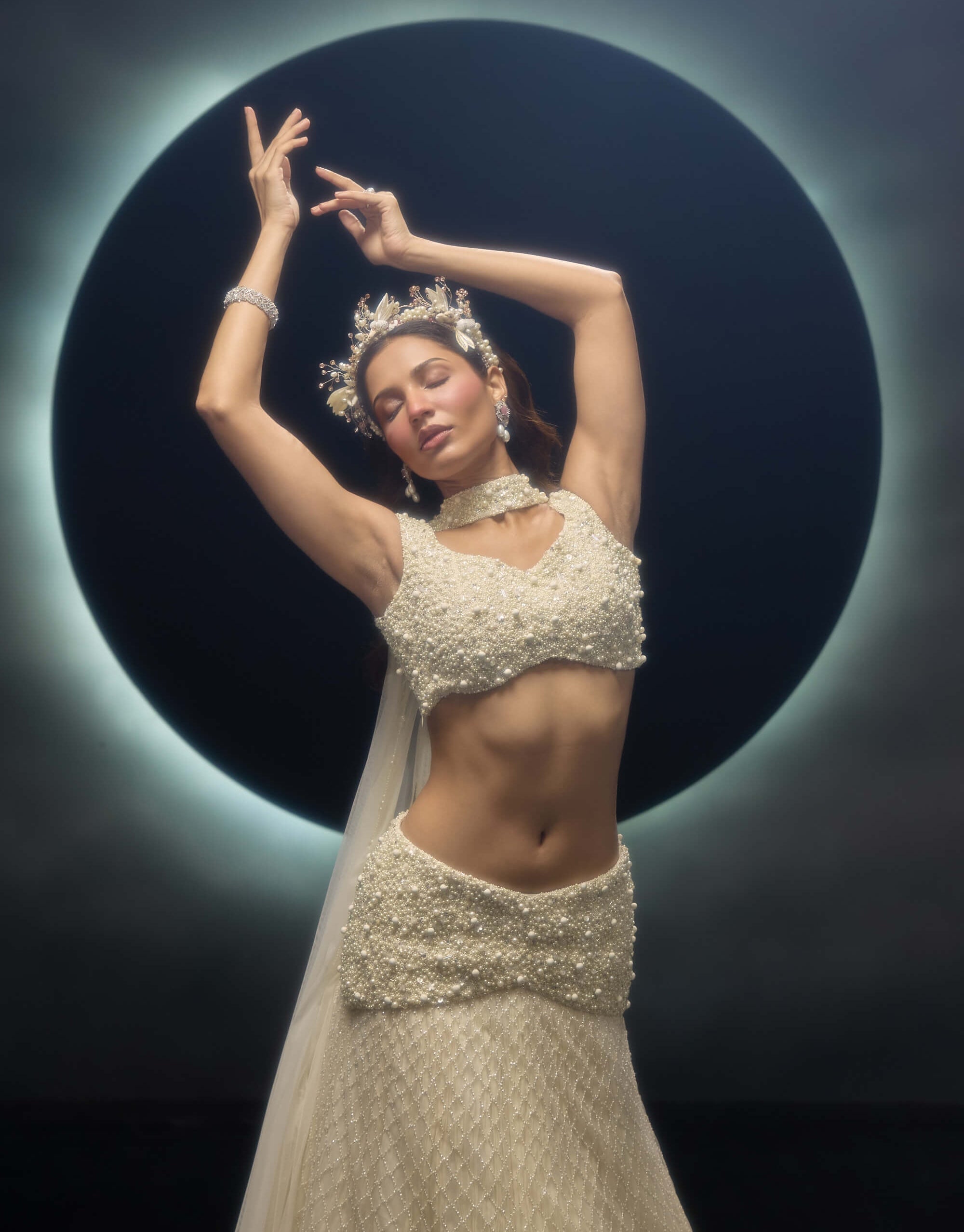 Soft as moonlight and layered in ethereal texture, the liora lehenga set is a celebration of uninterrupted grace. The ivory net base is balanced beautifully with a viscose bustier and a cascading soft-net dupatta. Every detail feels weightless, polished, and impeccably crafted. Perfect for day weddings, pastel-themed festivities, and elegant mehendi functions. A serene choice for those who love classic minimalism with a couture edge.
