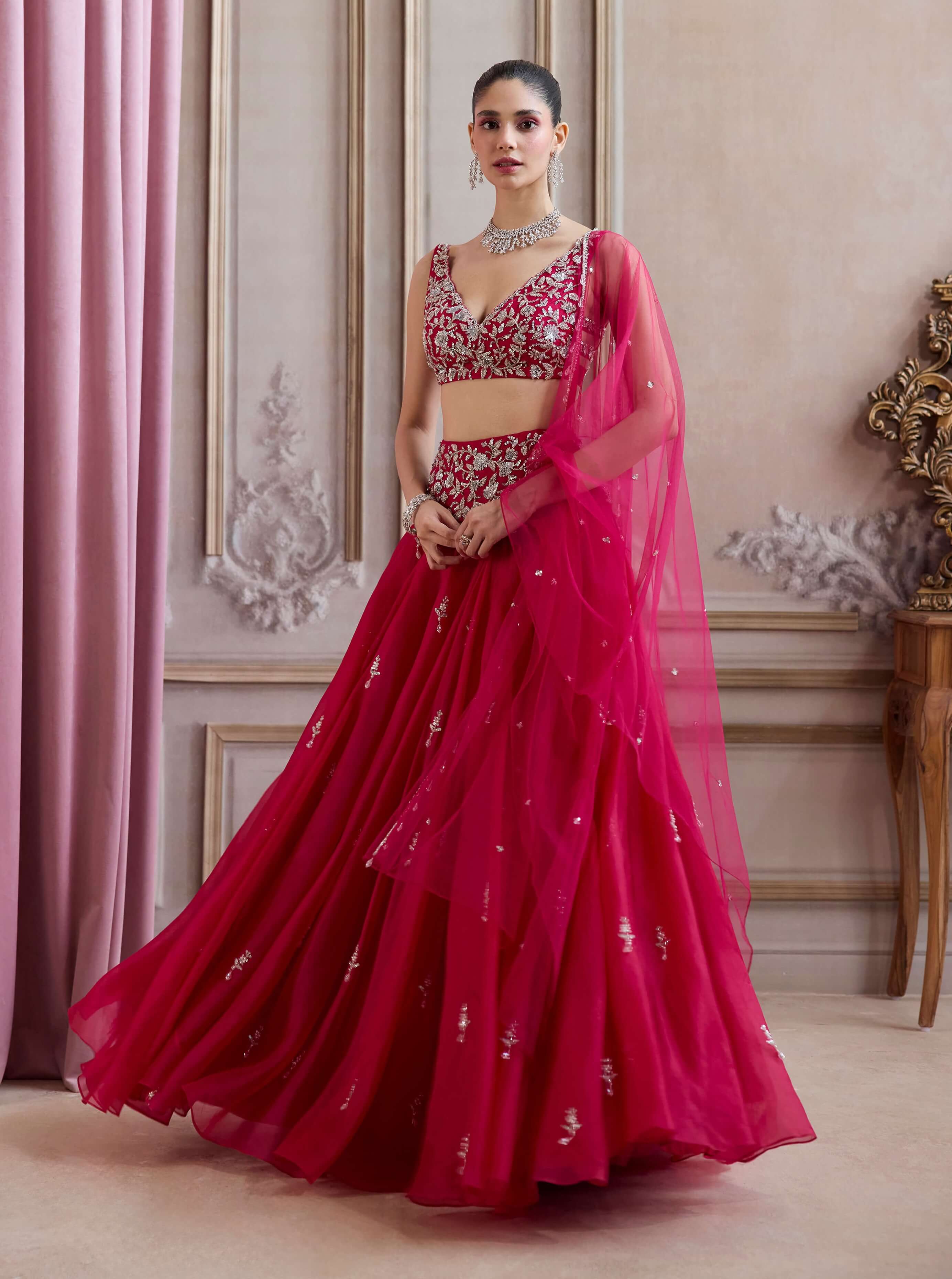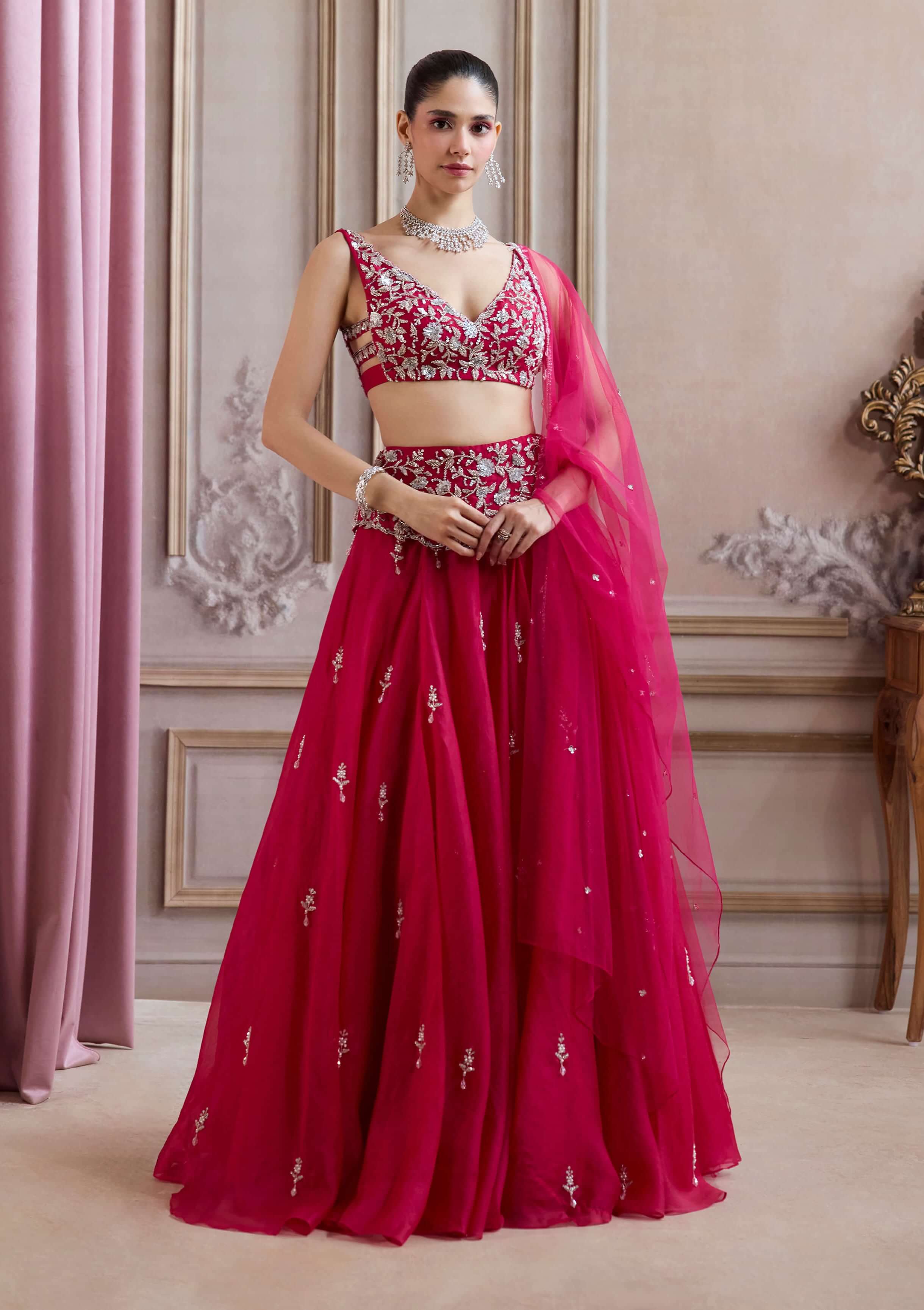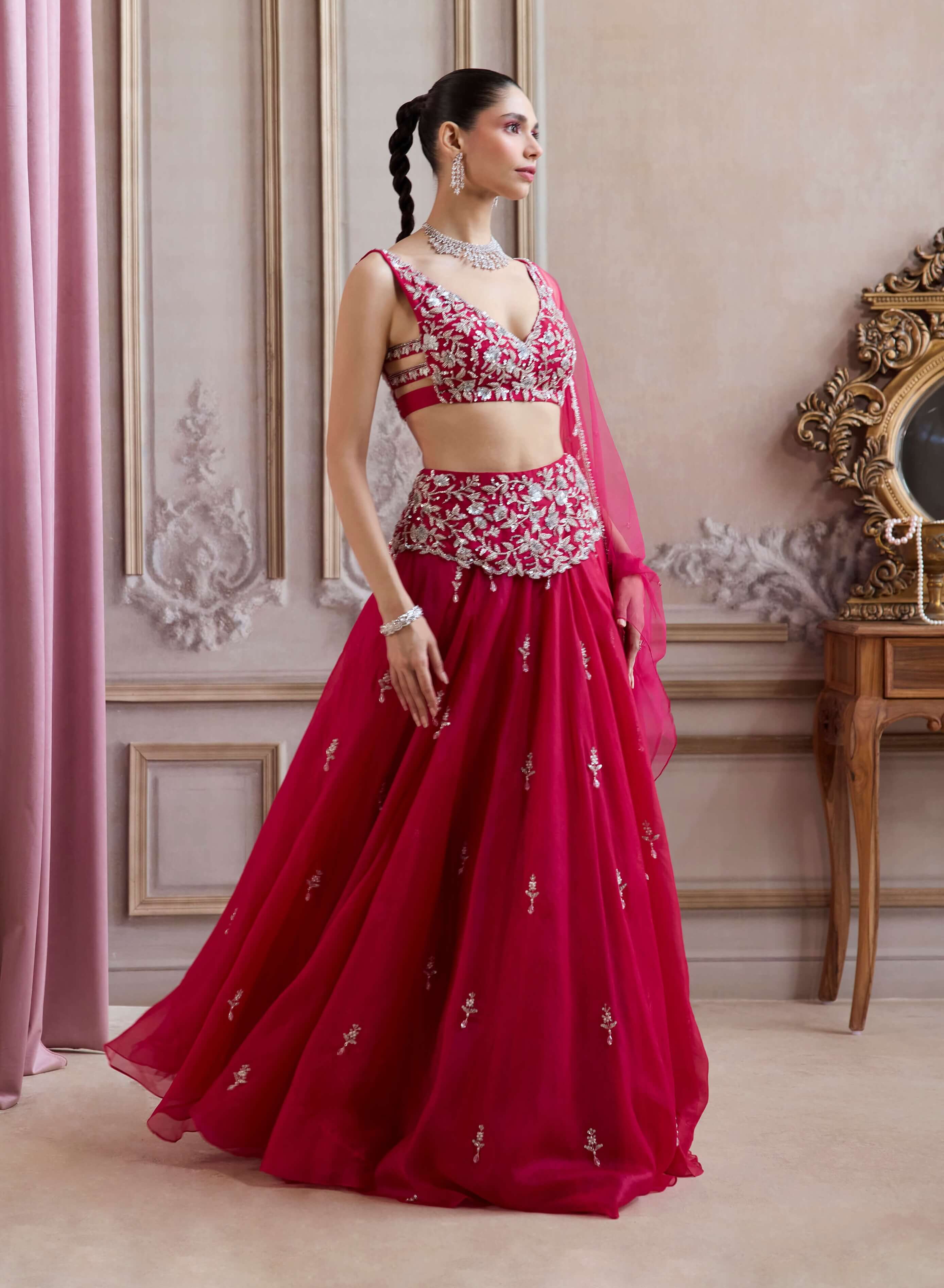 Drenched in vibrance, this magenta pure silk organza lehenga dazzles with intricate floral booties and glistening glass tassels. The V-neck blouse features exquisite cutwork detailing, complemented by a statement embroidered belt accentuating the waist. Paired with a soft net dupatta finished with tassels, it’s the epitome of bold romantic allure.