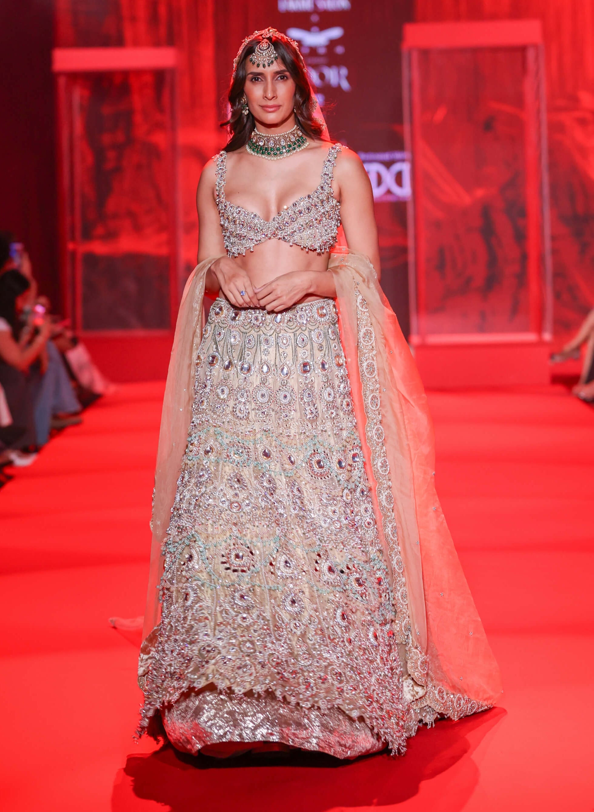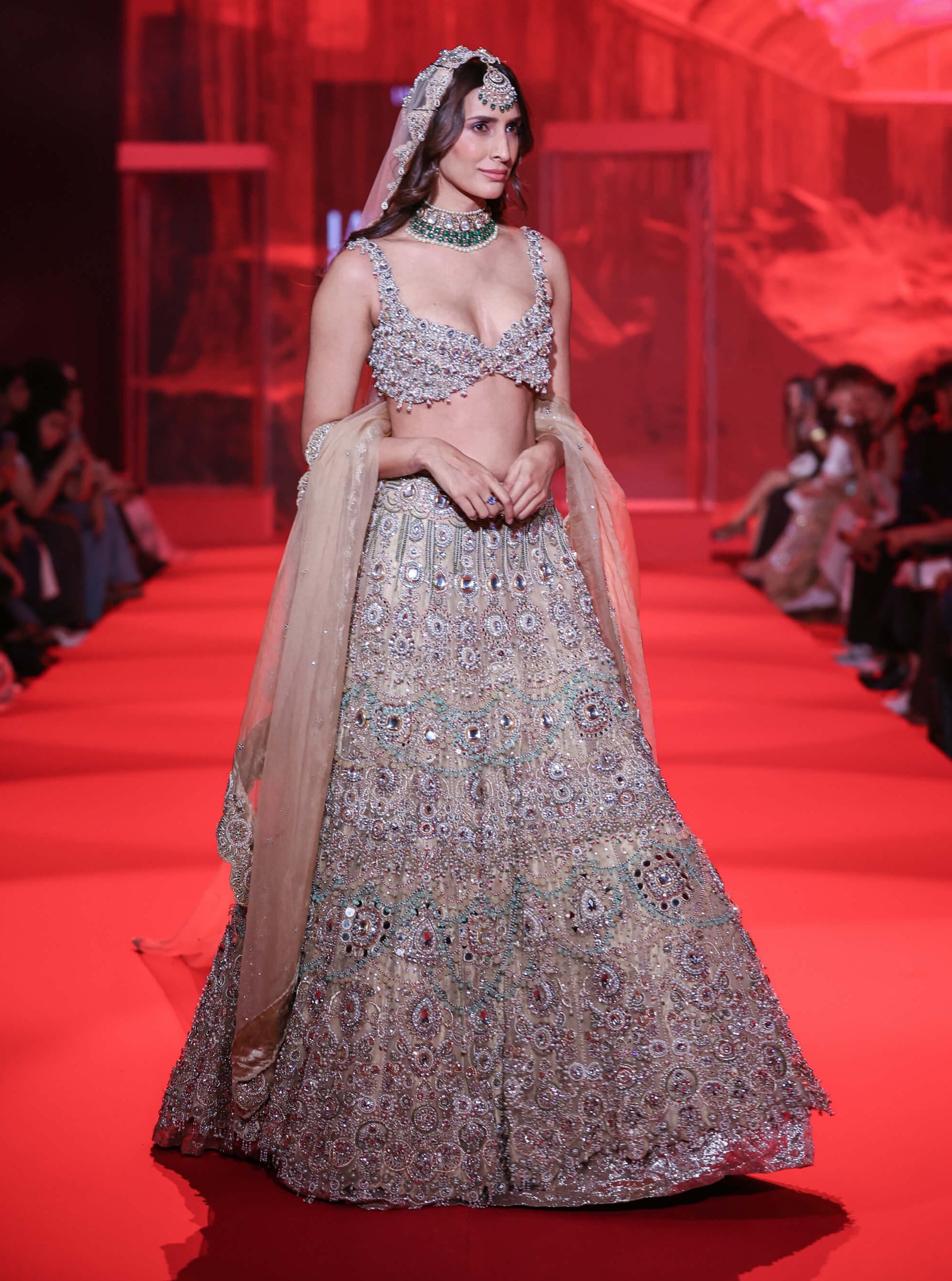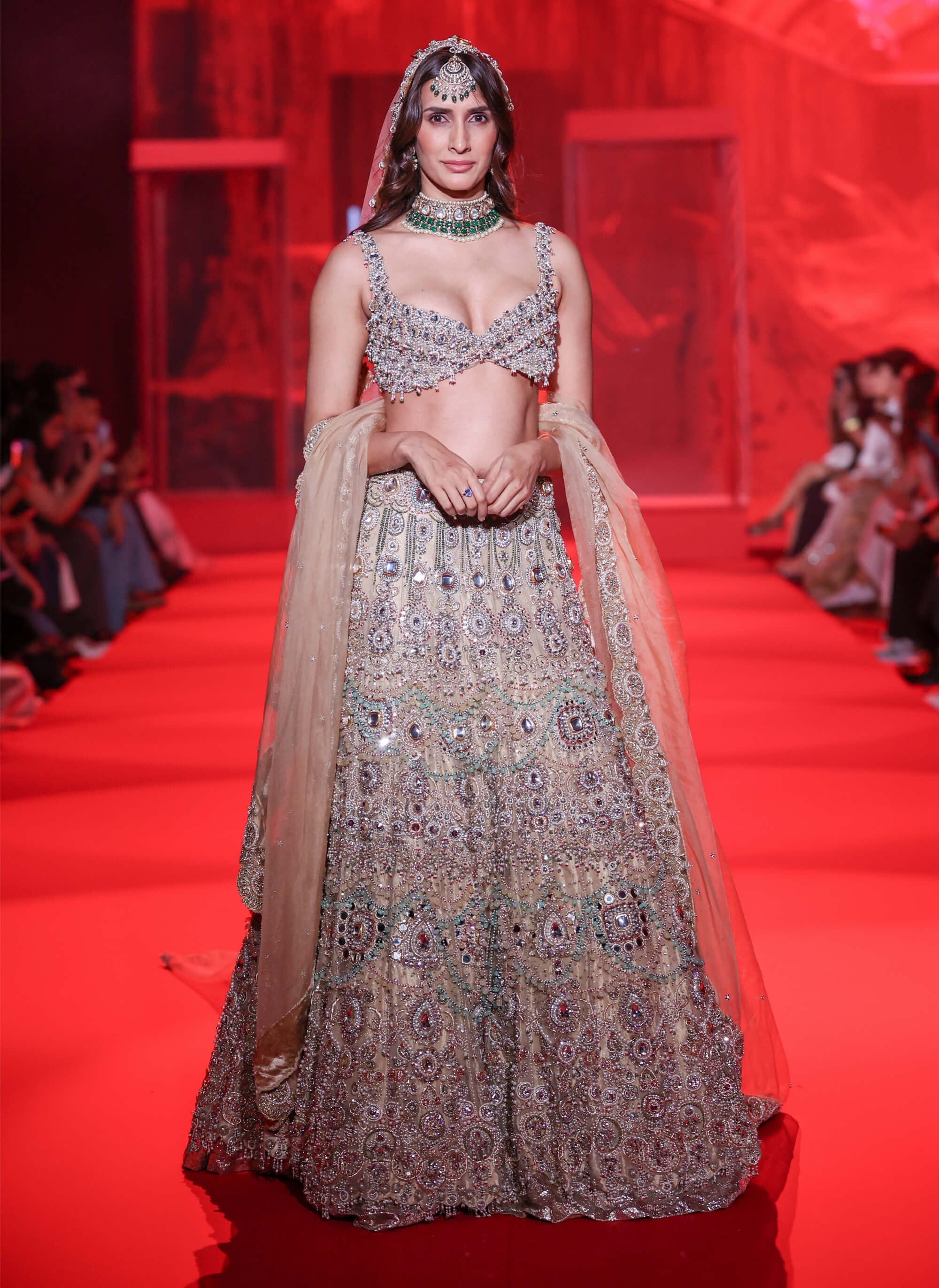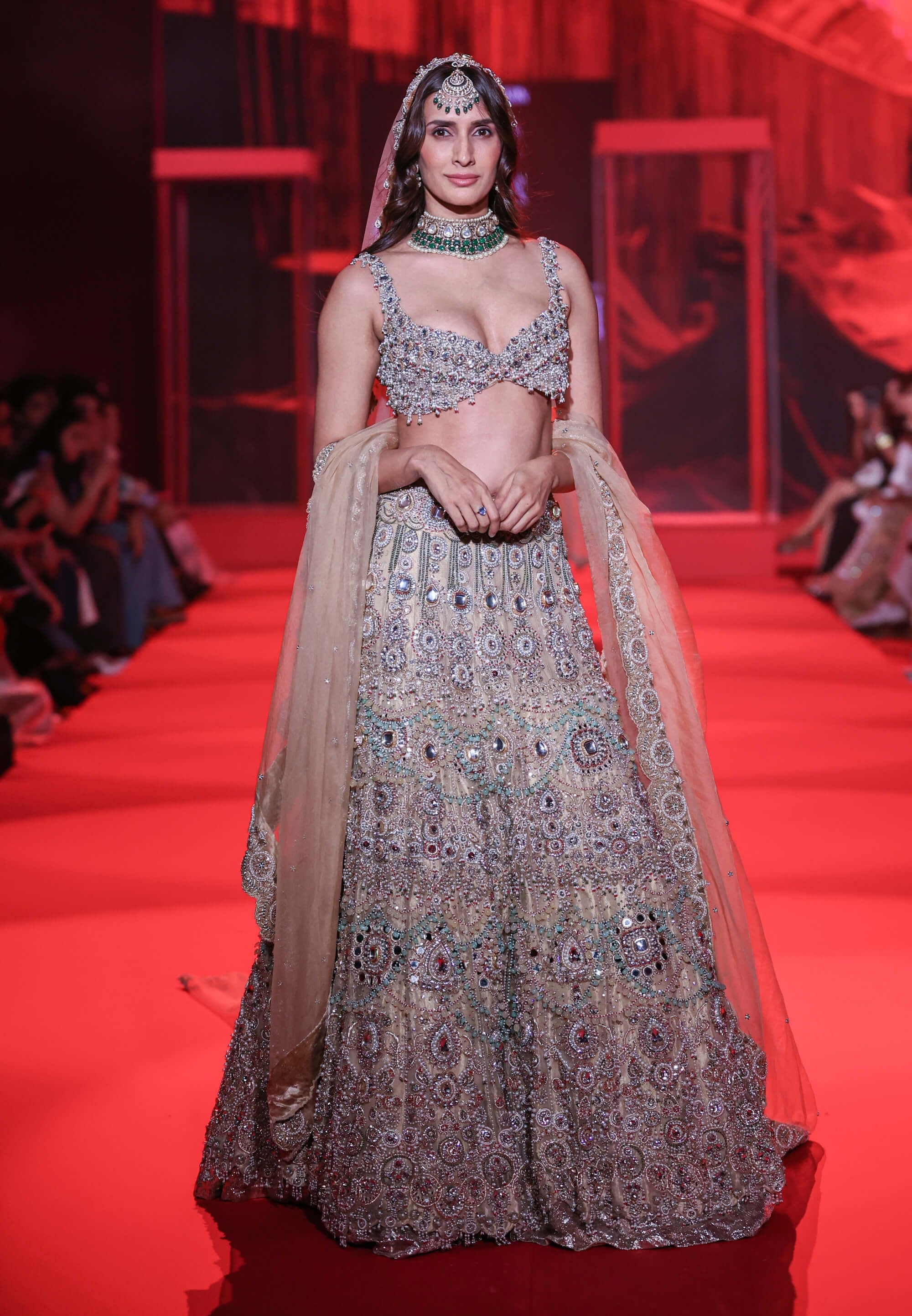 A vision in blush pink, this heavily embellished jadau lehenga gleams with mirror and stone detailing. The crossover strap blouse and sheer organza dupatta complete a look that is opulent yet fresh — made for the modern bride and her ceremonial moments.