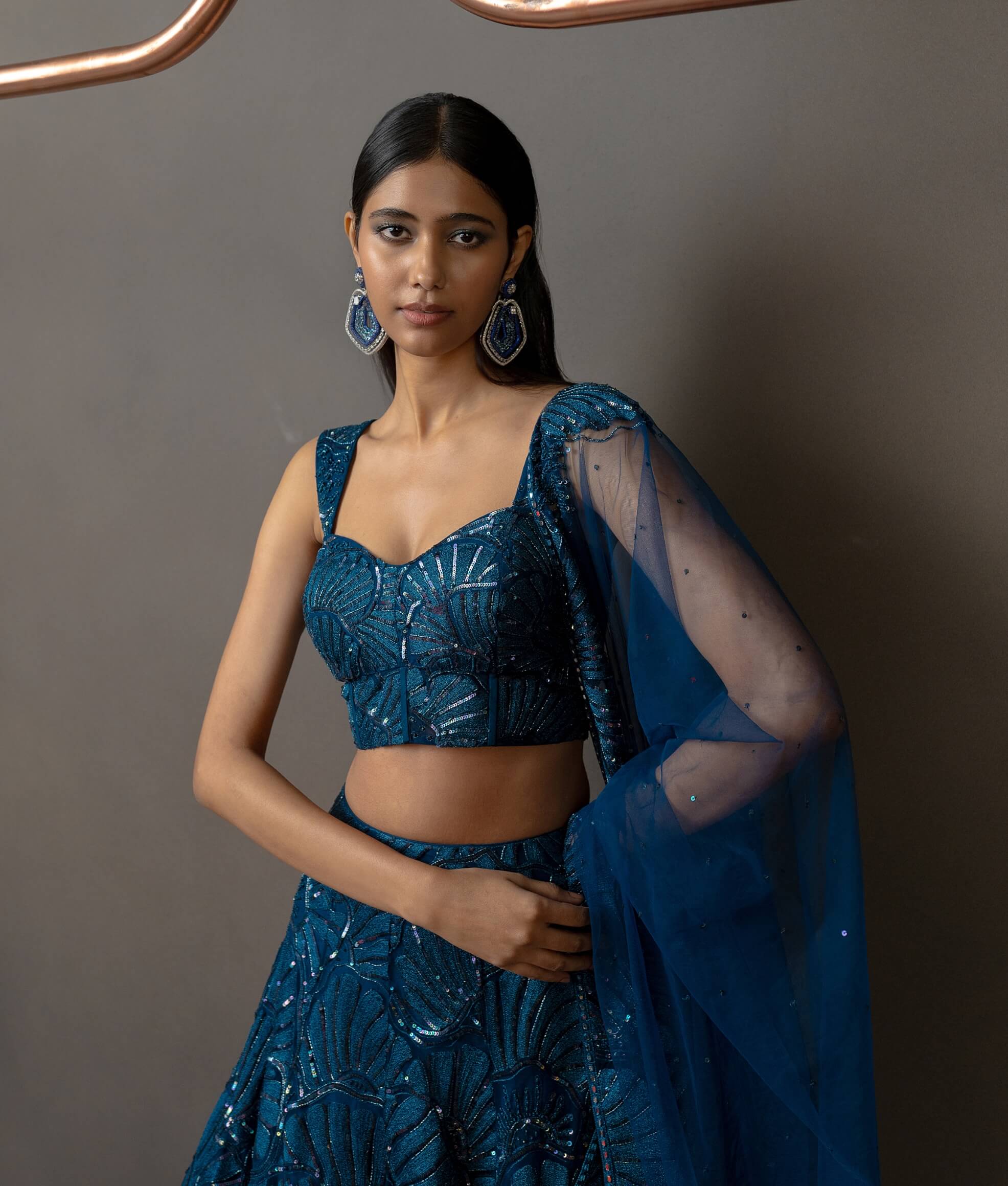 This coral‑toned lehenga, blouse, and dupatta ensemble blends tonal embroidery with soft glamour, creating a refined celebratory look. Ideal for receptions, wedding festivities, and destination functions that call for understated luxury.