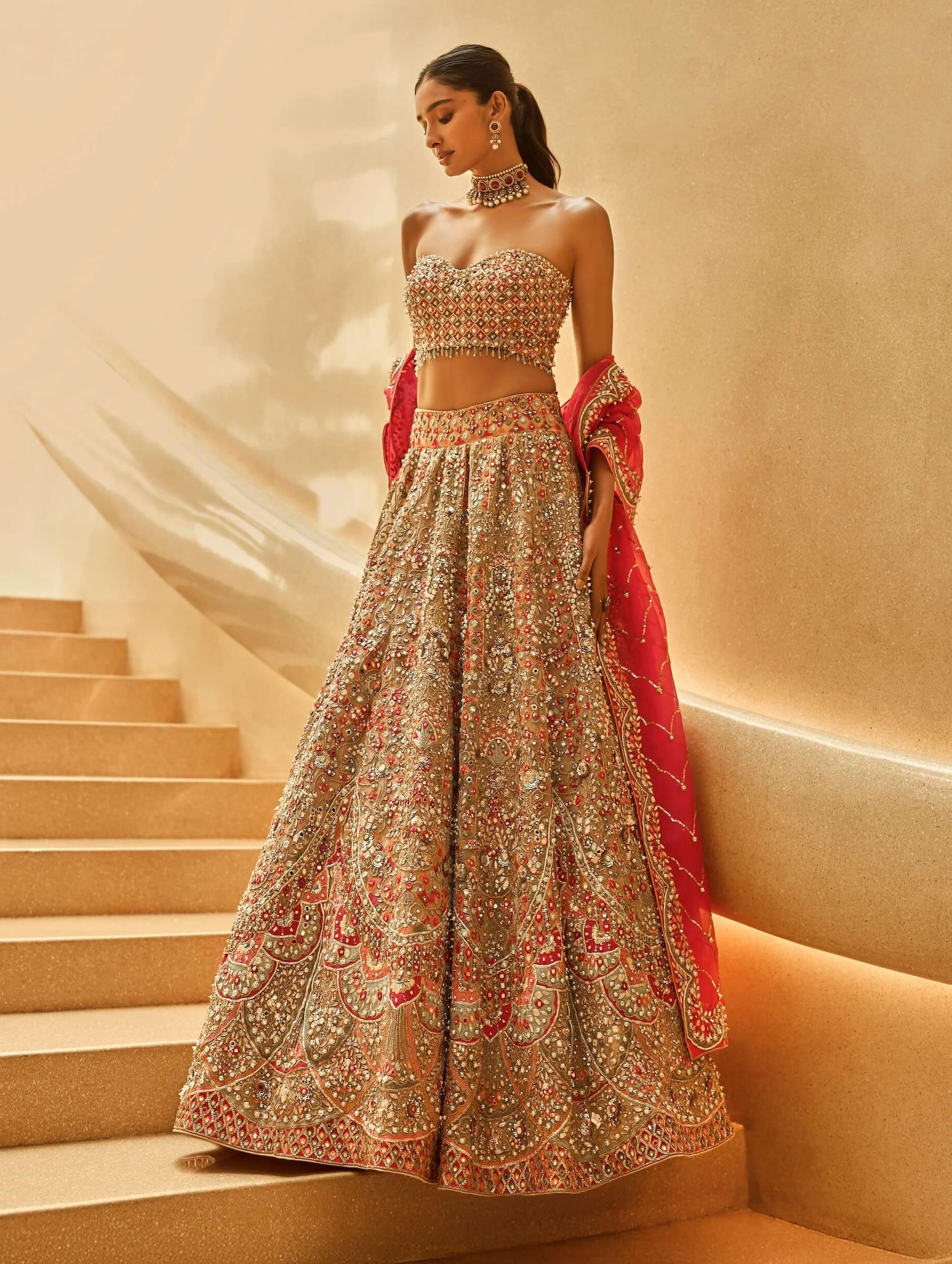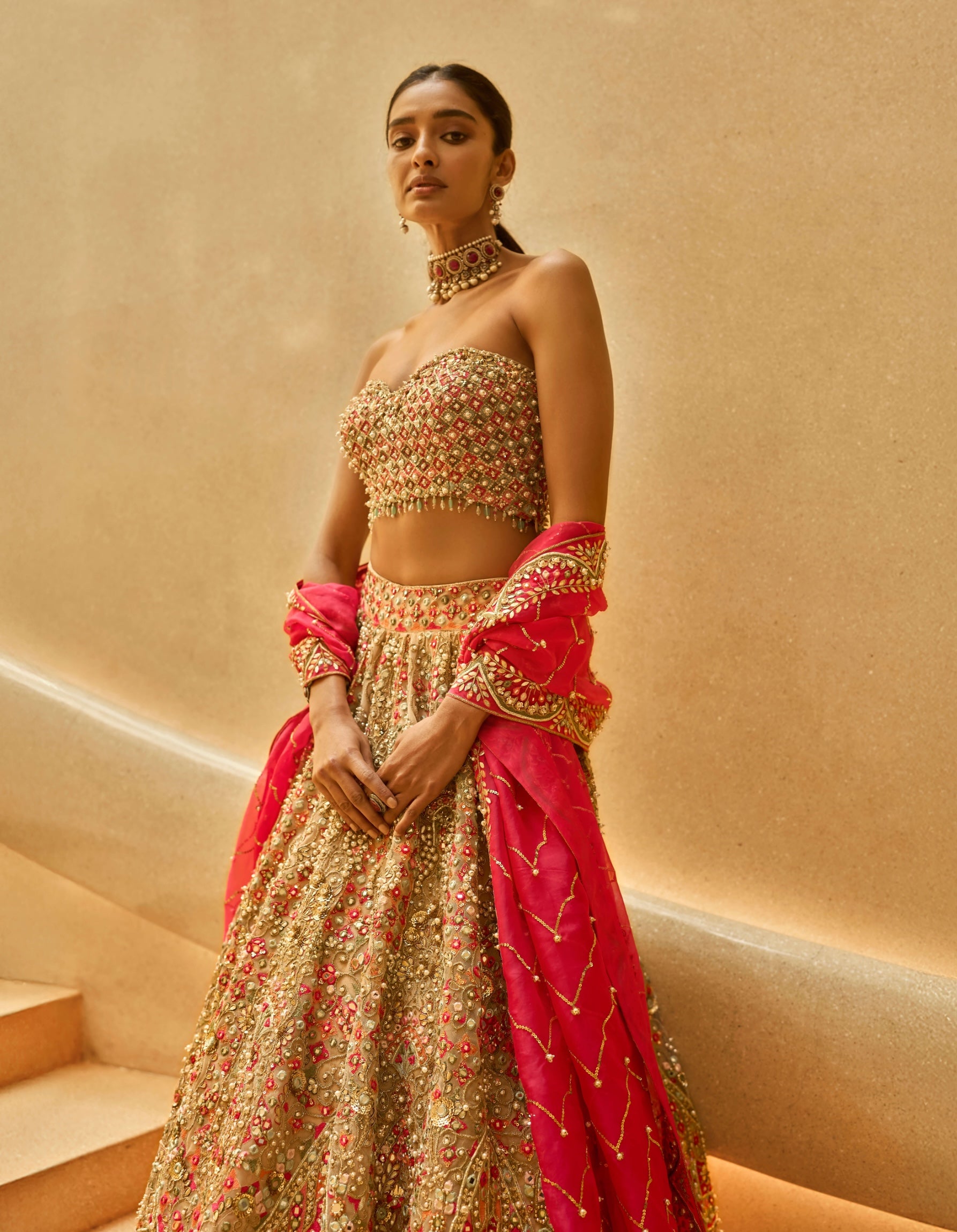 Defined by sculptural beauty, this scalloped lehenga blooms with festive artistry. A scalloped lehenga paired with a sculpted bustier and contrasting fuchsia dupatta, detailed with sequins, zardozi, and mirror work. Crafted in tulle and organza for festive charm.