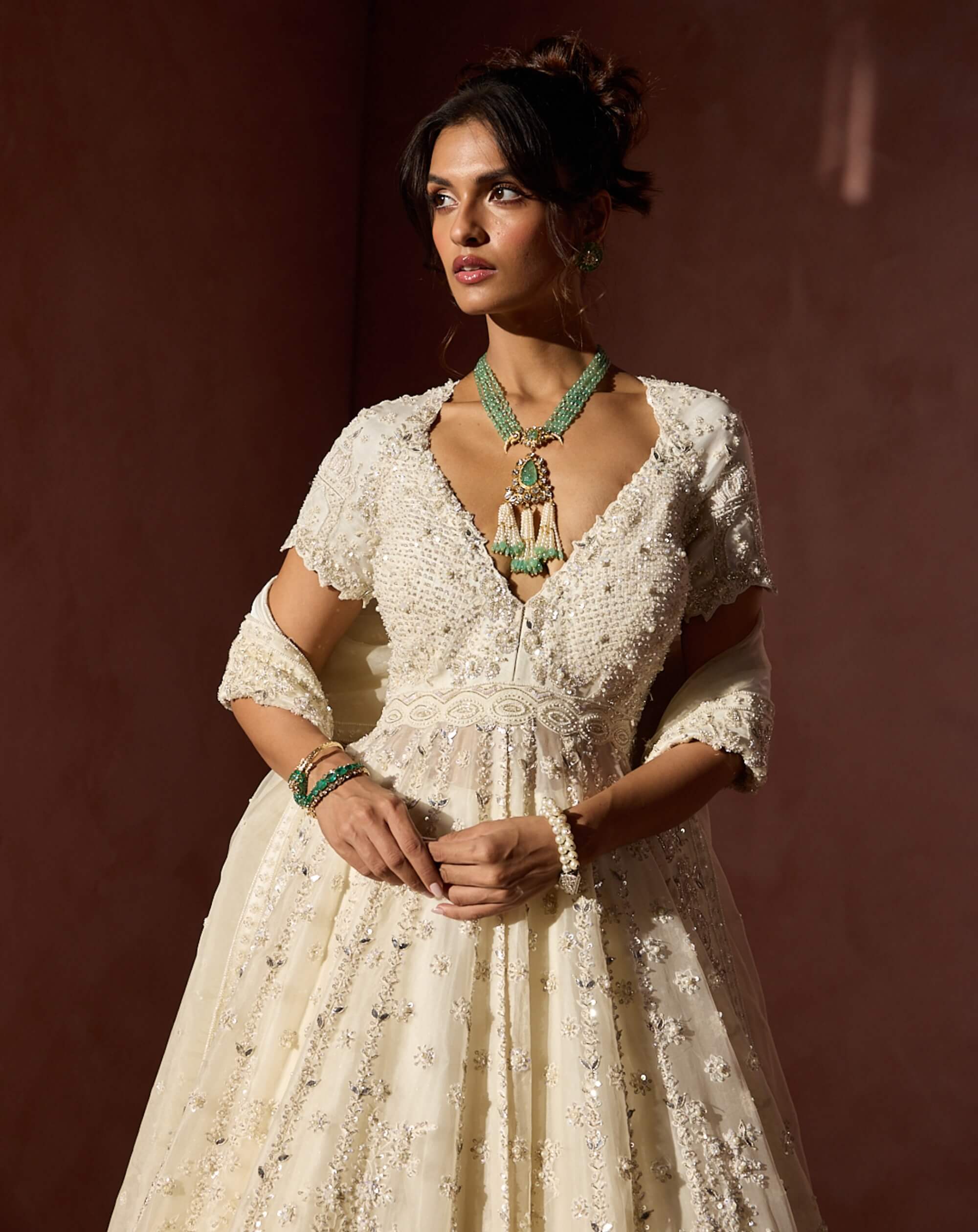 Effortless sophistication defines this off-white organza kalidar jacket and dupatta, paired with a shimmer lehenga adorned with self and silver embellishments. Ethereal and serene, it's a refined choice for evening weddings, engagement functions and elegant festive soirées.