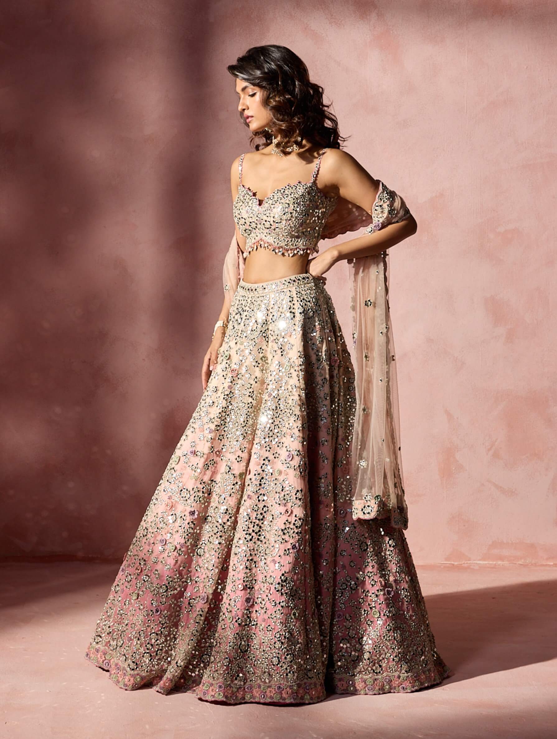 Draped in rose-pink ombre hues, this lehenga glows with kasab, mirrors, beads and sequins that create a festive yet refined shimmer. The soft transitions and detailed dupatta make it ideal for mehendi ceremonies, daytime weddings and joyous festive gatherings.