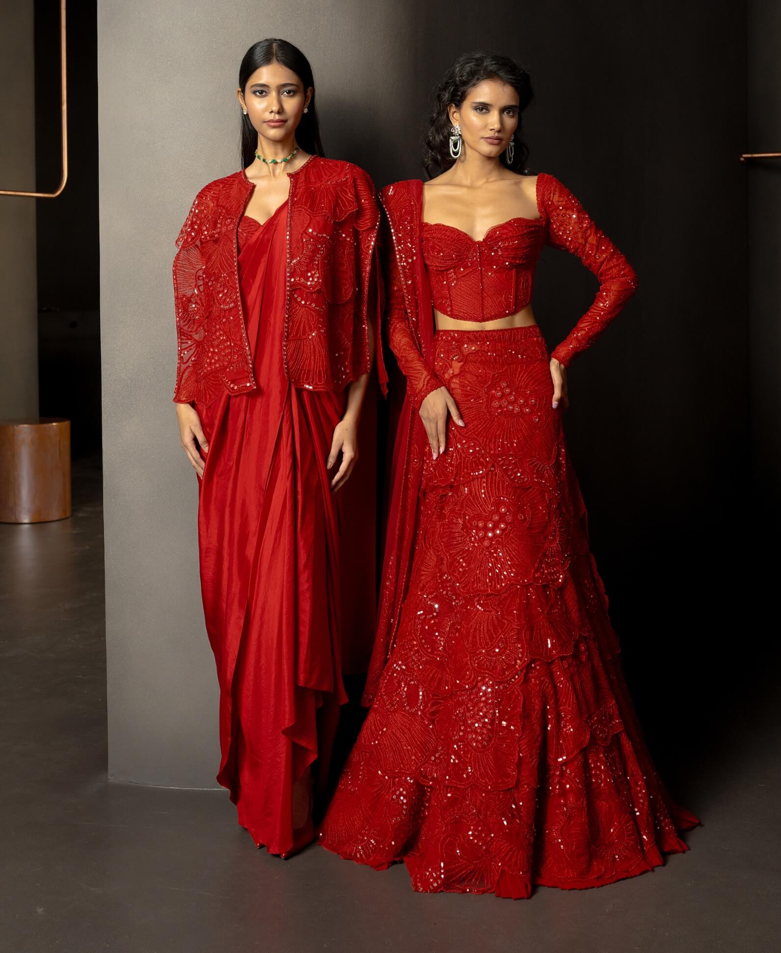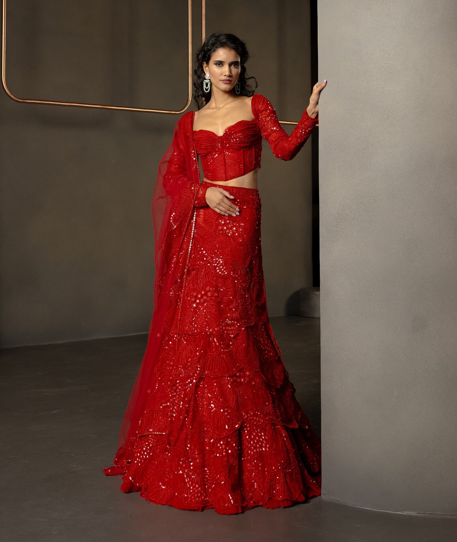 A study in modern coral romance crafted for quiet confidence, this embroidered layered skirt pairs with a full-sleeved corset and sheer dupatta to deliver sculpted softness. The tonal detailing feels elevated yet contemporary, perfect for engagement soirées, cocktail nights, or intimate festive gatherings where refined elegance stands out.