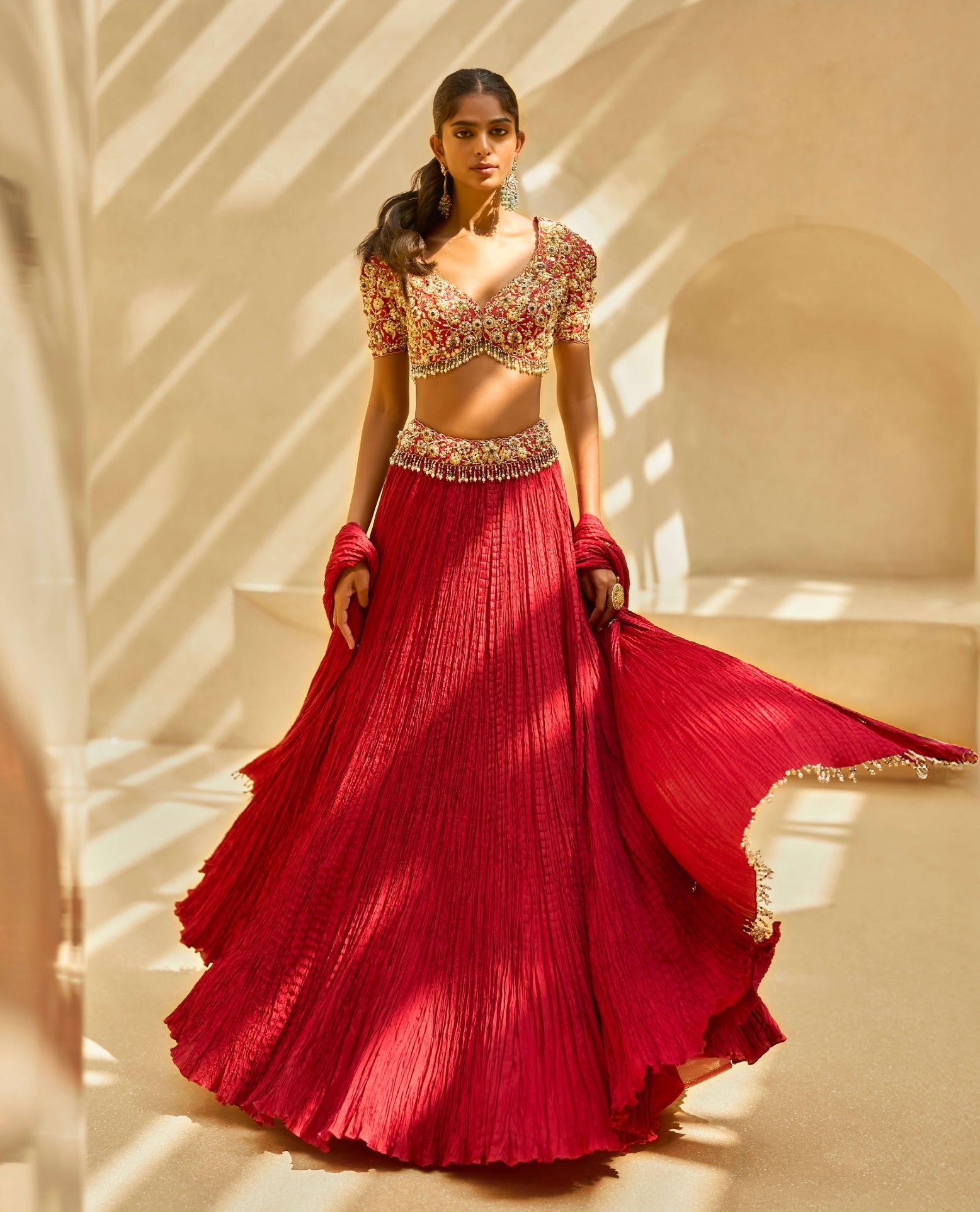 Infused with ruby intensity, this crushed lehenga offers dramatic flair and movement. A ruby crushed lehenga set in habutai silk with a textured skirt and heavily embroidered choli featuring stones, pearls, sequins, mirror, and beadwork—perfect for sangeets.