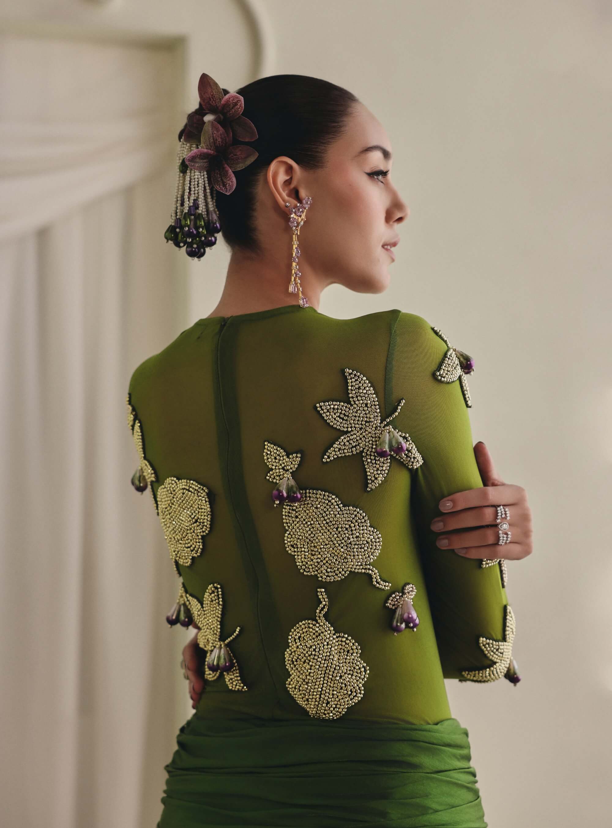Sculpted yet soft, this sheer olive bodysuit and draped skirt ensemble exudes ethereal sensuality. Gold and lilac appliqué embroidery adds dimension, creating a balance of structure and movement for evening elegance.