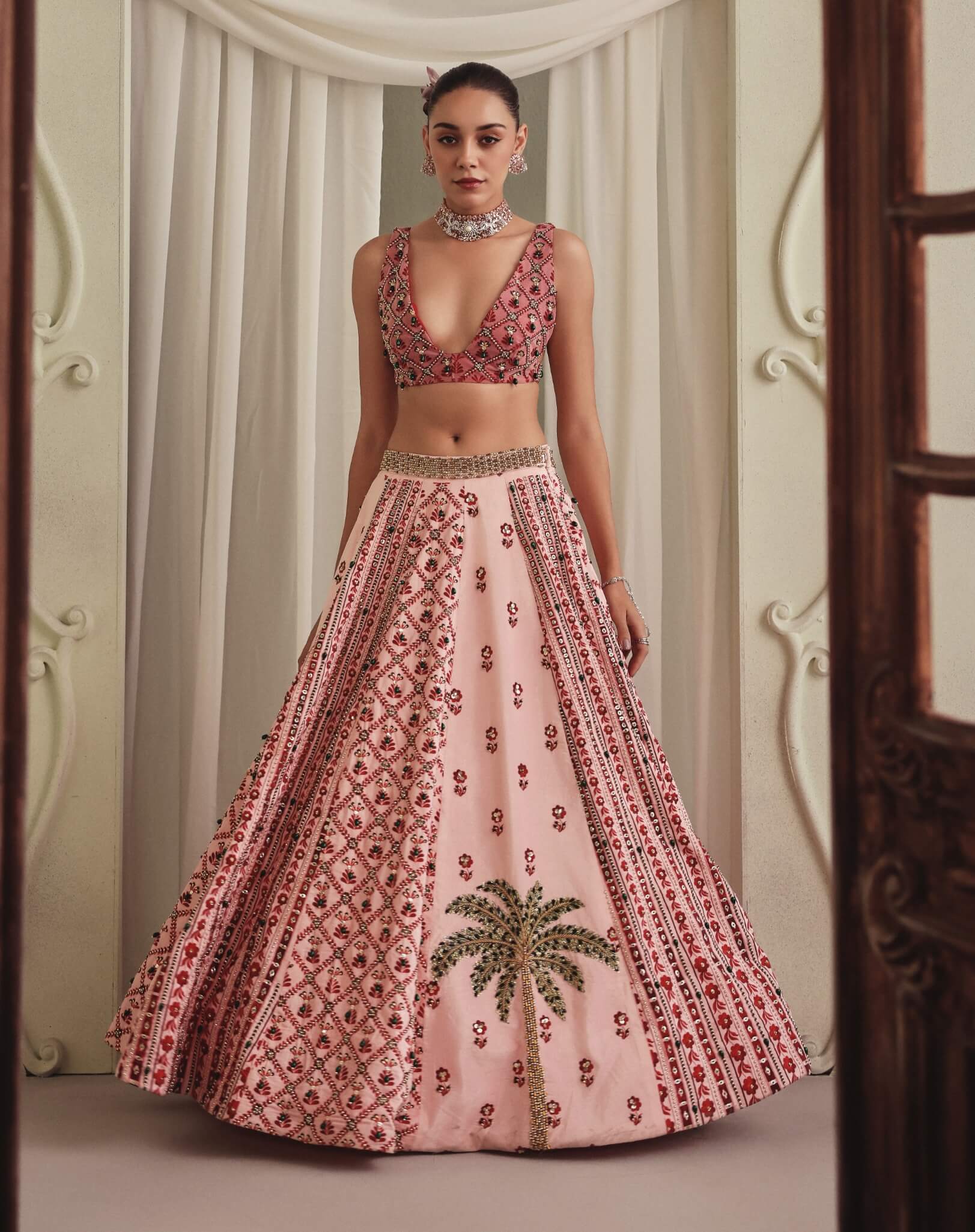 Velvet dreams reimagined — this blush lehenga features signature coconut tree motifs in fine embroidery. Paired with a golden-beaded silk blouse, it strikes the perfect balance between heritage artistry and contemporary charm.