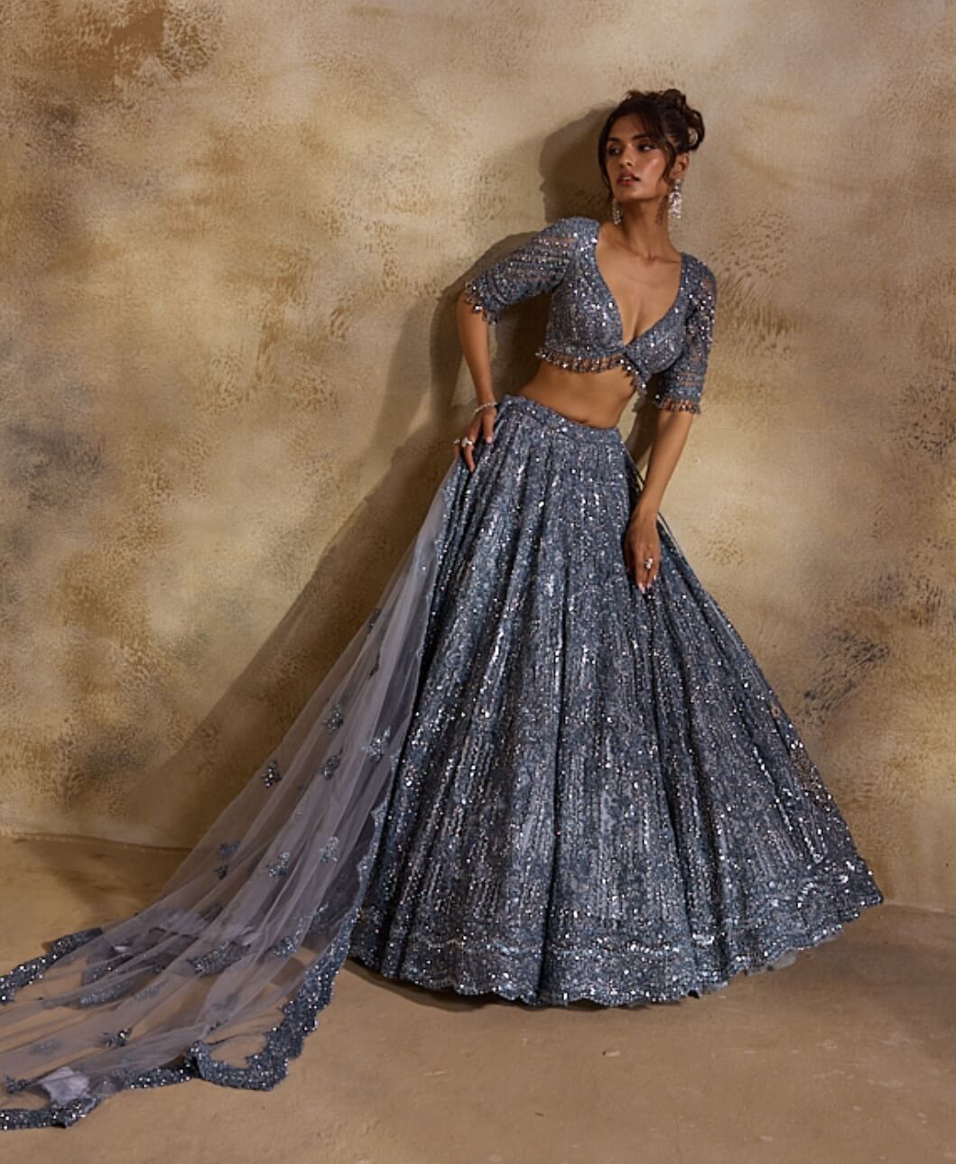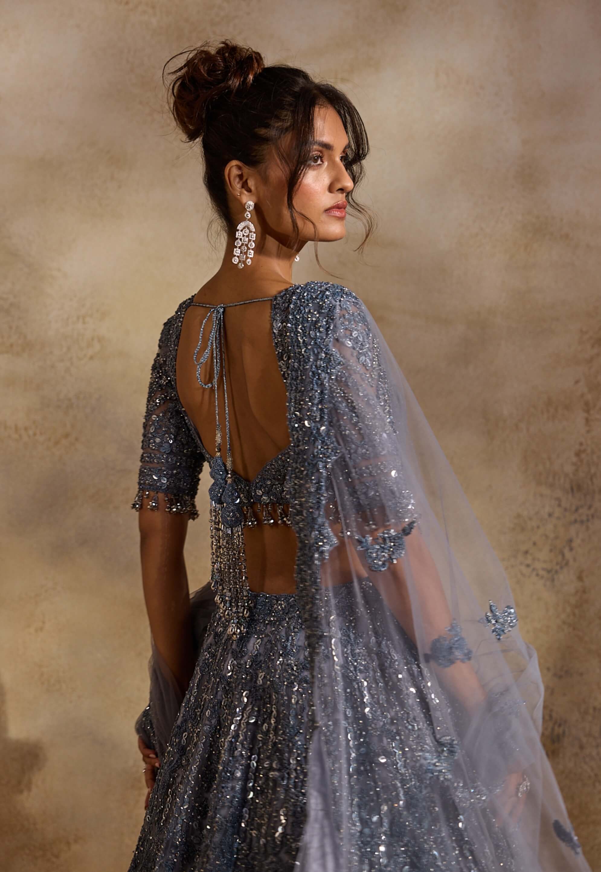 A soft symphony of stone-gray sophistication unfolds in this tulle lehenga, enriched with tonal dori, metallic beads and crystals for a modern, understated shimmer. Balanced with a beautifully embellished dupatta, this ensemble suits engagements, intimate weddings and chic evening functions.