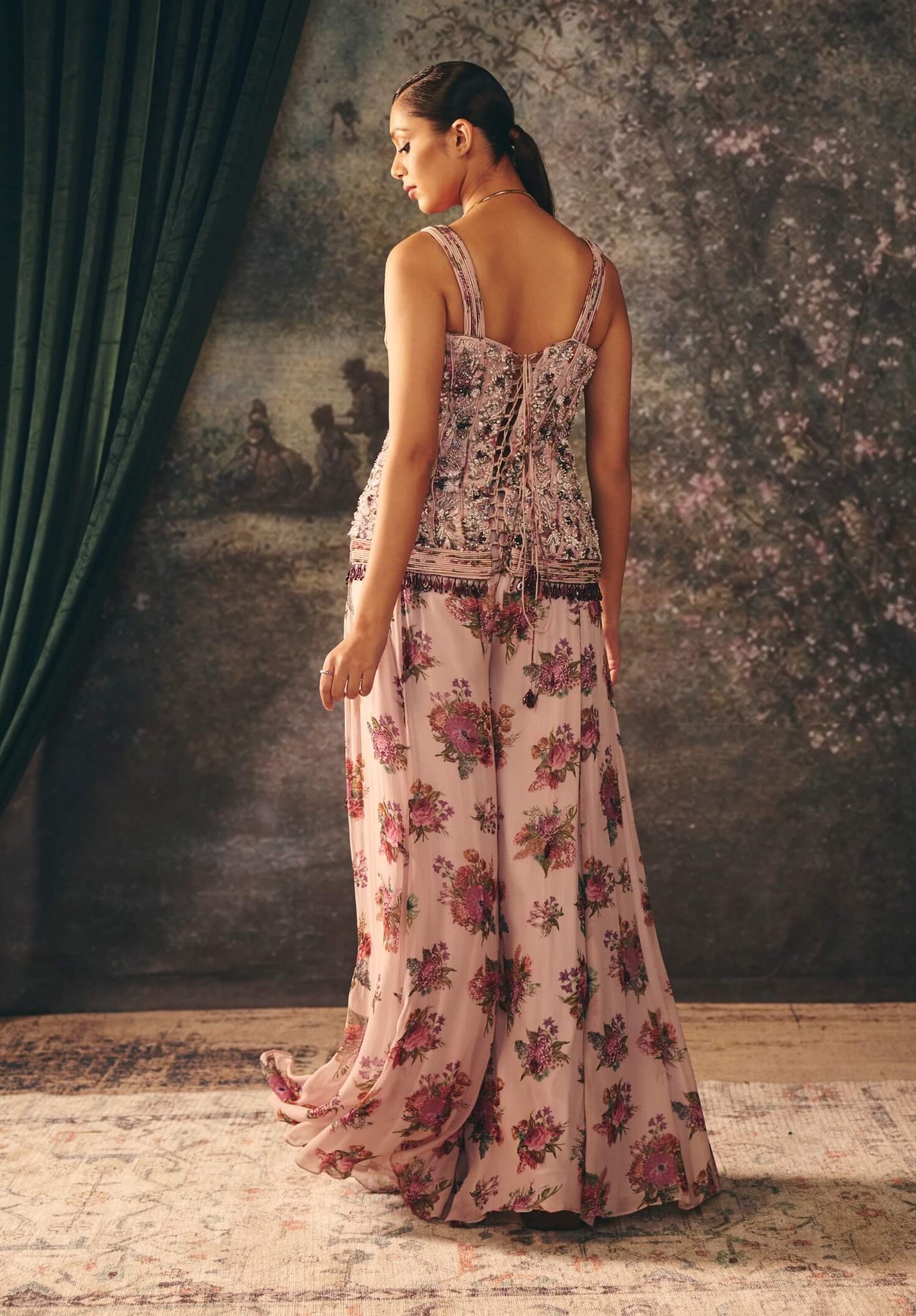Feminine and luminous, this pink ensemble features an embroidered corset paired with a flowing sharara. Crafted in chiffon and satin, the silhouette moves with effortless grace. Delicate embroidery adds a refined festive glow. Perfect for mehendi ceremonies, sangeet celebrations, and wedding festivities.