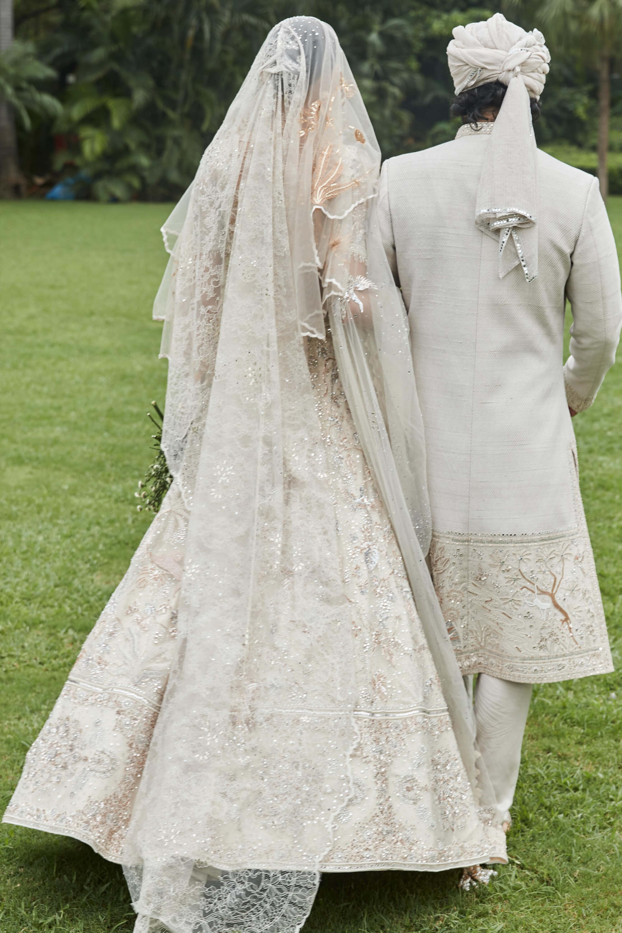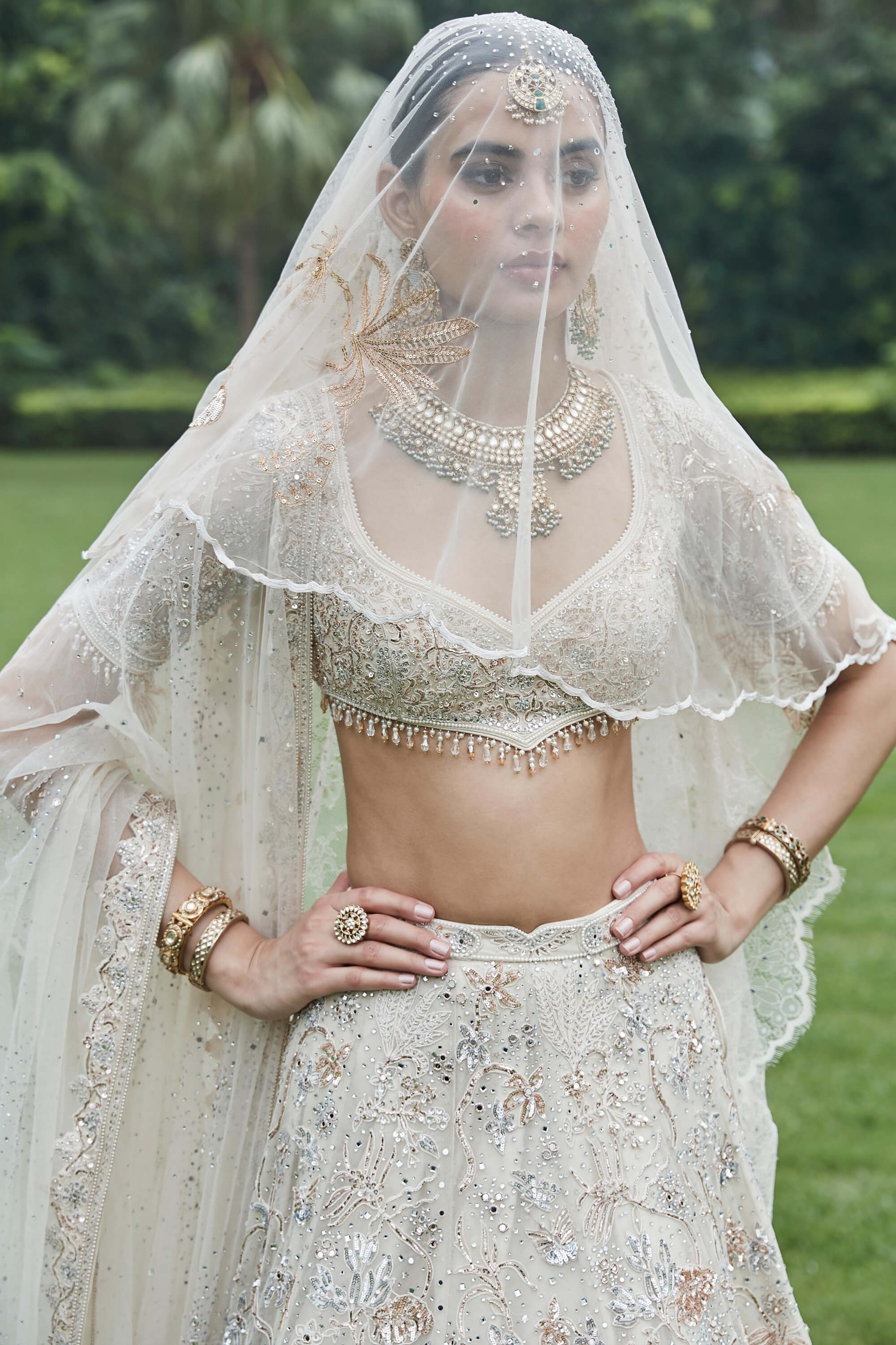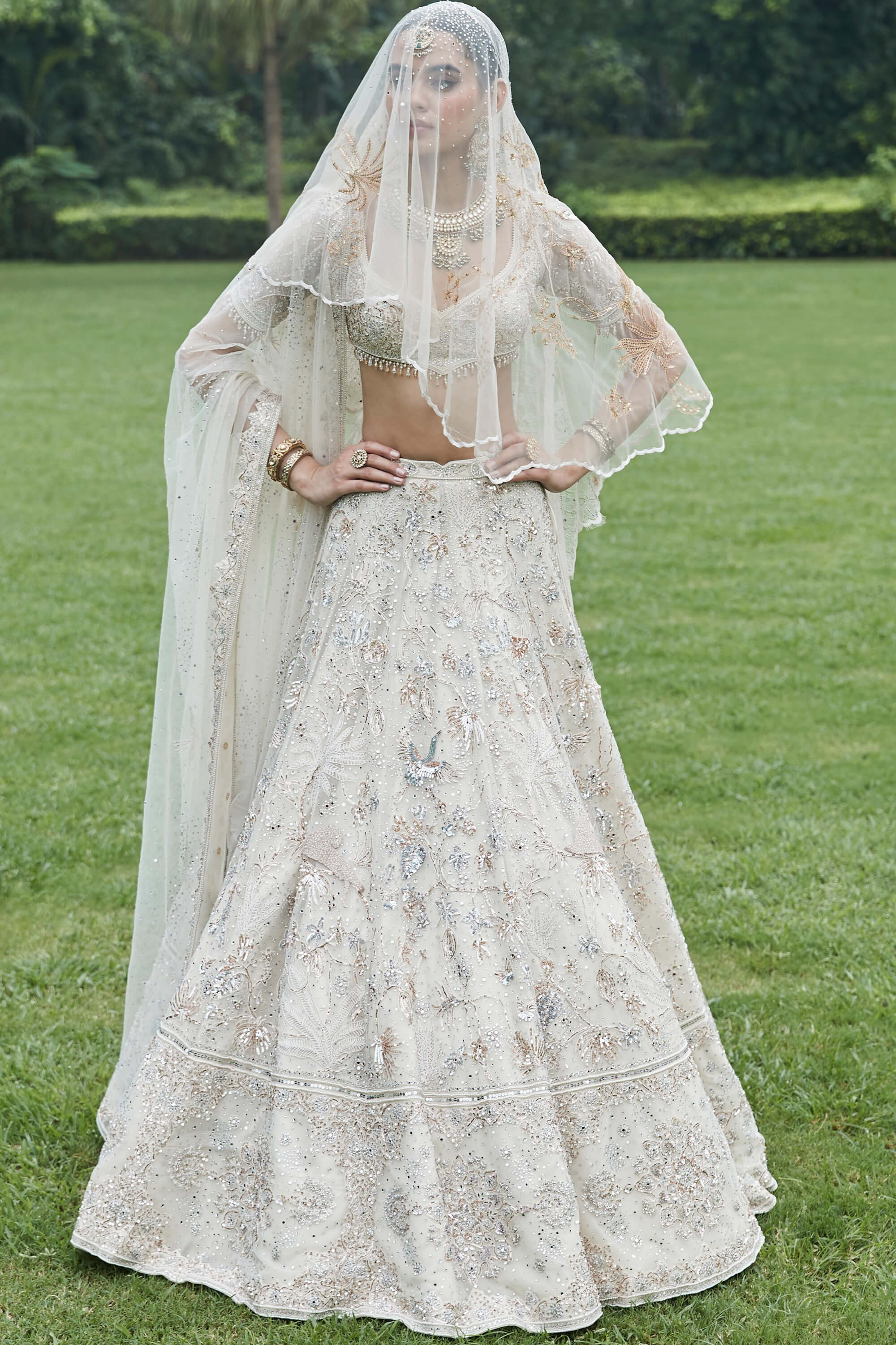 Inspired by the untamed beauty of the African savannah, this ivory lehenga reflects the grace and power of the cheetah through intricate artistry. Crafted on delicate tulle, it is adorned with refined resham aari and hand zardozi work that adds depth and subtle shimmer. The lightweight silhouette ensures effortless movement, making it ideal for wedding ceremonies and grand bridal celebrations. Paired with a regal veil, this ensemble brings together couture craftsmanship and timeless bridal elegance.