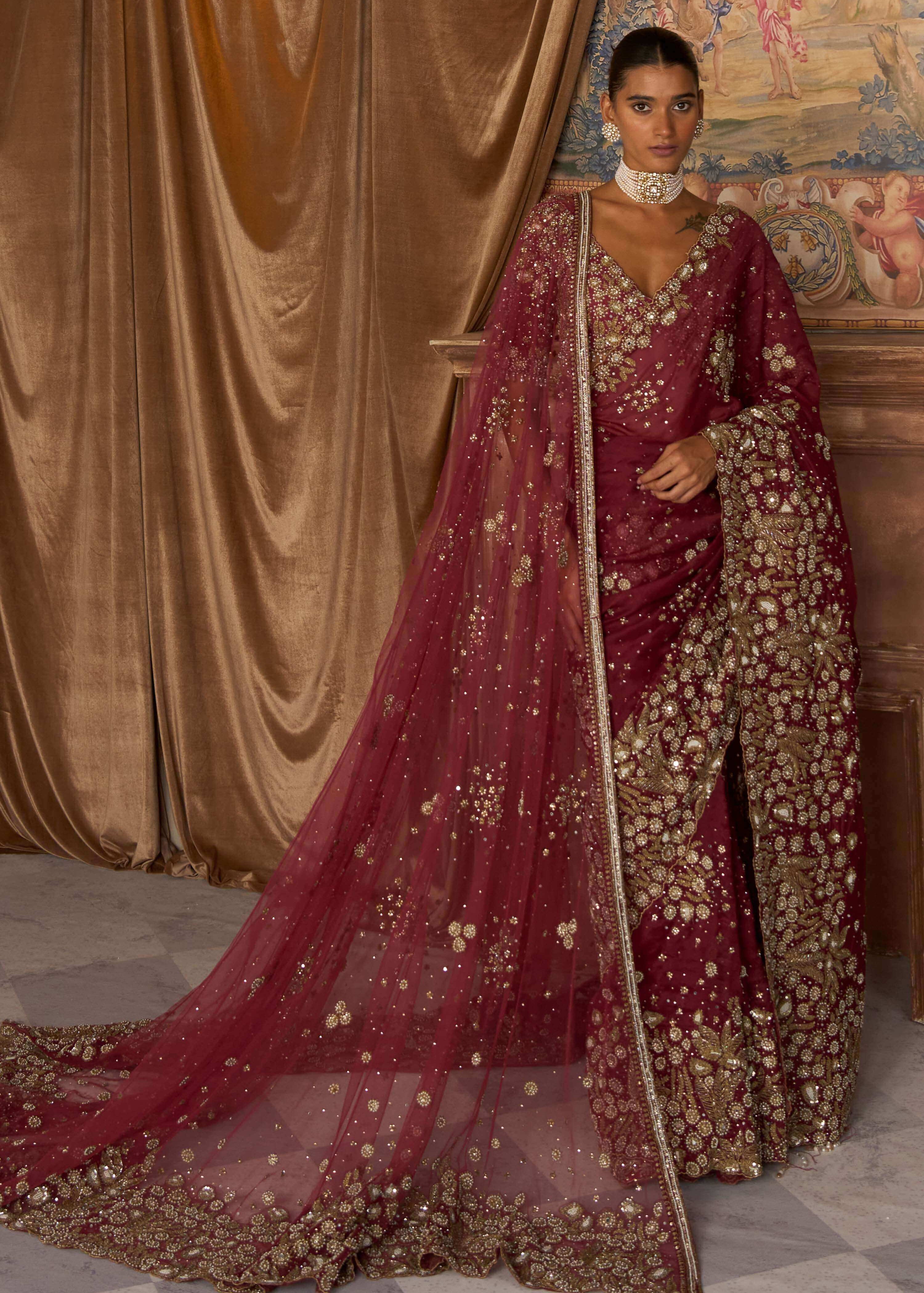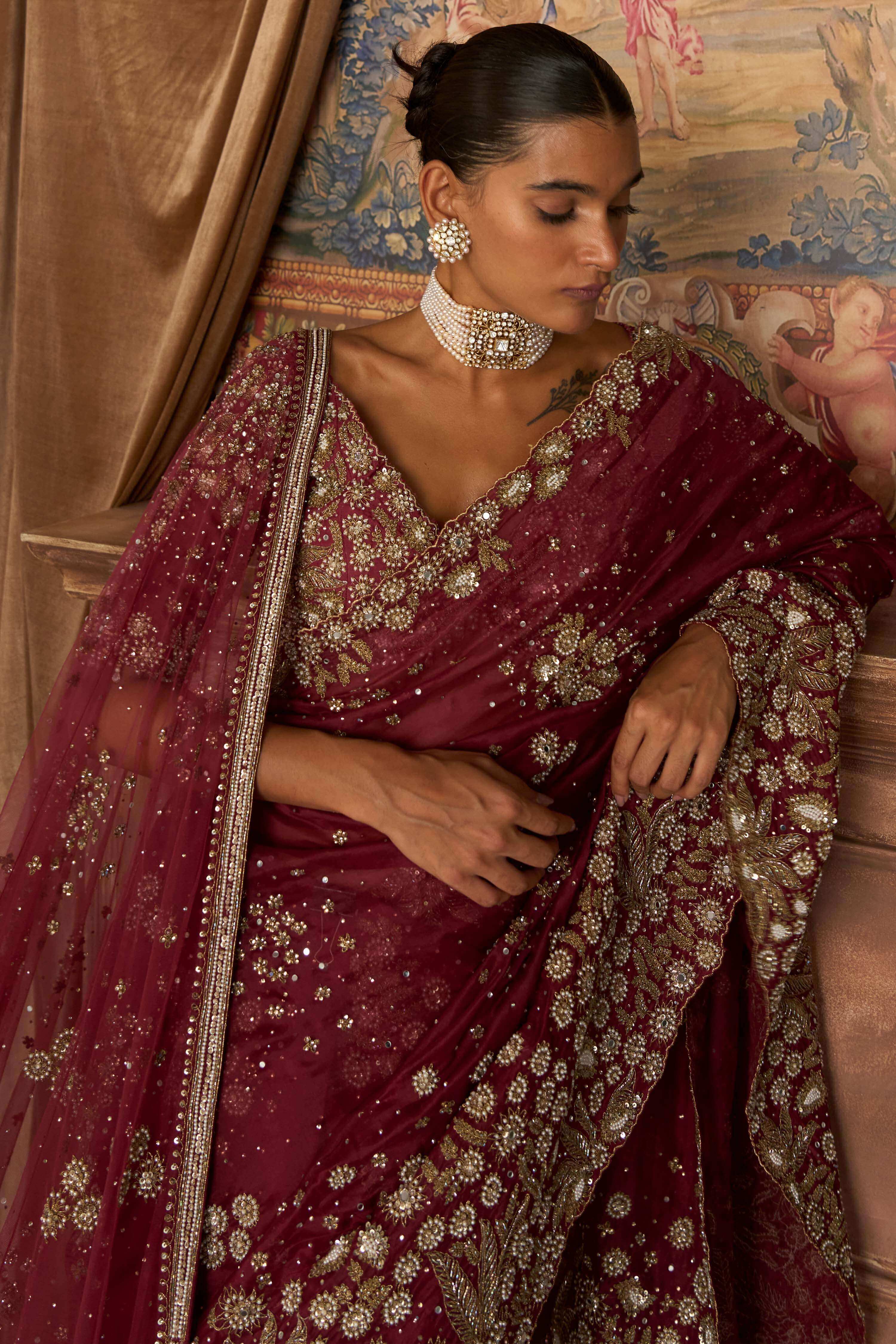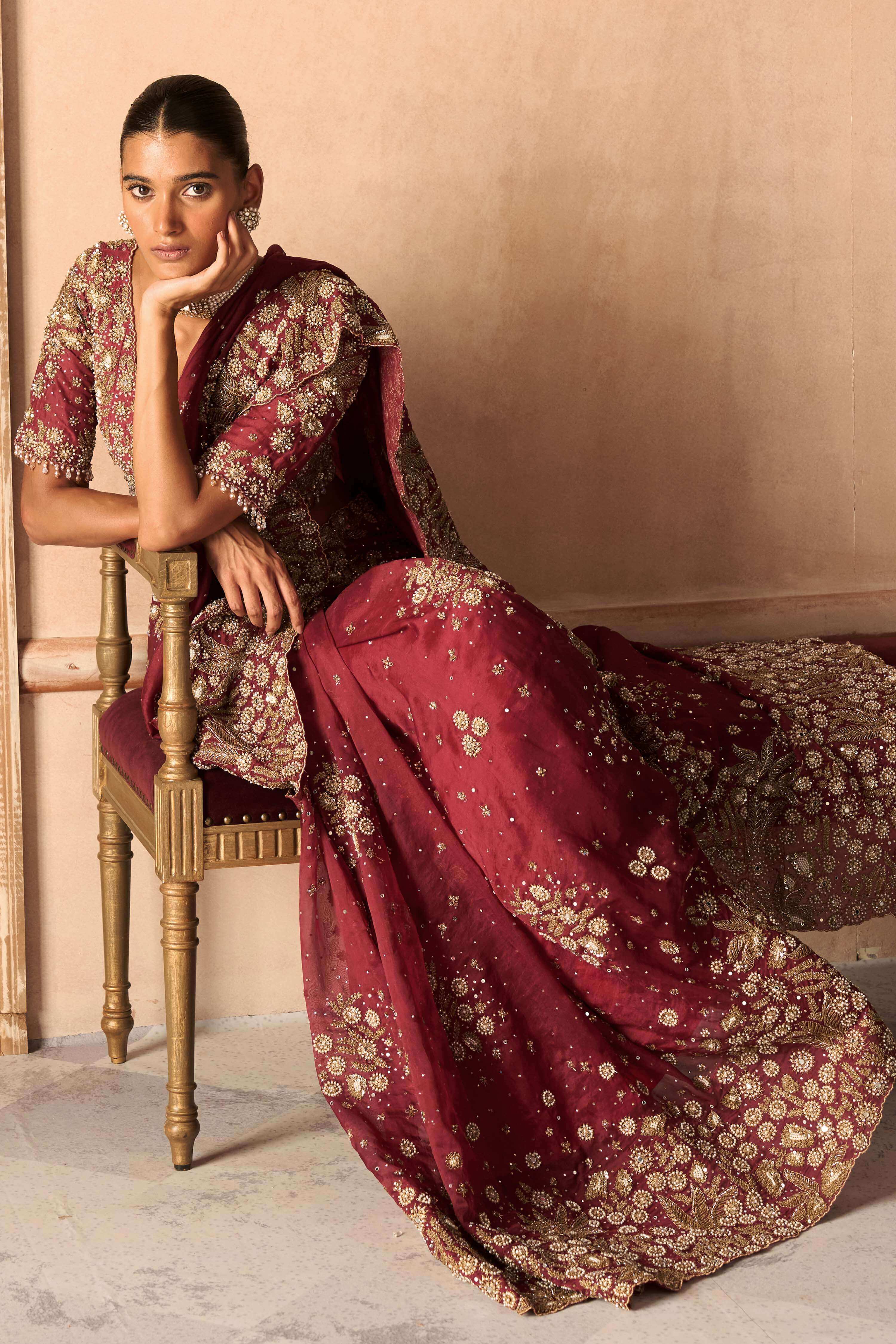 A timeless draped statement, this scarlet silk organza sari is adorned with antique gold kirandori, vintage zardozi and delicate crystal work that adds refined sparkle. Paired with a soft tulle veil, the ensemble balances elegance with modern grandeur. Ideal for cocktail evenings, receptions and celebratory occasions.