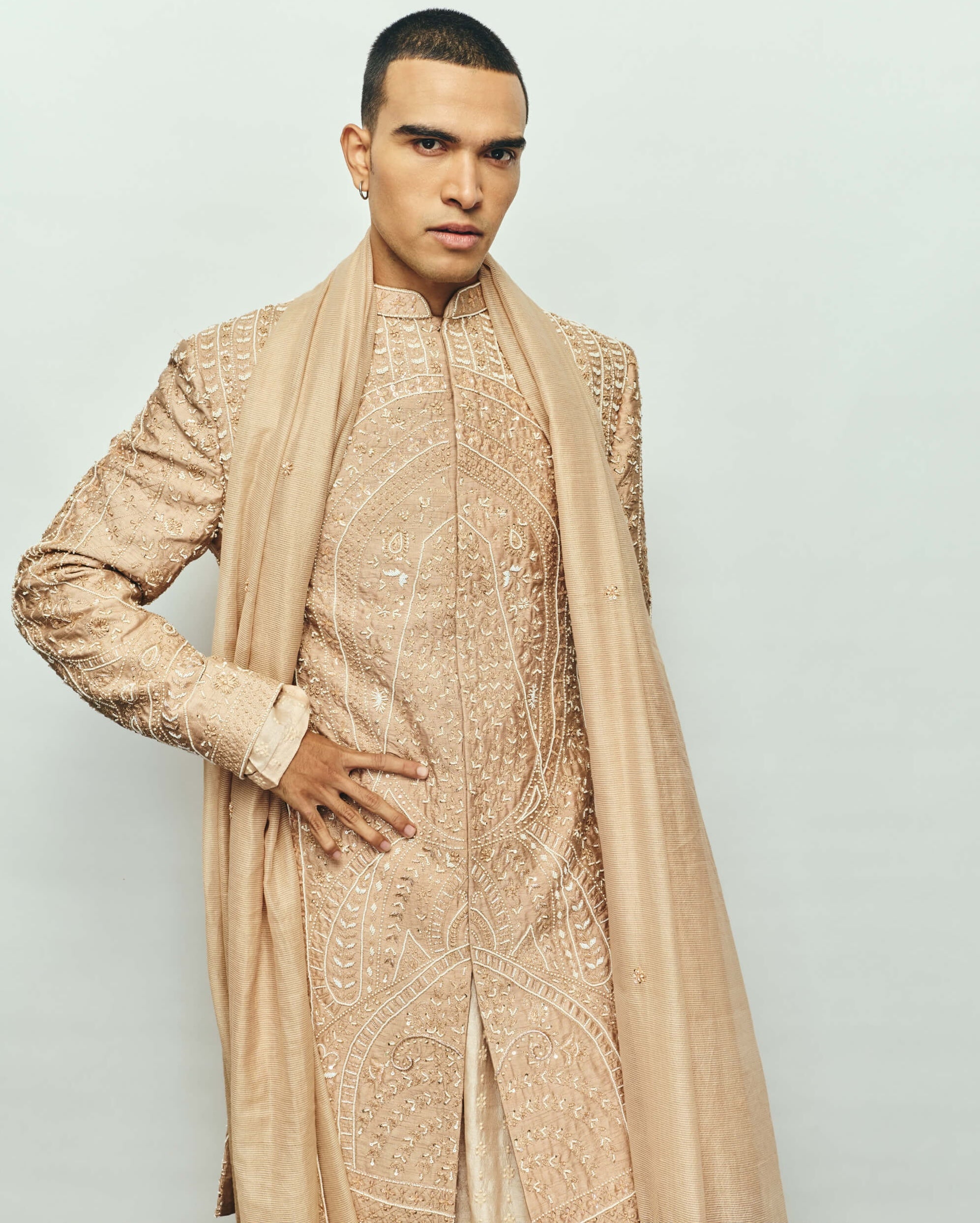 A regal caramel beige sherwani adorned with rich zardosi poat and intricate hand embroidery. Paired with an anarkali kurta featuring same-tone threadwork and peacock motifs embroidered at the back.