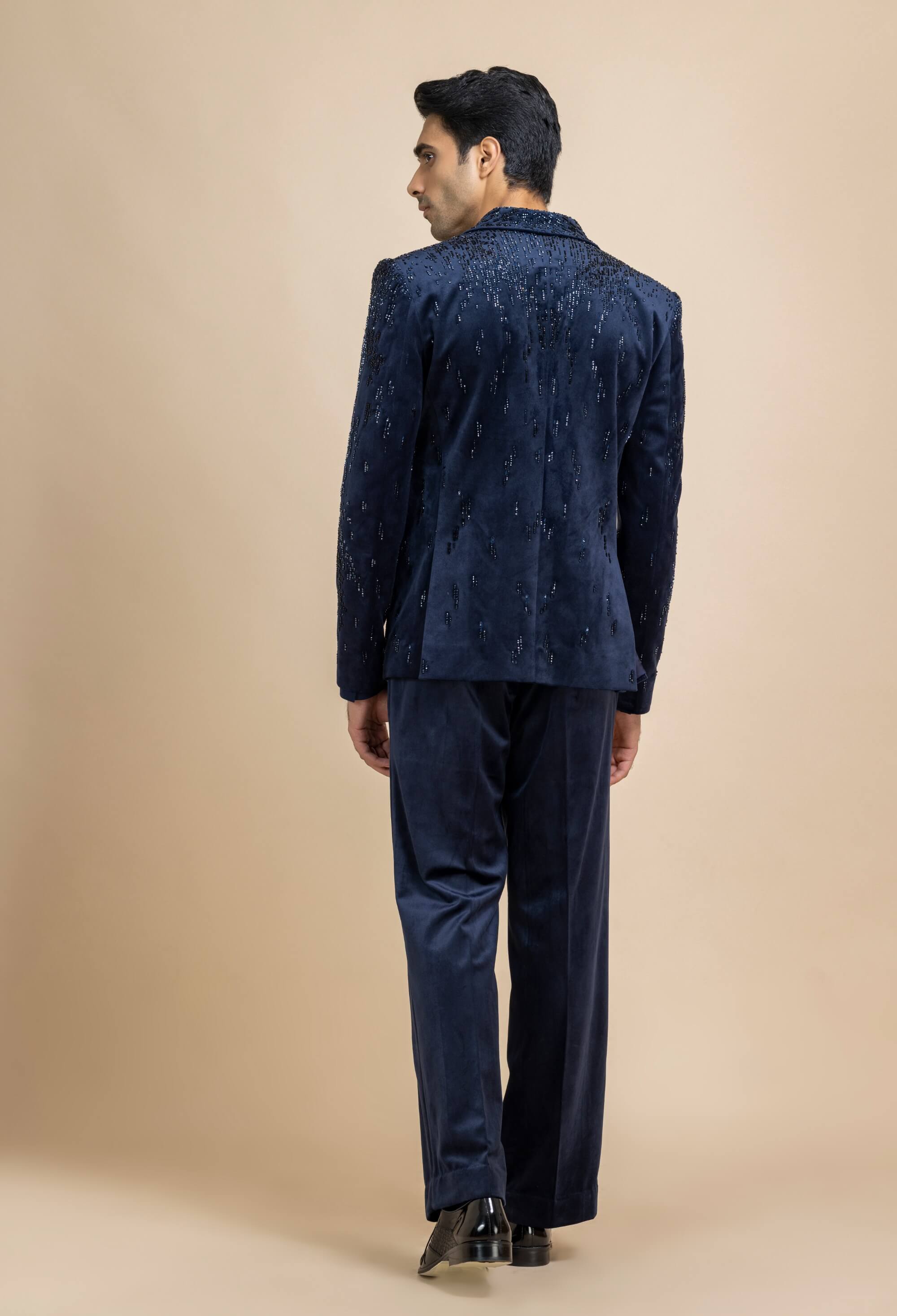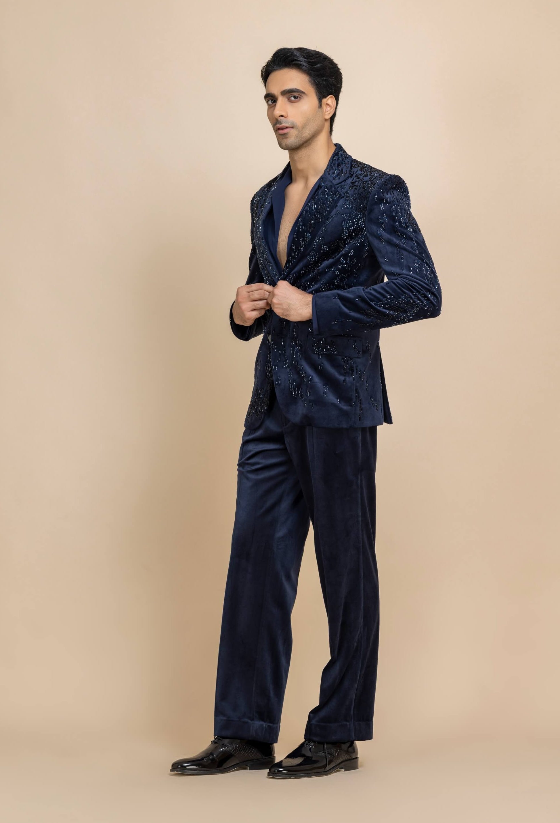 Commanding and contemporary, this ink blue velvet tuxedo set is tailored to perfection for a sharp silhouette. The plush velvet is balanced with a lycra crepe V-neck shirt, creating a striking contrast. Rich tones and precise tailoring define its refined appeal. Ideal for evening receptions, formal gatherings, and celebratory occasions.