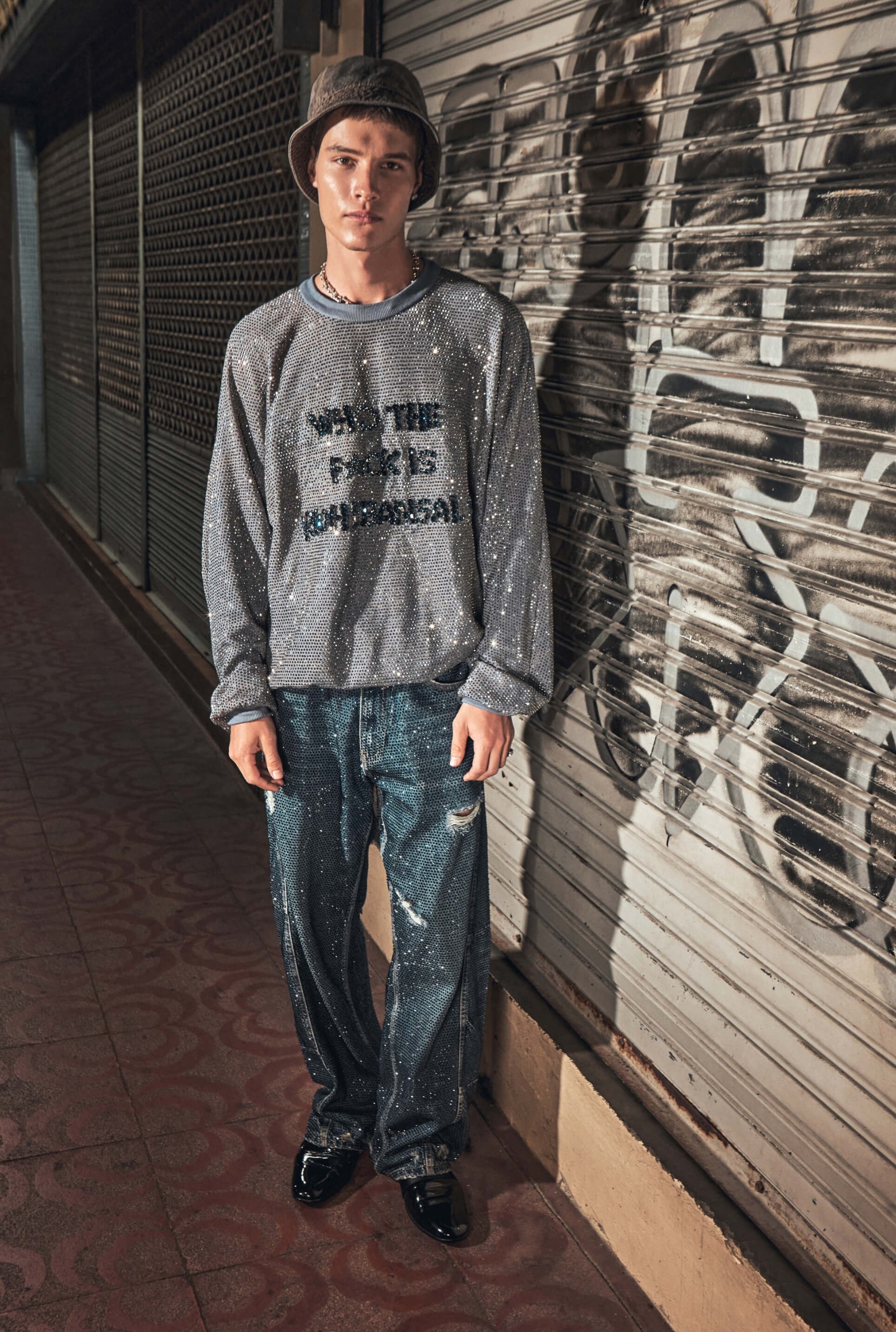 This duo pairs a luxe dark grey crystal sweatshirt in Roama fabric with classic dark blue jeans. It’s an effortless way to bring a touch of sparkle to your everyday casual rotation.