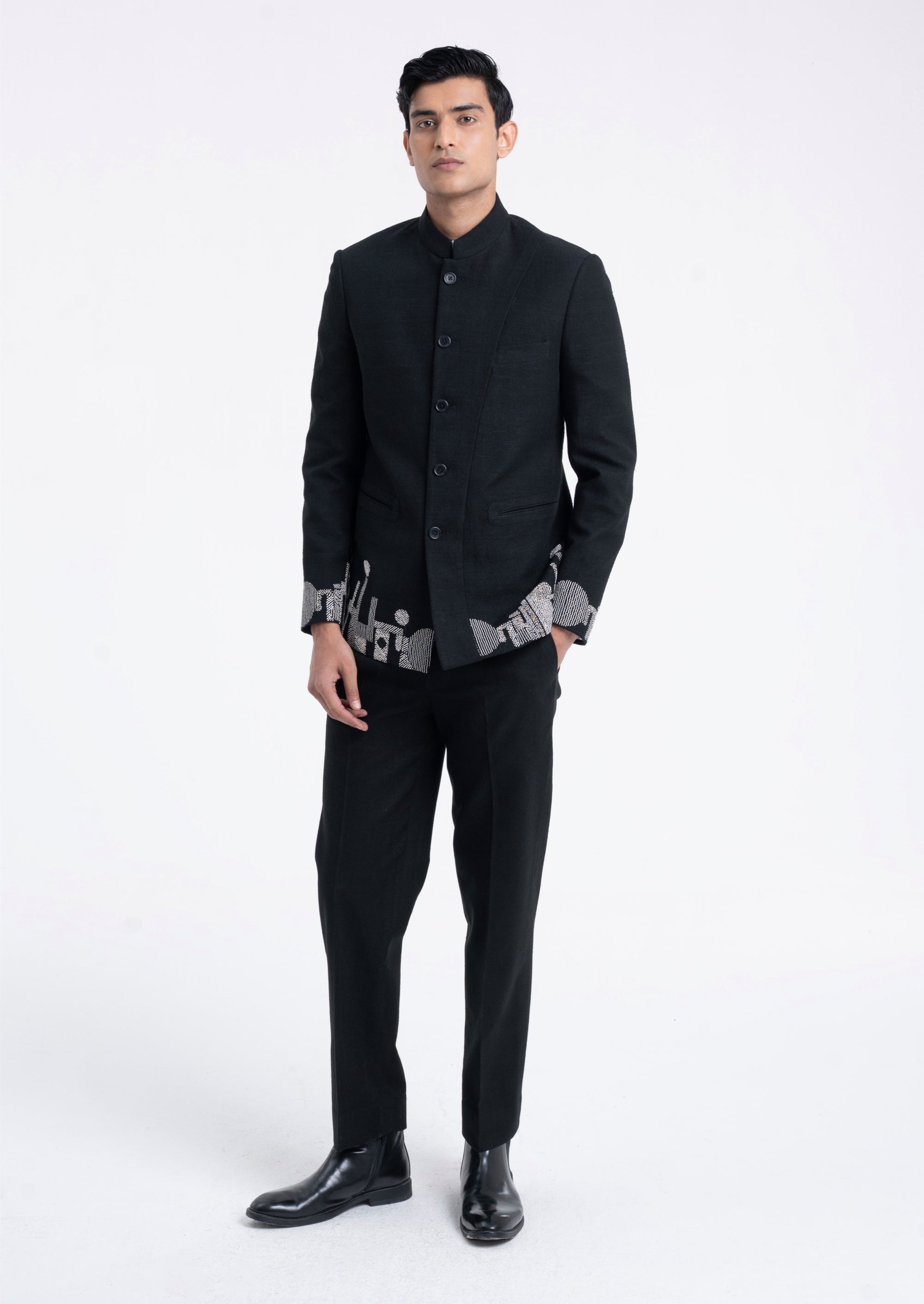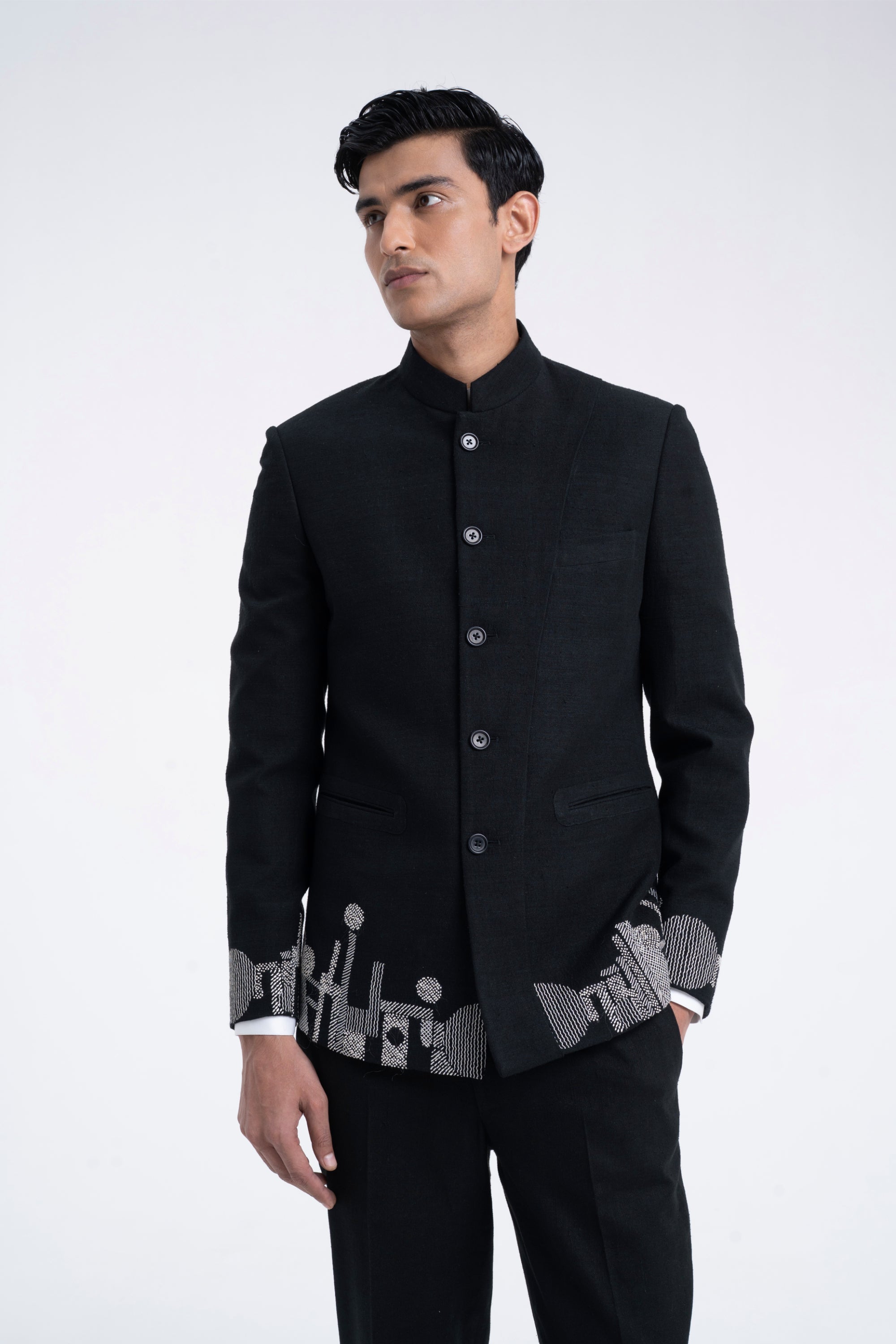 Contemporary artistry meets timeless form in this black silk bandhgala. A delicate border embroidery creates a skyline motif, lending a dynamic yet minimal aesthetic. Designed for upscale receptions, evening dinners, and cultural celebrations that call for quiet sophistication.