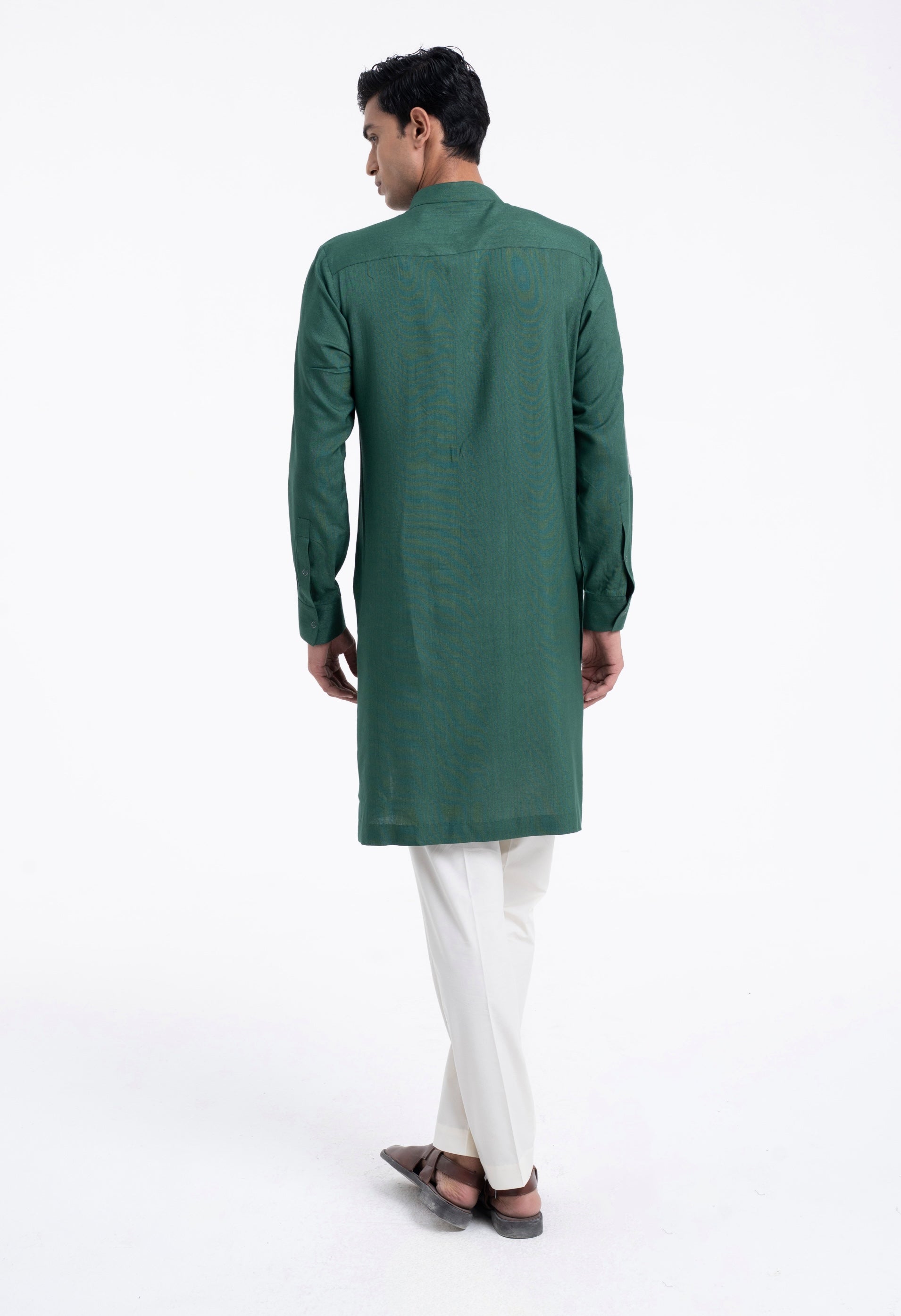 Sophisticated and rooted in tradition, this forest green embroidered kurta set crafted from cotton silk features a contemporary angled placket. Its refined embroidery makes it perfect for festive gatherings and evening ceremonies.