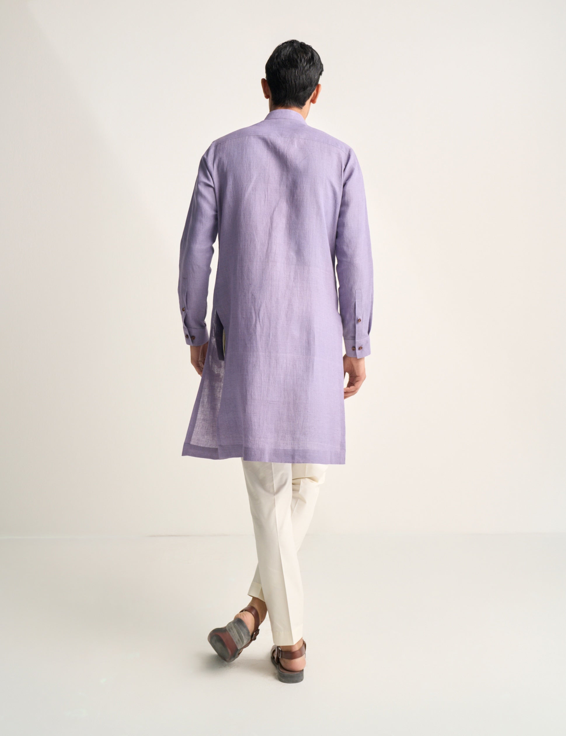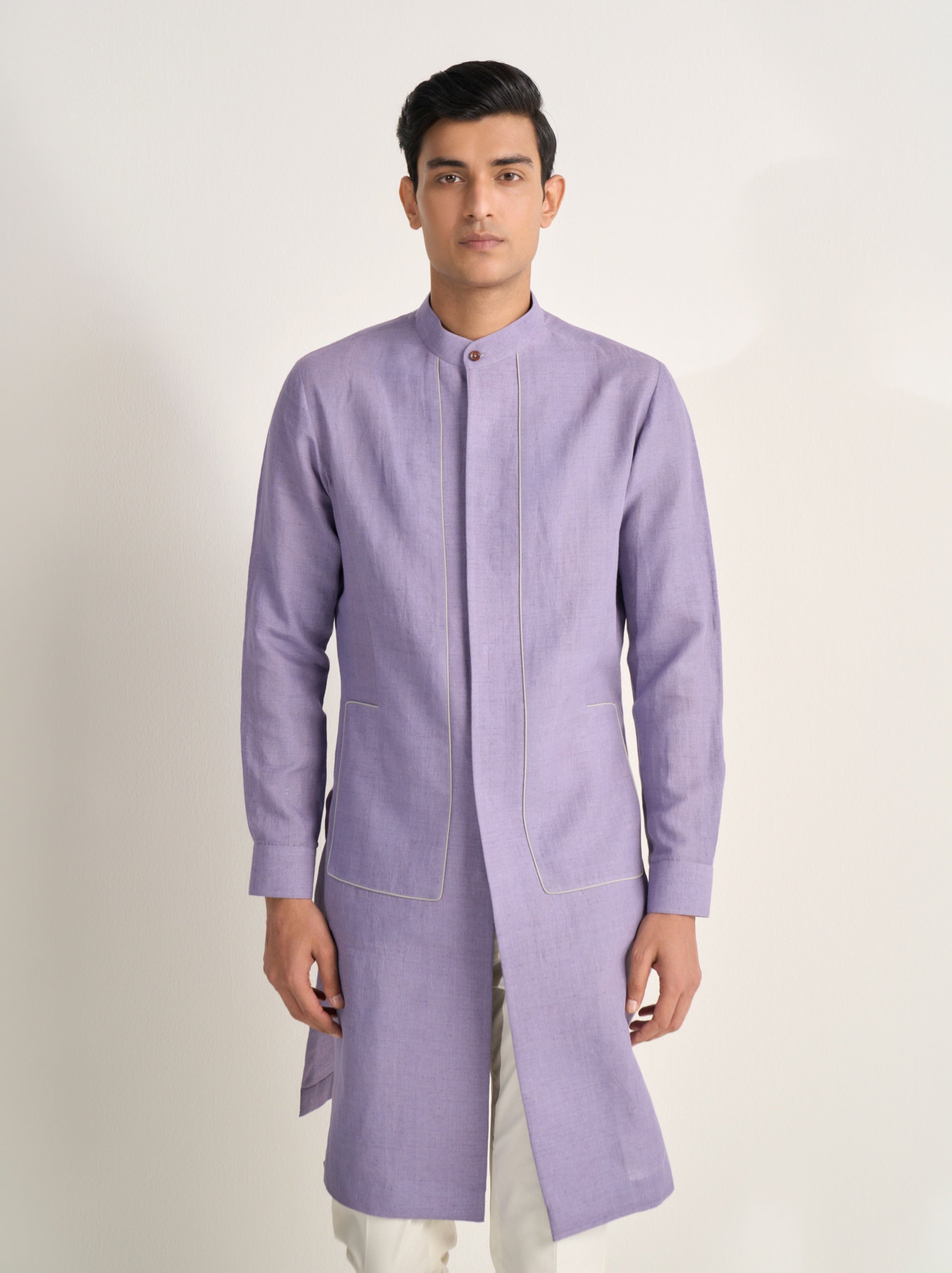 Embrace effortless sophistication in this iris handloom structured kurta set, woven in soft cotton linen. Featuring a mandarin collar and concealed placket, it pairs beautifully with cream pyjamas for a classic yet modern aesthetic—ideal for traditional celebrations or refined gatherings.