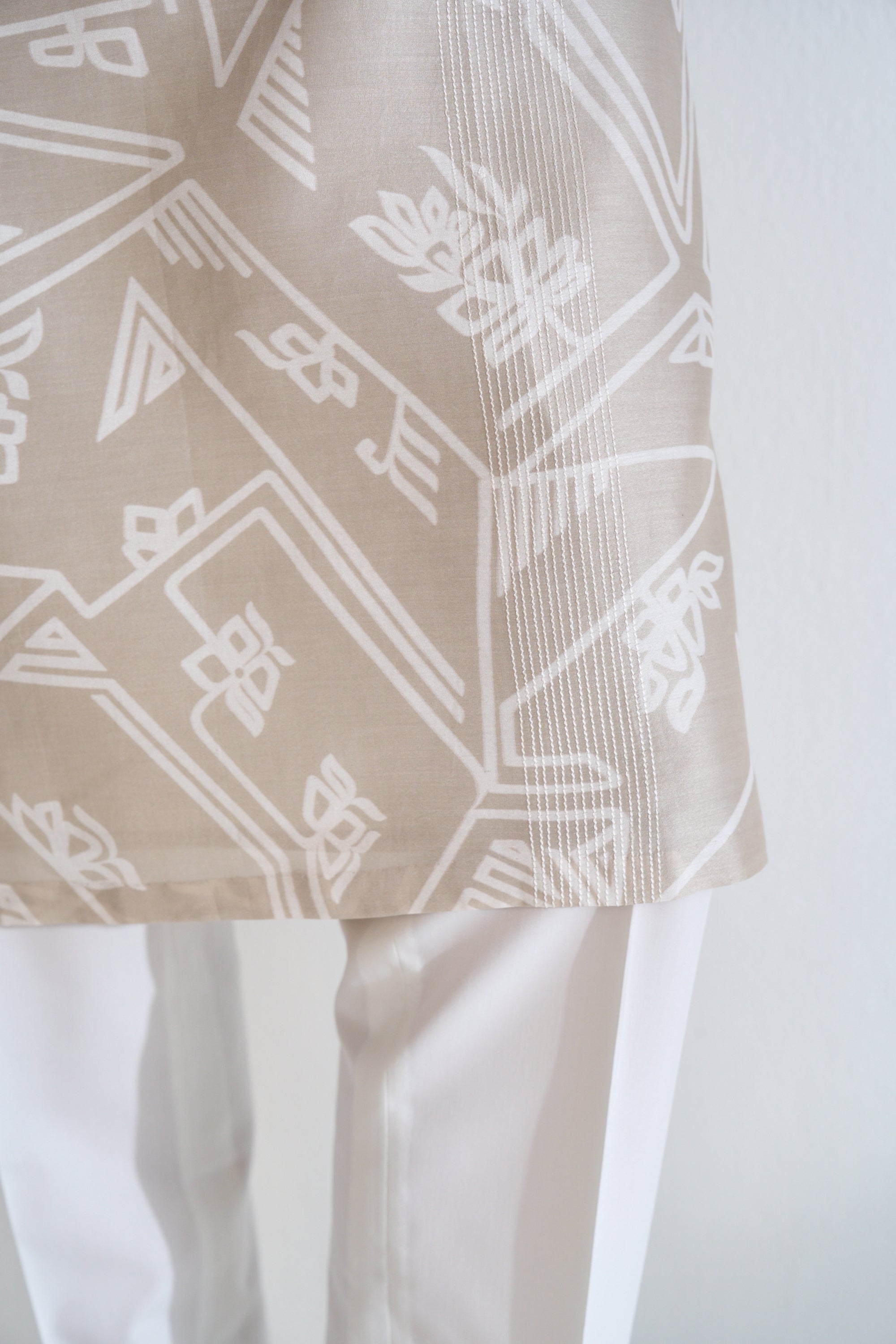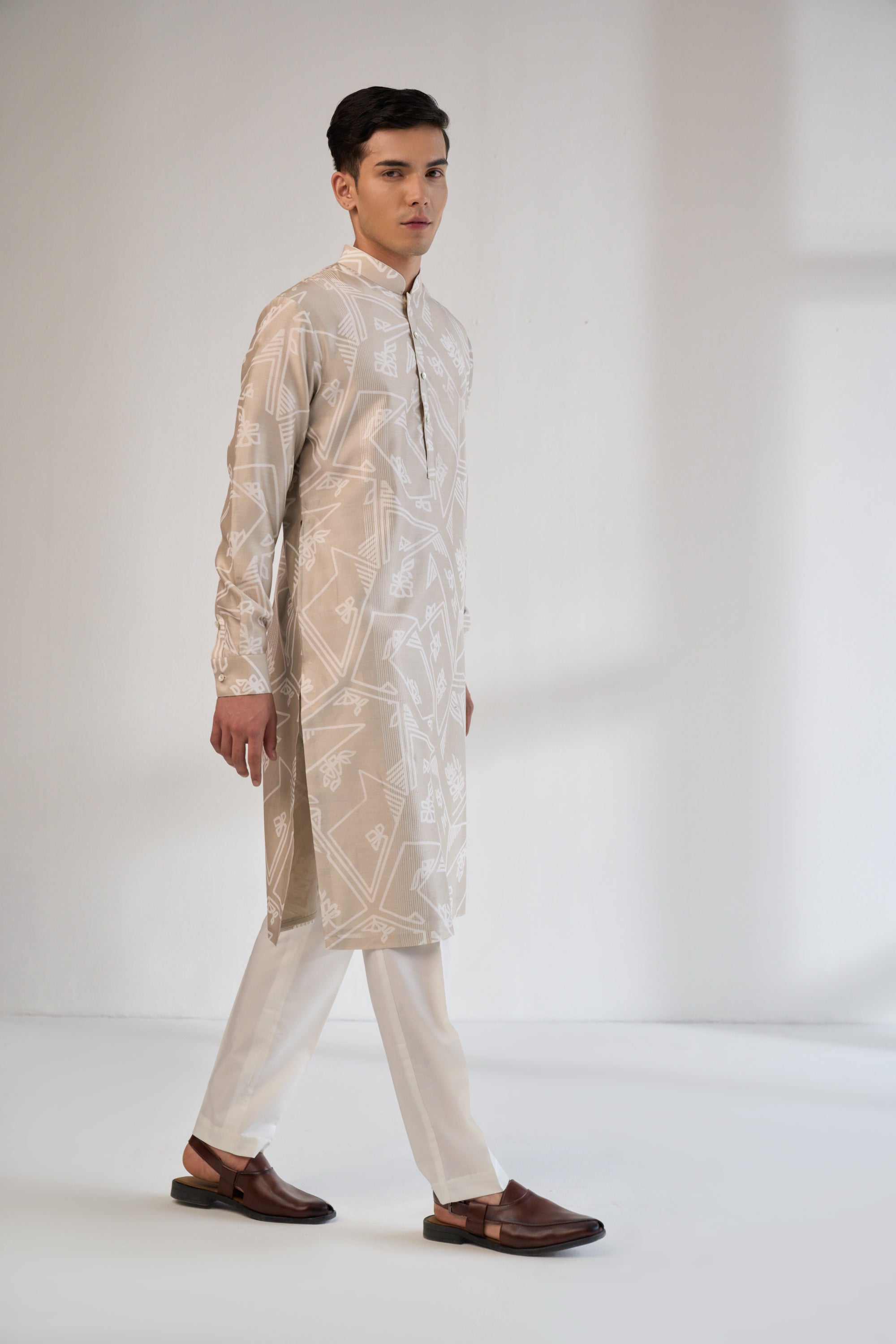 A symphony of modern artistry, this London Fog printed kurta set in chanderi silk features bold geometric prints with thread embroidery. The relaxed fit and structured placket balance style with ease, making it ideal for festive celebrations and cultural occasions.
