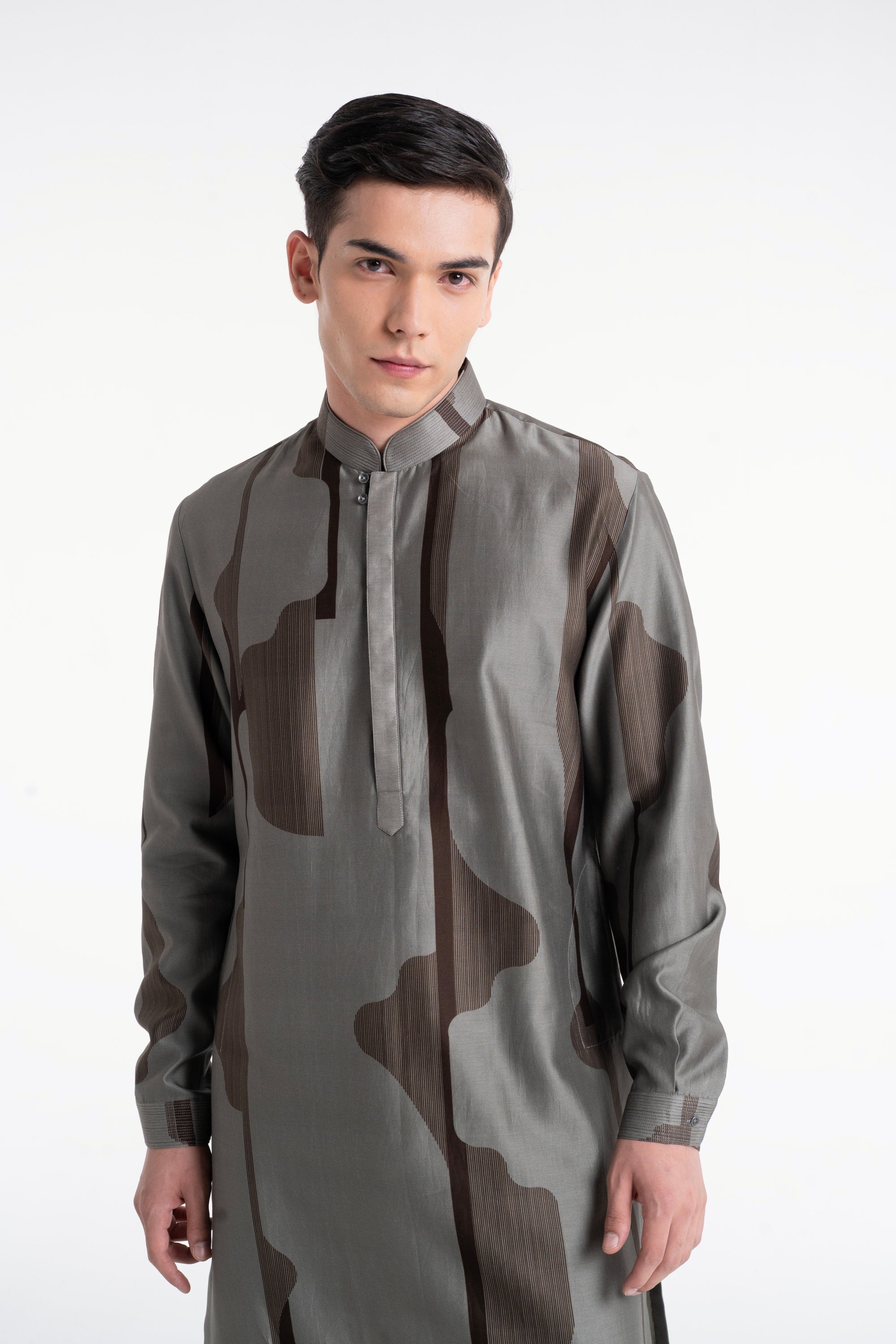 Understated and graceful, this london fog printed kurta set offers soft tones and detailed craftsmanship in chanderi fabric. The concealed placket and crisp silhouette make it a refined choice for festive or formal events.