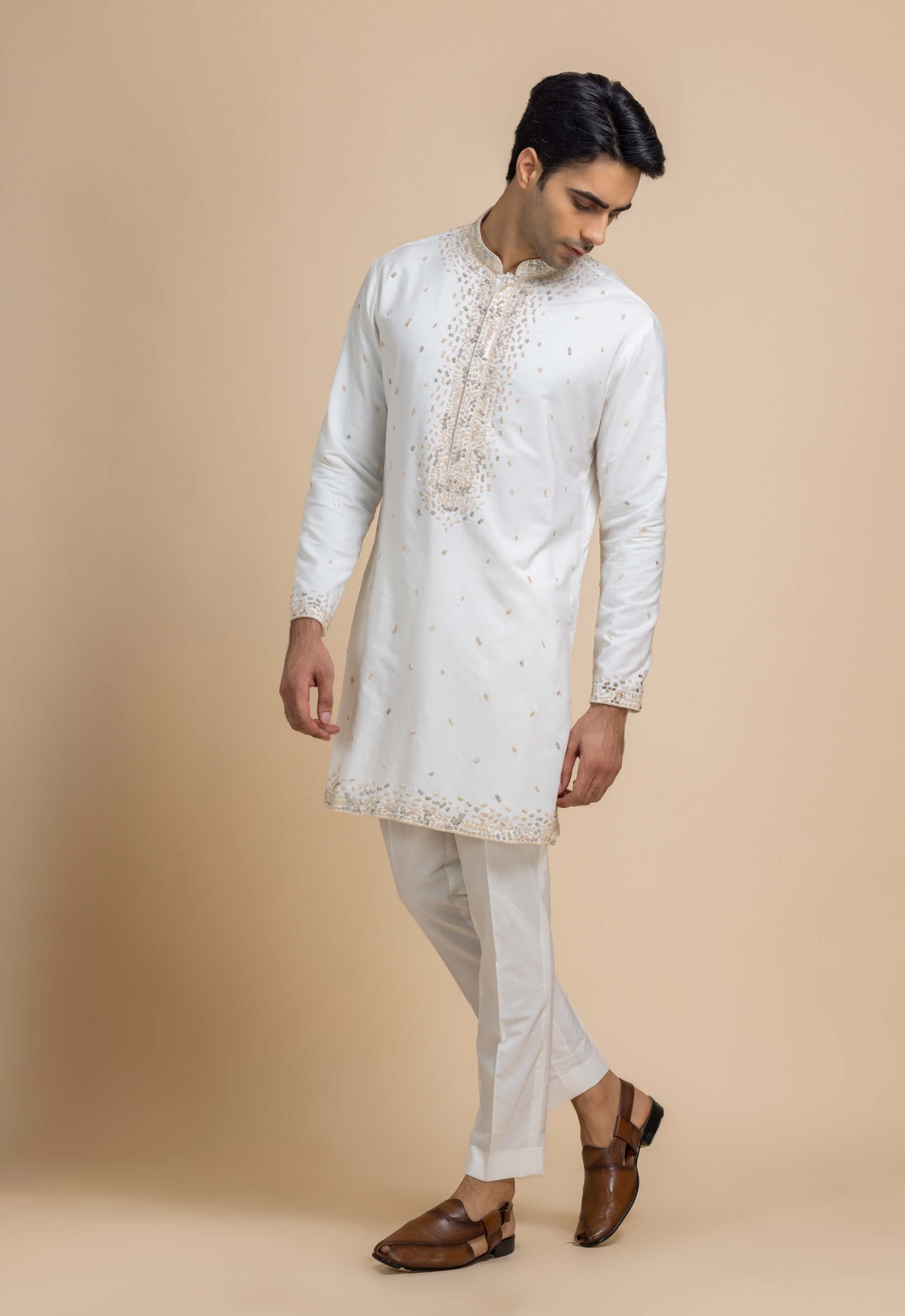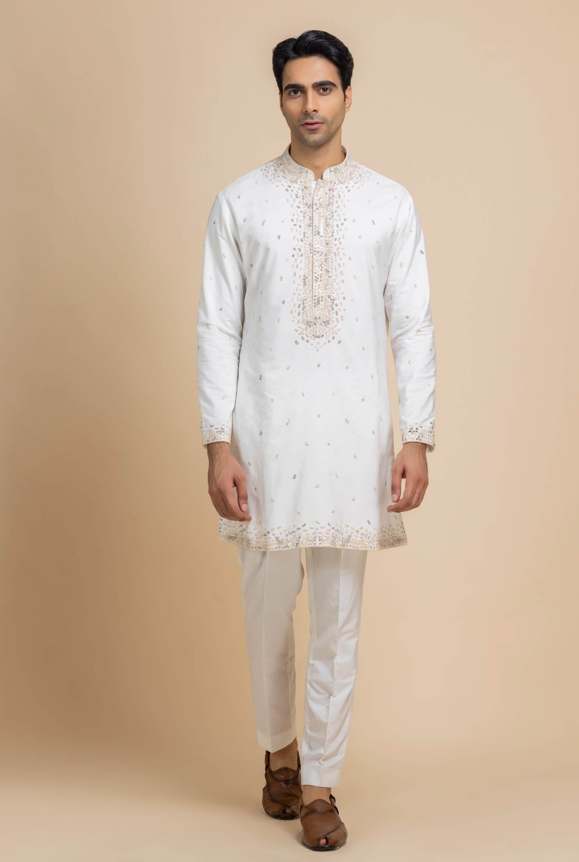 Minimal yet distinctive, this pearl white kurta is elevated with pale yellow tonal embroidery tracing the collar. Designed with a mandarin collar and soft front pleats, it offers quiet character. Paired with matching straight pants, it feels polished and modern. Perfect for festive occasions and refined celebrations.