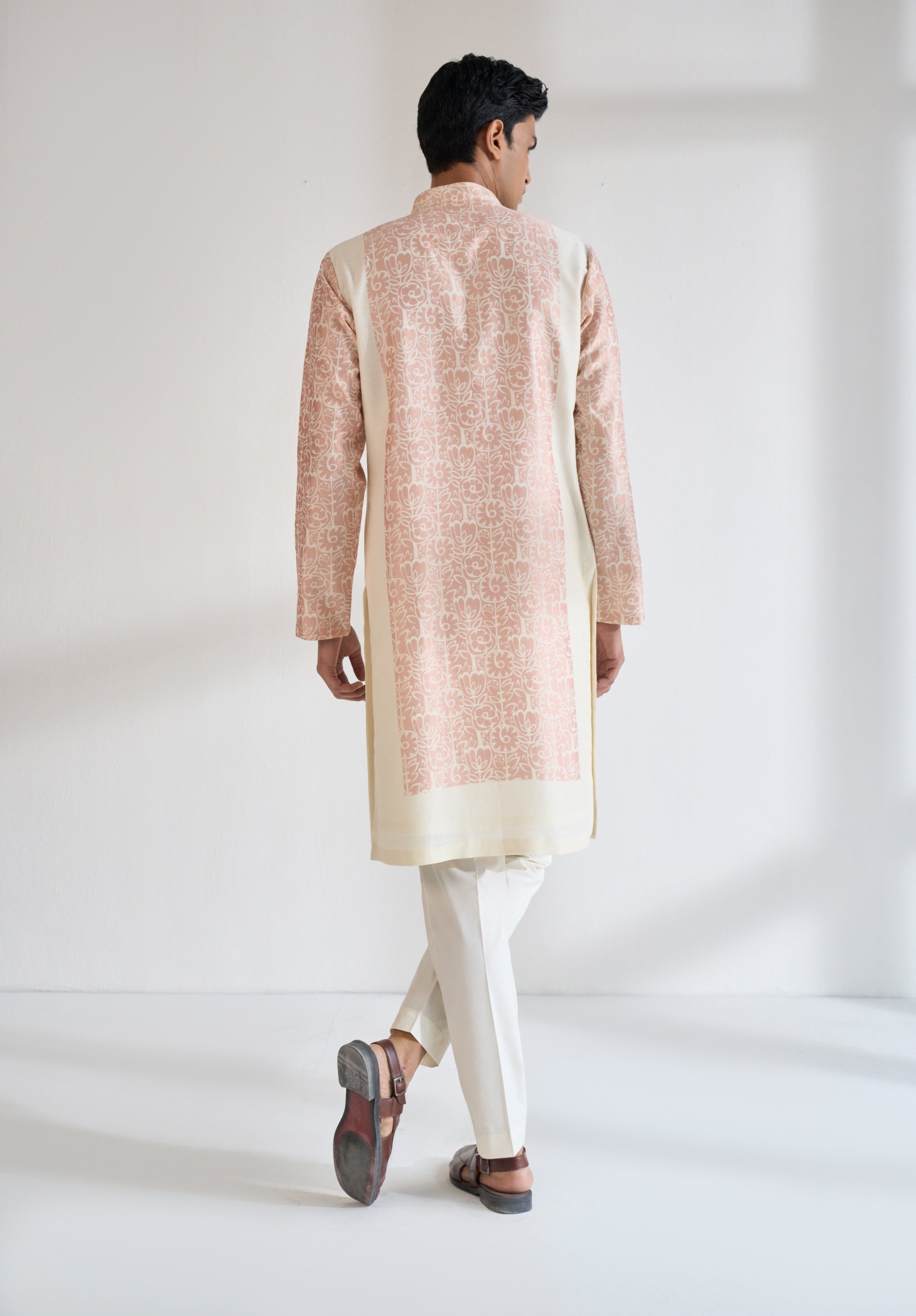 Embrace timeless grace with this sandrose-hued chanderi kurta featuring elegant thread embroidery. The refined cut and minimal detailing exude sophistication, while the cream pant-style pyjama adds a contemporary finish. Ideal for traditional events and family gatherings.
