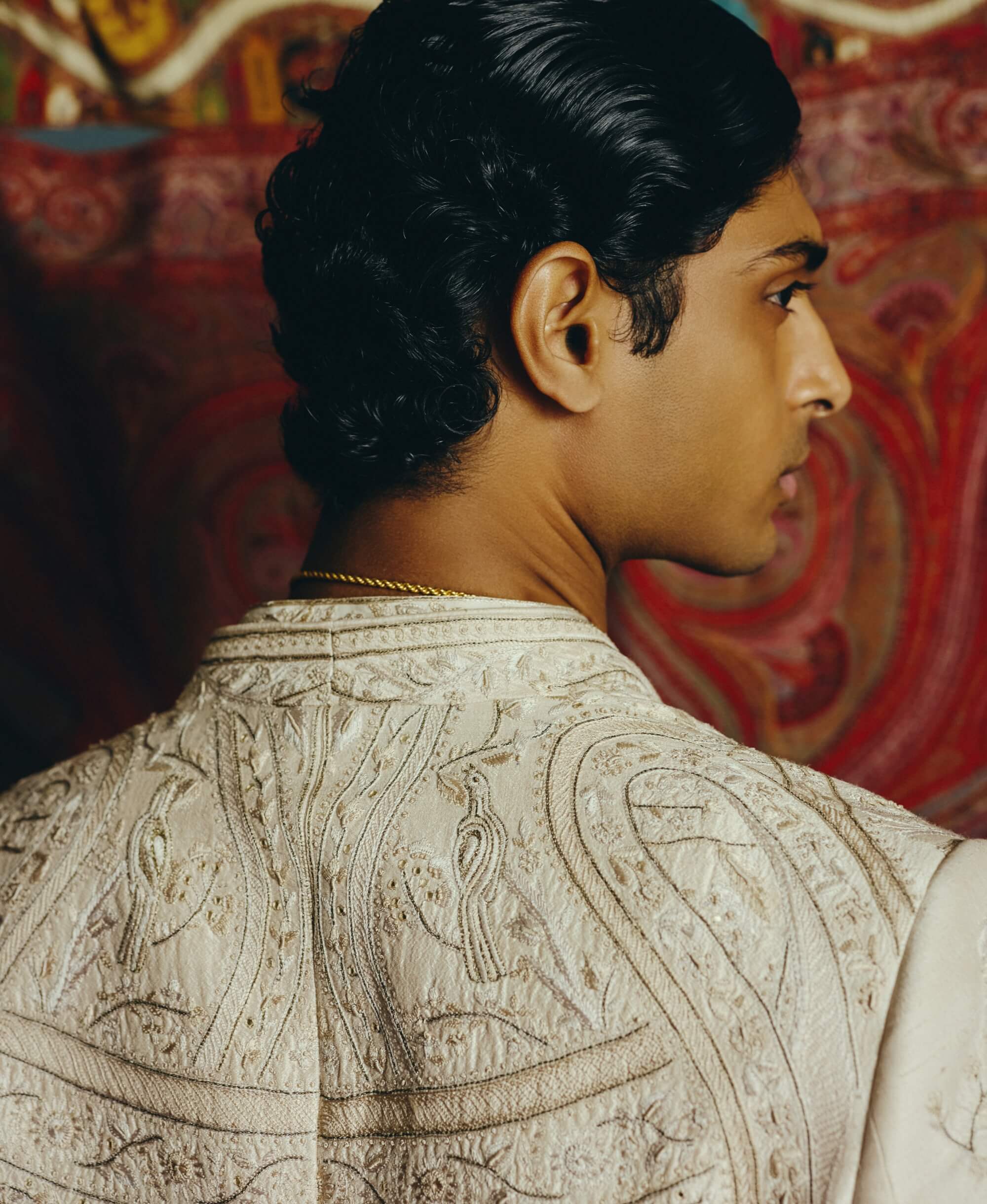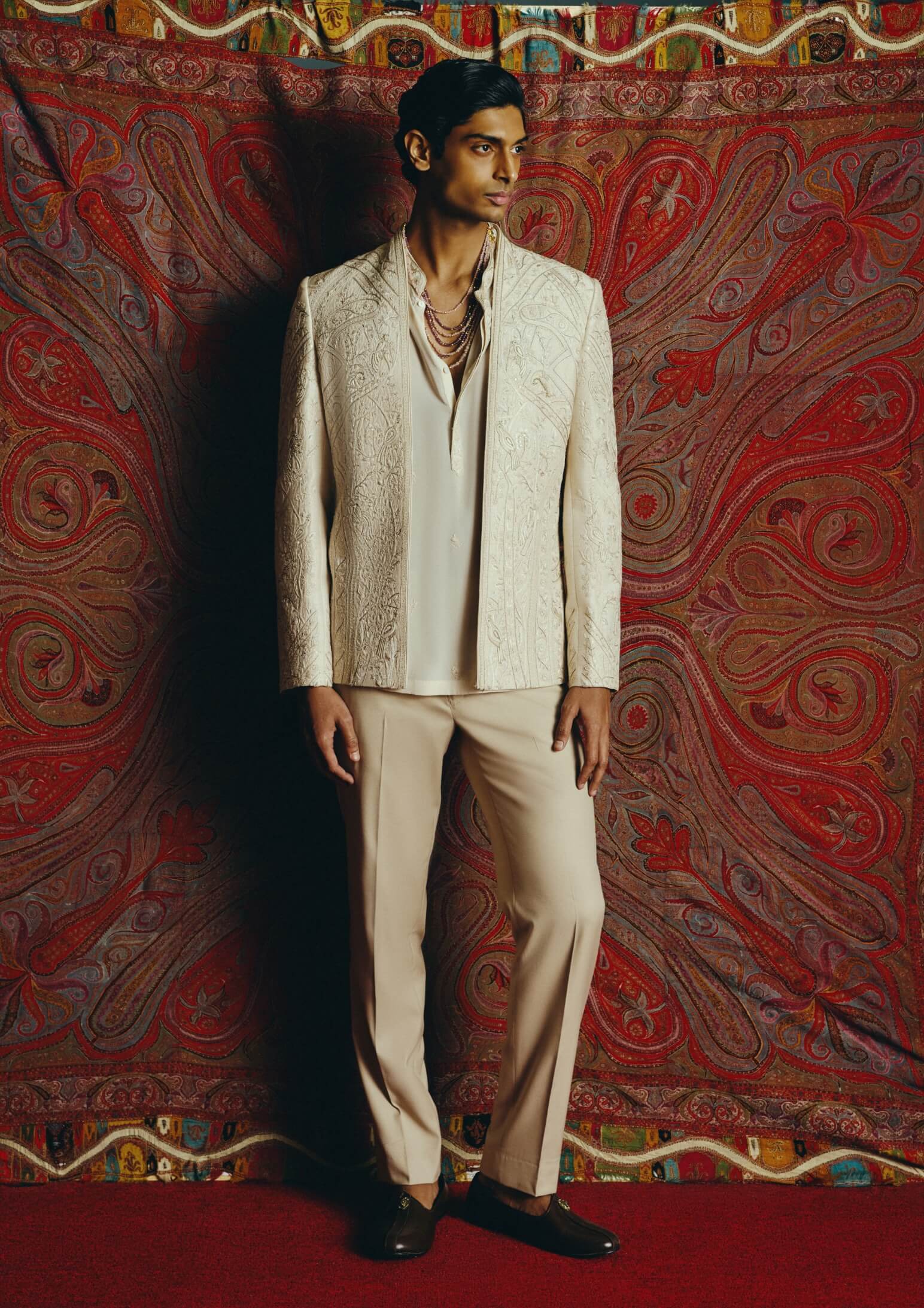 A tonal ivory open jacket enriched with intricate surface embroidery that subtly reveals itself with movement. Paired with tailored trousers and a mandarin-collar shirt accented with delicate motifs, the ensemble reflects quiet luxury. Crafted in raw silk, lycra georgette, and japanese crepe for a refined finish. Perfect for festive evenings, receptions, and elegant occasions.