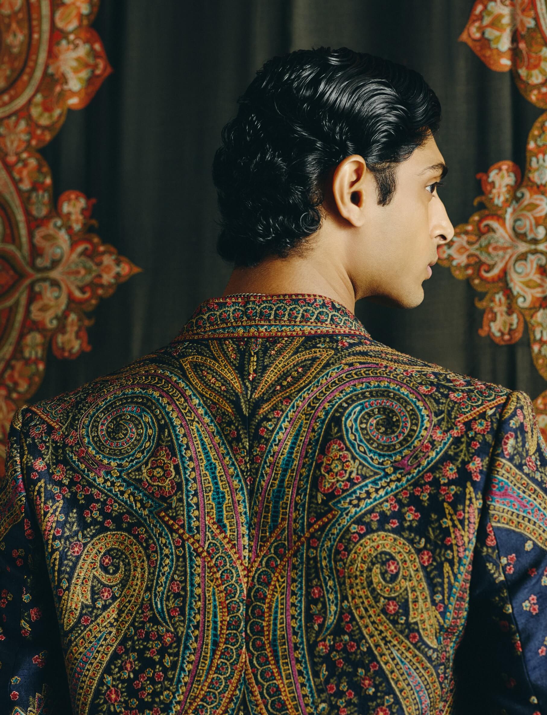 A refined statement ensemble where heritage craft meets modern tailoring. The fully kashidakari embroidered jacket layered over a cobalt v-neck shirt and black velvet pants creates a bold yet elegant silhouette. Rich textures of raw silk, silk crepe, and japanese crepe enhance the luxurious feel. Ideal for cocktail evenings, receptions, and statement festive celebrations.