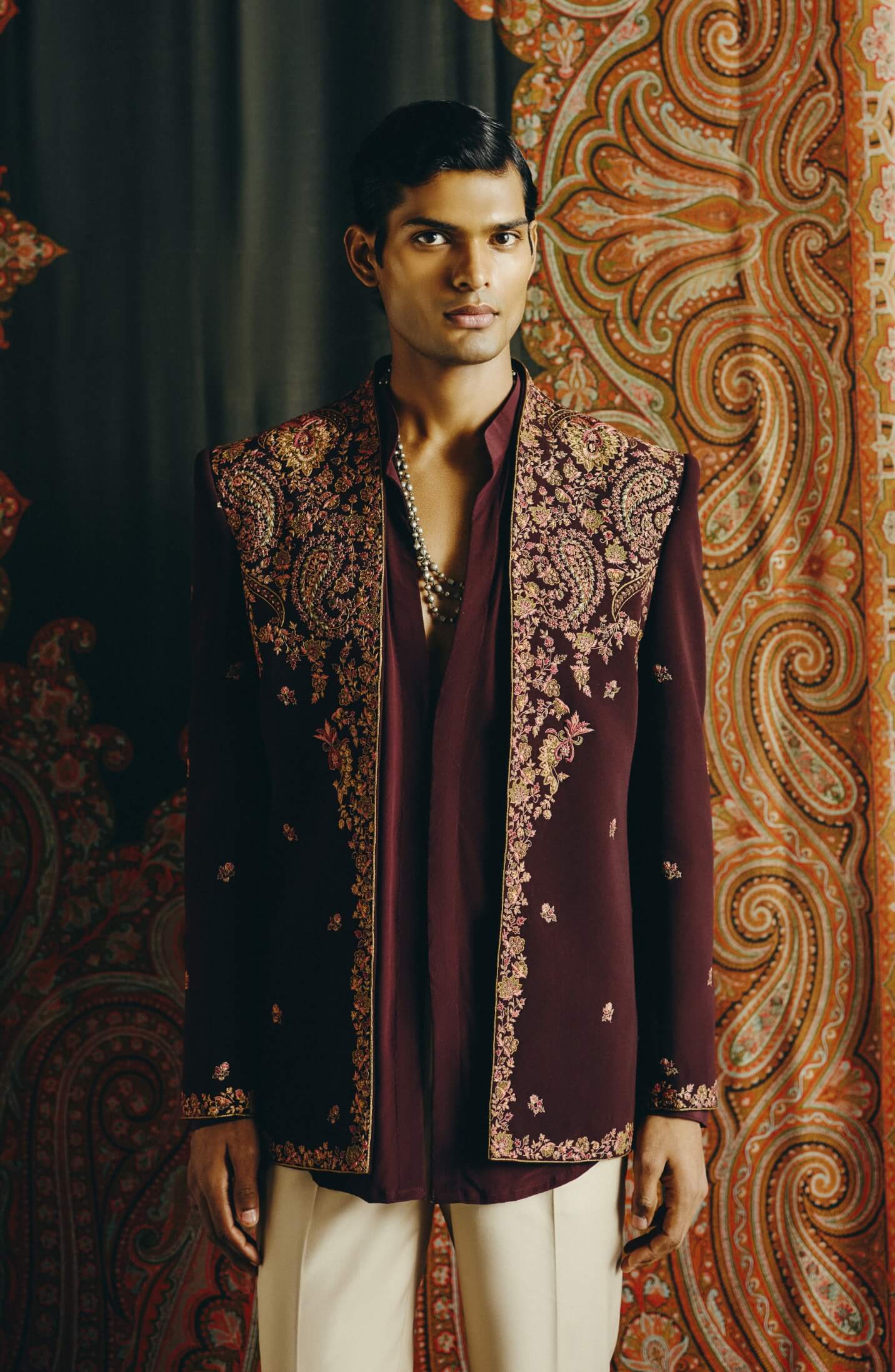 A rich maroon open jacket adorned with intricate kashmiri embroidery creates a striking yet refined statement. Styled with a fluid shirt and tailored beige trousers, the ensemble reflects understated luxury and heritage craftsmanship. Crafted in japanese crepe and lycra crepe for a polished finish. Ideal for wedding festivities, receptions, and elegant evening events.