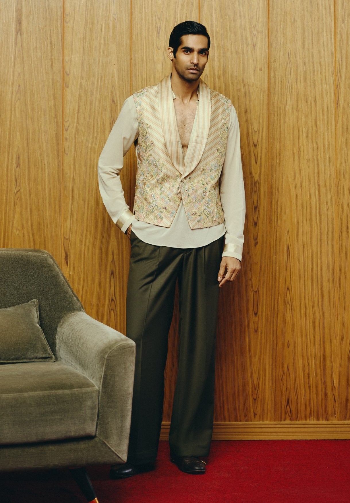 A sophisticated olive-toned ensemble featuring a plaid embroidered waistcoat layered over a light olive shirt. Deep green trousers anchor the look while delicate bead detailing on the waistcoat adds quiet luxury. Crafted in satin, crepe, and japanese crepe for refined comfort. Perfect for cocktail evenings, festive gatherings, and contemporary celebrations.