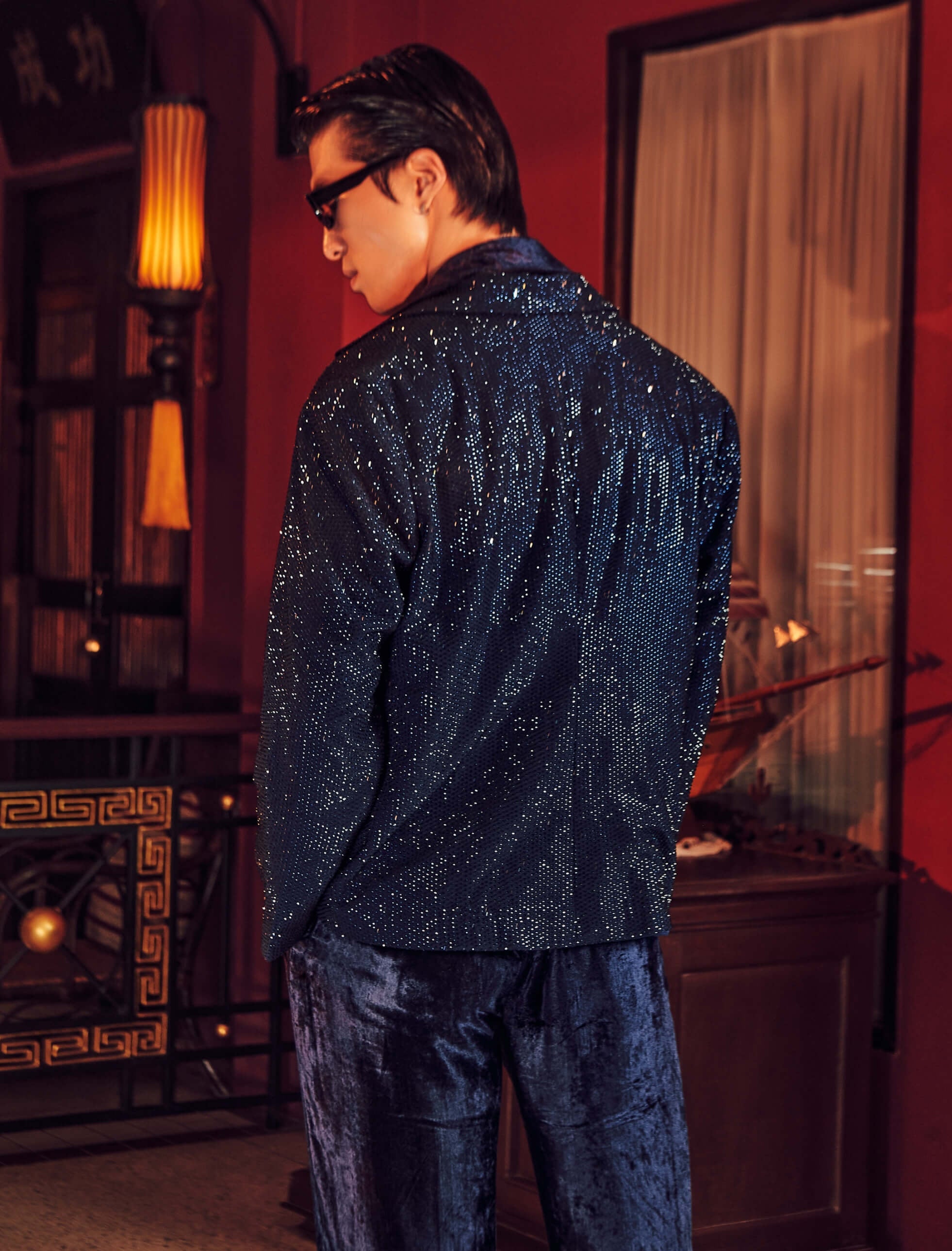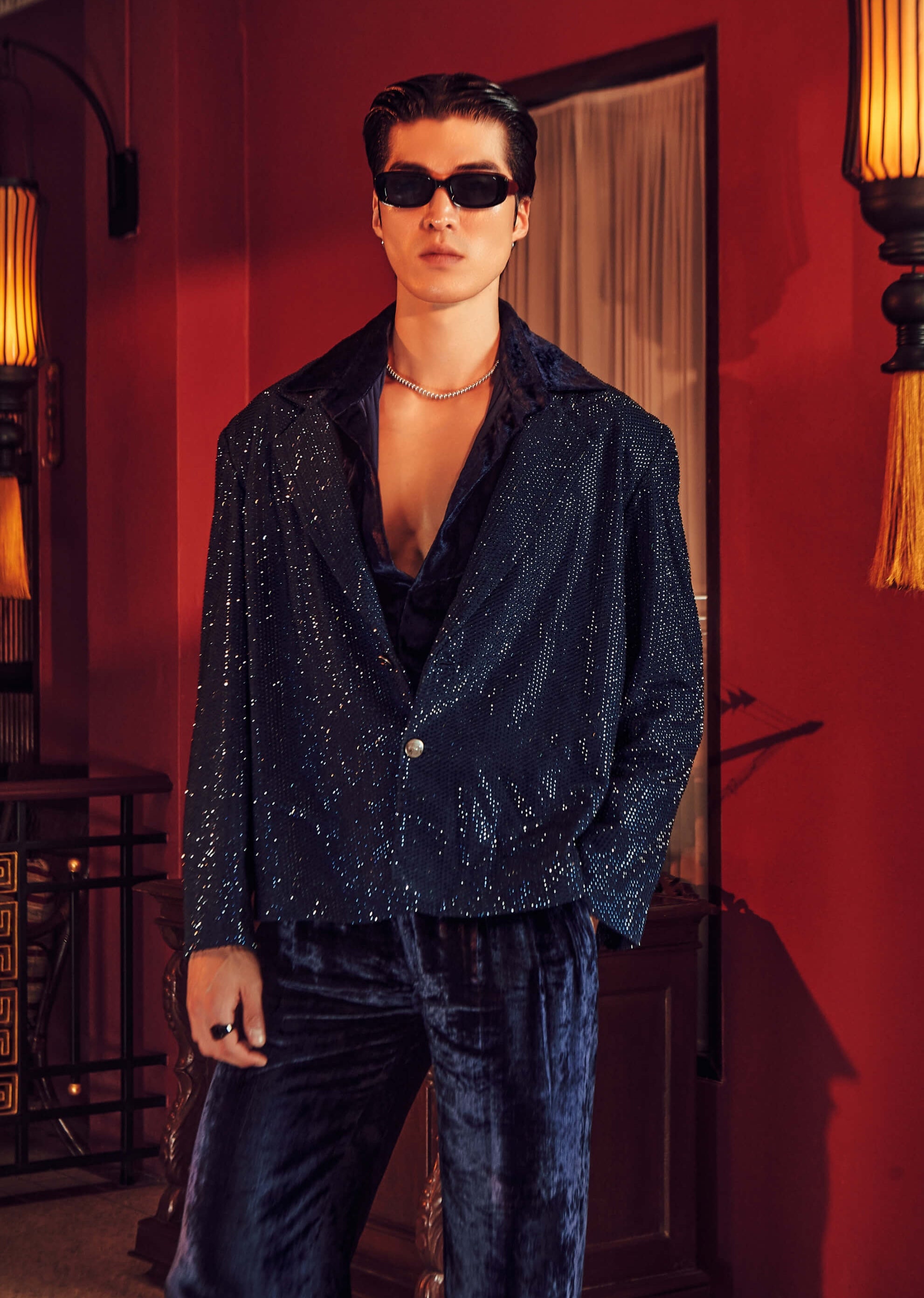Reimagining formal wear, this midnight blue set features a cropped blazer and a velvet coordinate set. The interplay of crepe and velvet adds a luxurious, youthful touch to a classic color.
