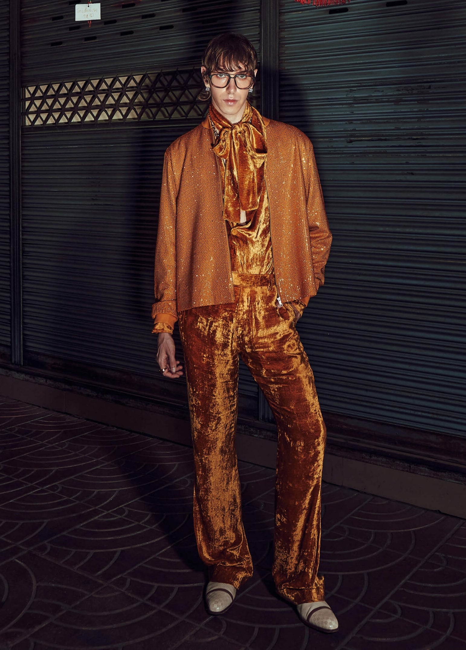This rich mustard ensemble layers a smooth melon crepe bomber over a plush velvet coordinate set. The mix of textures and warm tones creates a luxurious, multi-dimensional look.