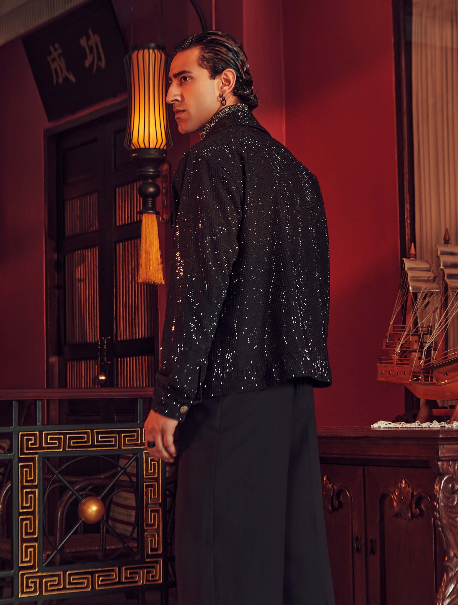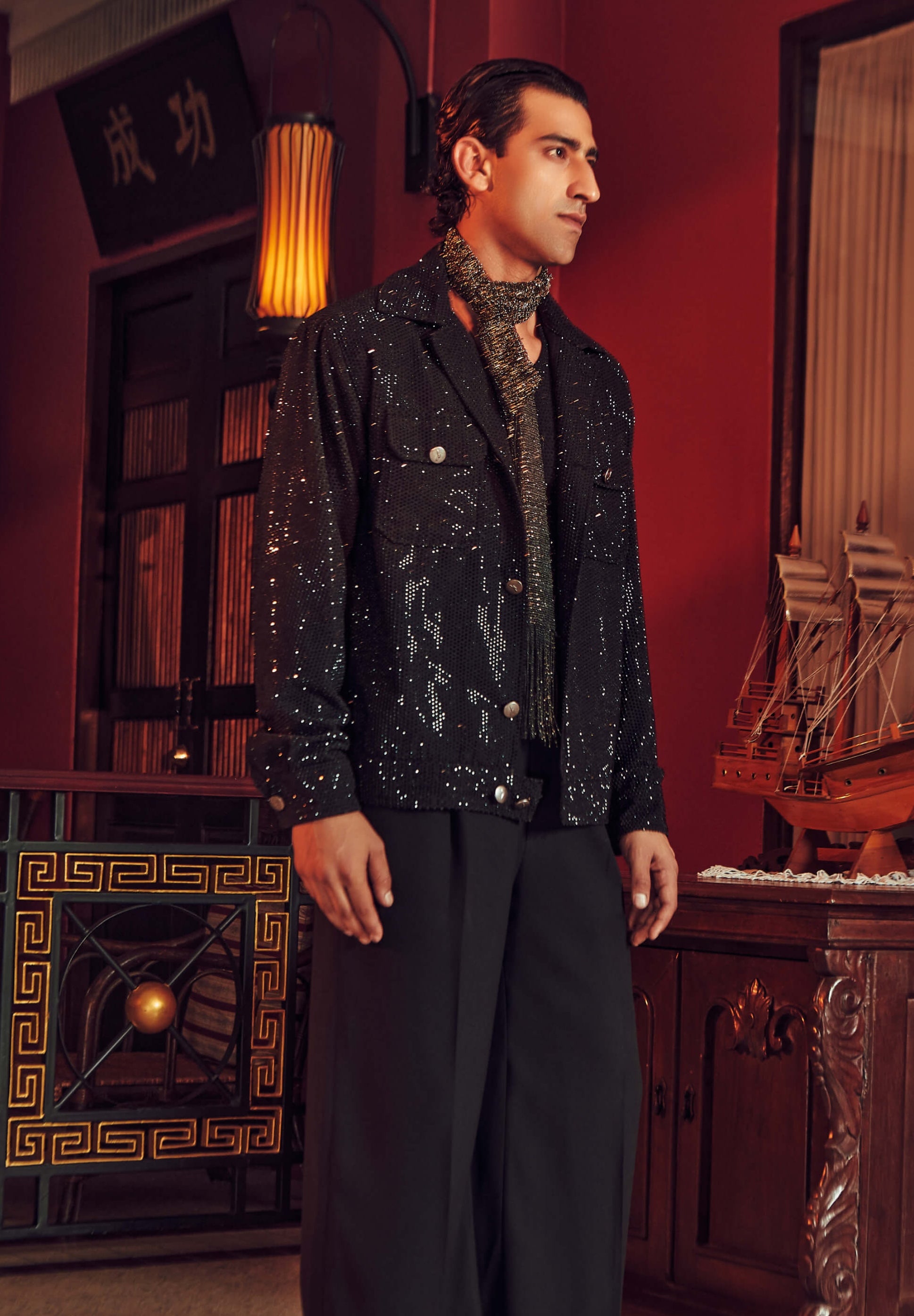 The ultimate black coordinate set featuring a melon crepe bomber and matching trousers. Paired with a black ribbed tank, it’s a versatile wardrobe staple that defines sleek, understated style.