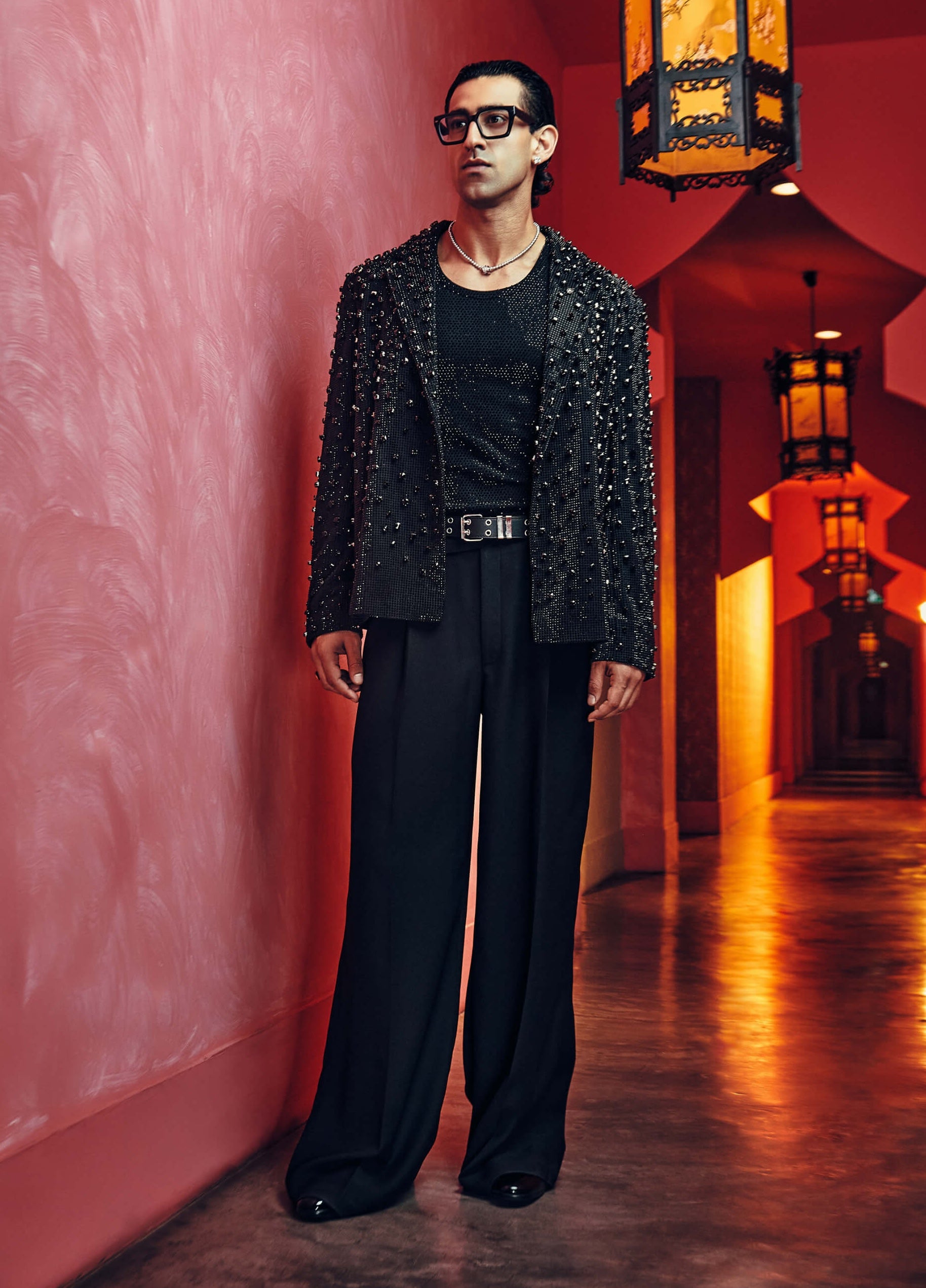 A versatile trio featuring a black melon crepe blazer, a ribbed tank, and matching denim-style trousers. It’s a sharp, coordinated look that bridges the gap between tailoring and casual wear.