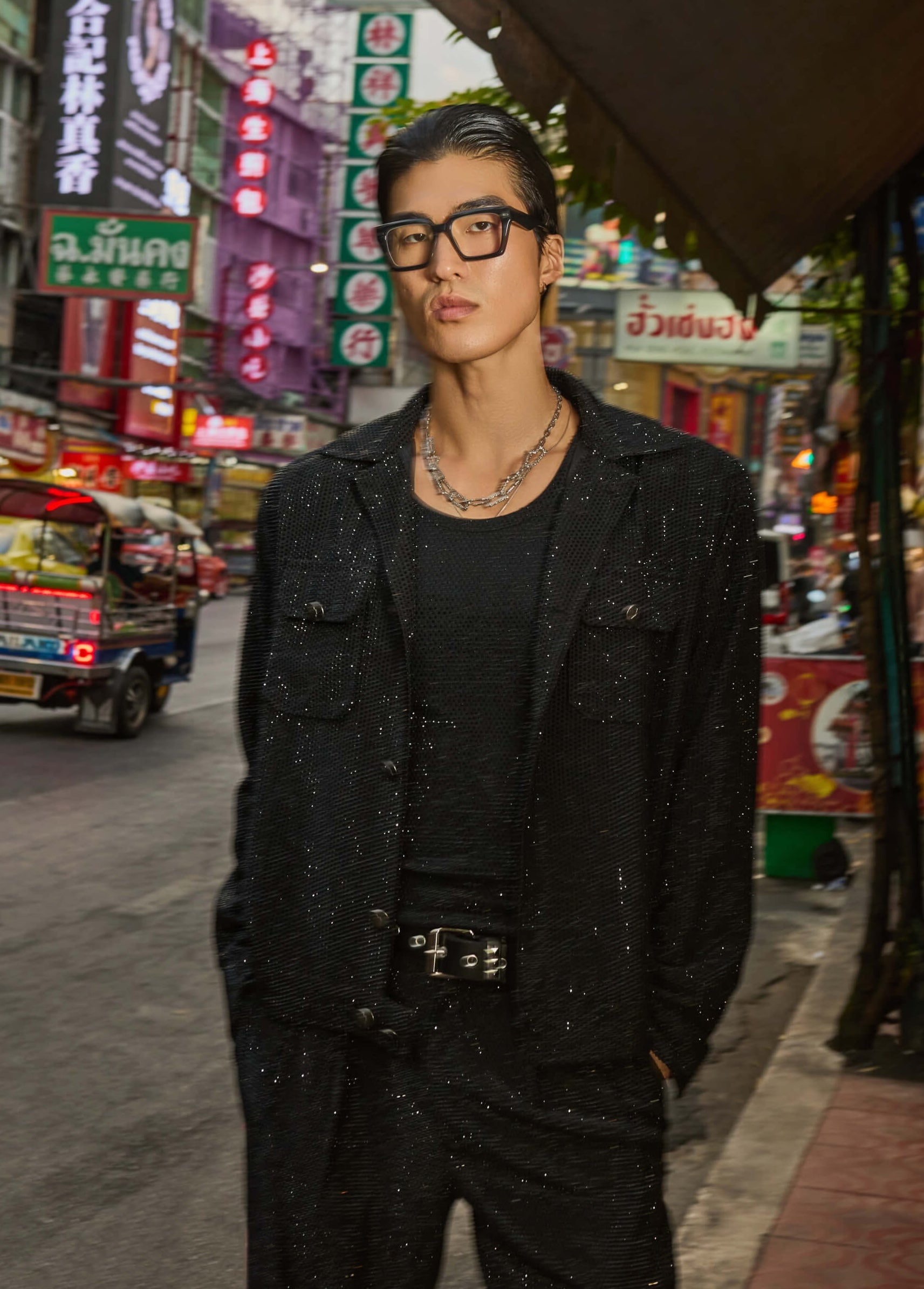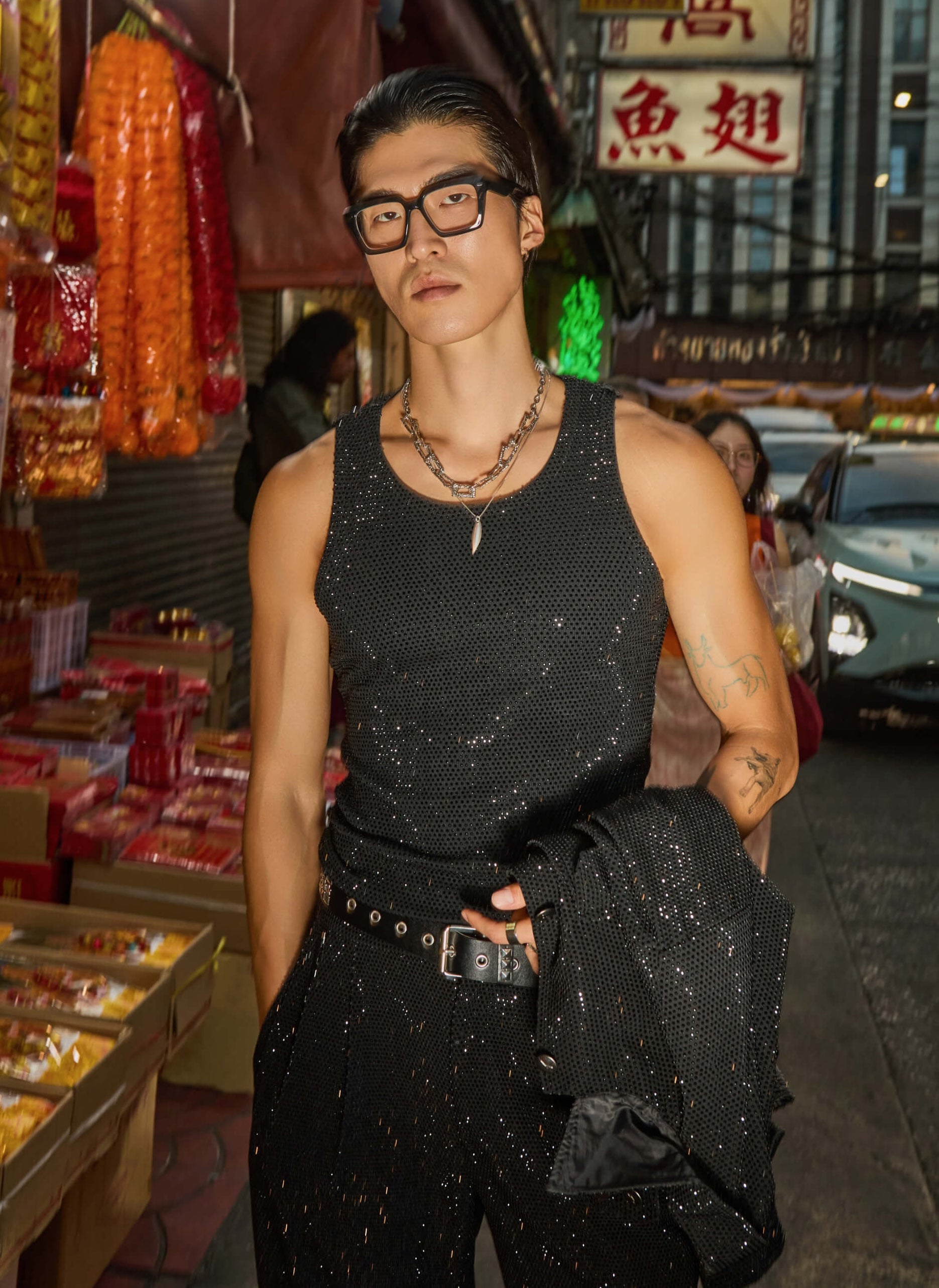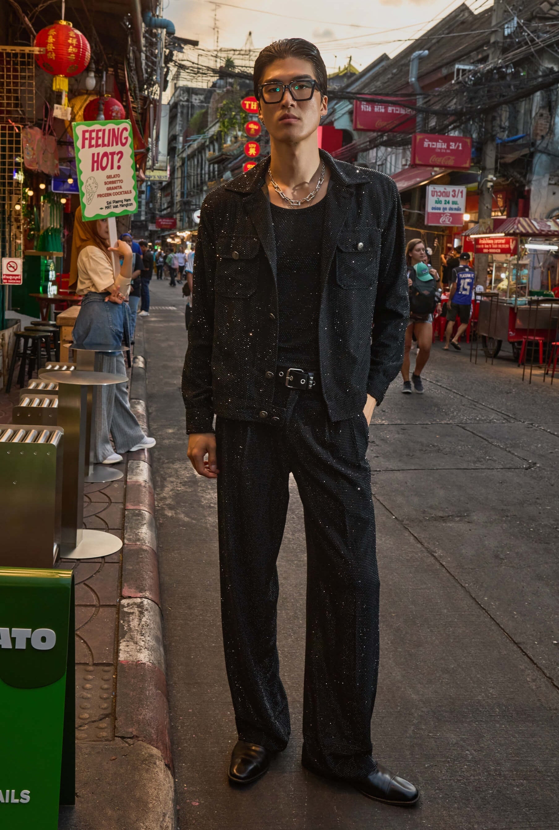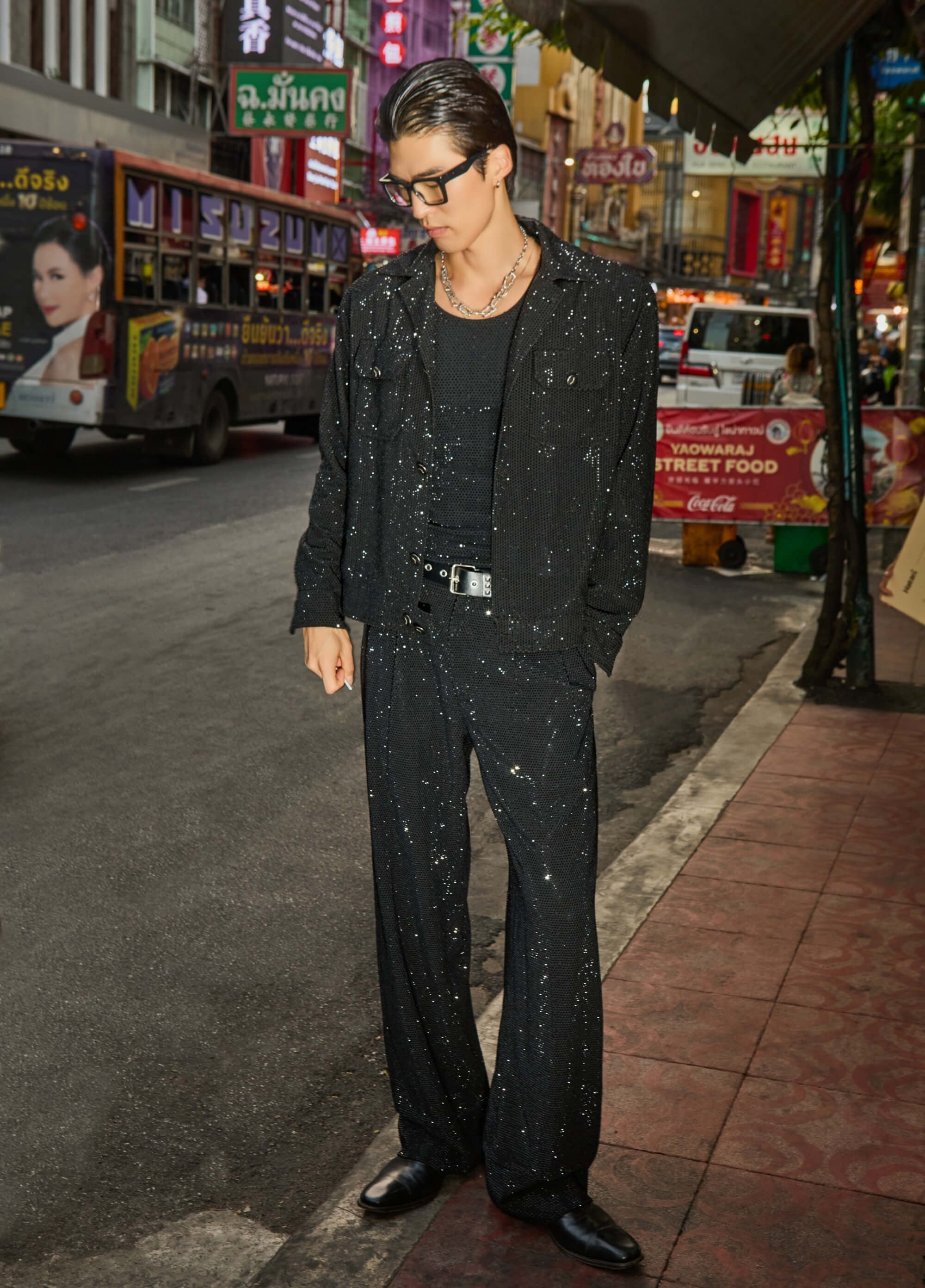 Sleek and monochromatic, this set features a black bomber and tank paired with crystal-embellished trousers. It’s a sophisticated take on tonal dressing with just the right amount of hidden sparkle.