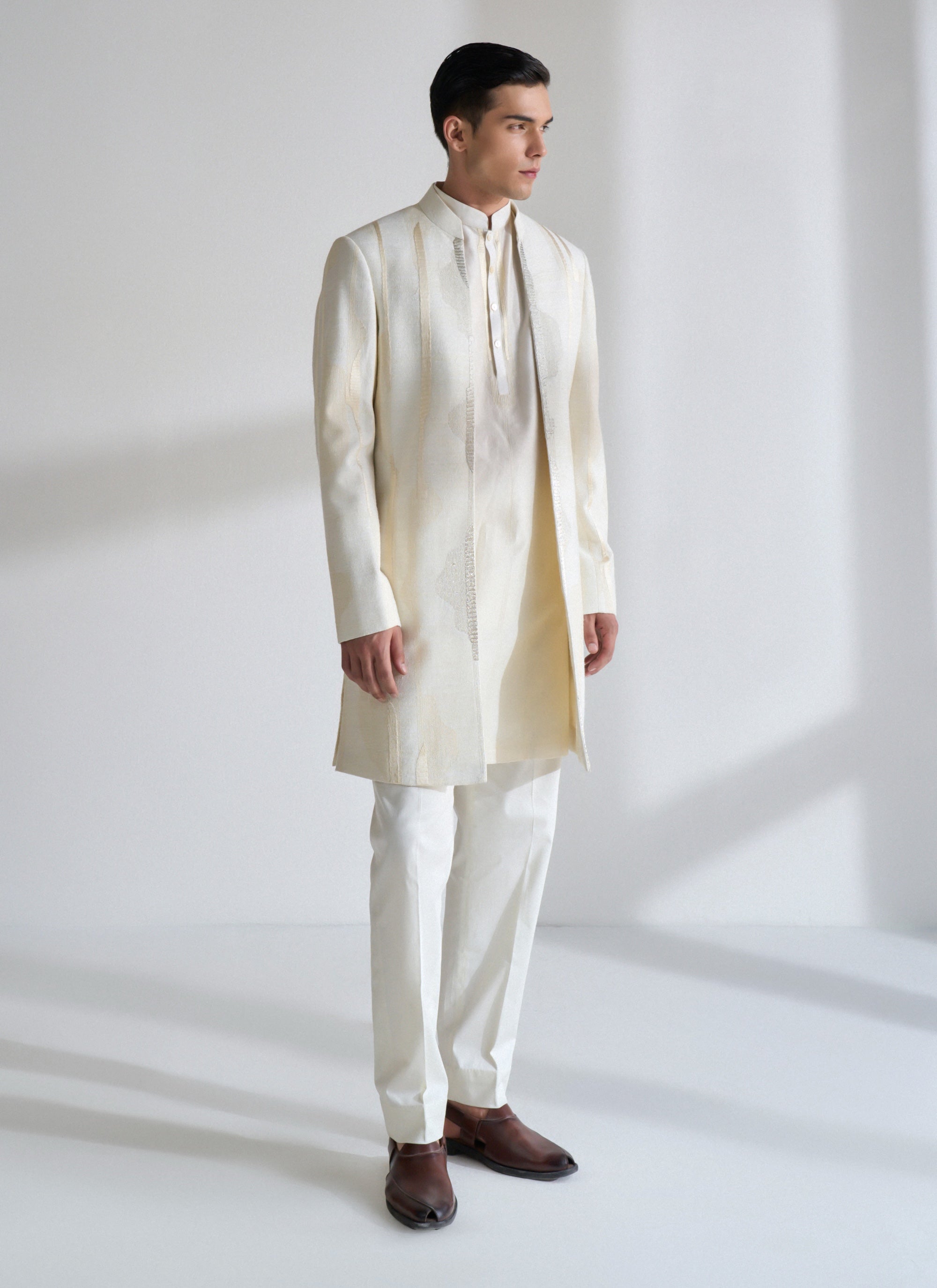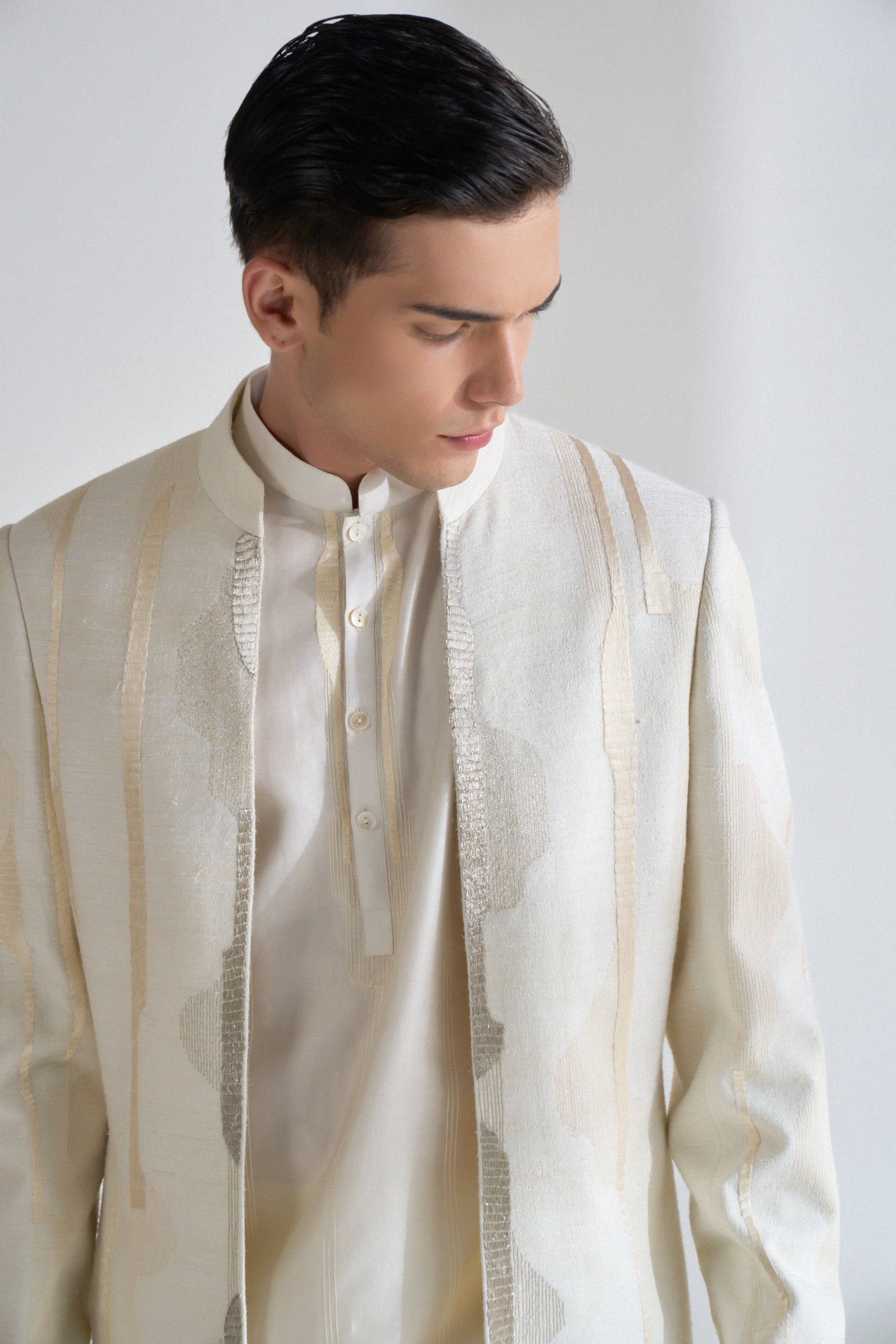 Contemporary allure meets timeless craftsmanship in this ivory silk sherwani embroidered with zari and silk threads. Styled with an embroidered chanderi kurta and terricotton pyjama, it’s the perfect ensemble for traditional functions and wedding festivities.