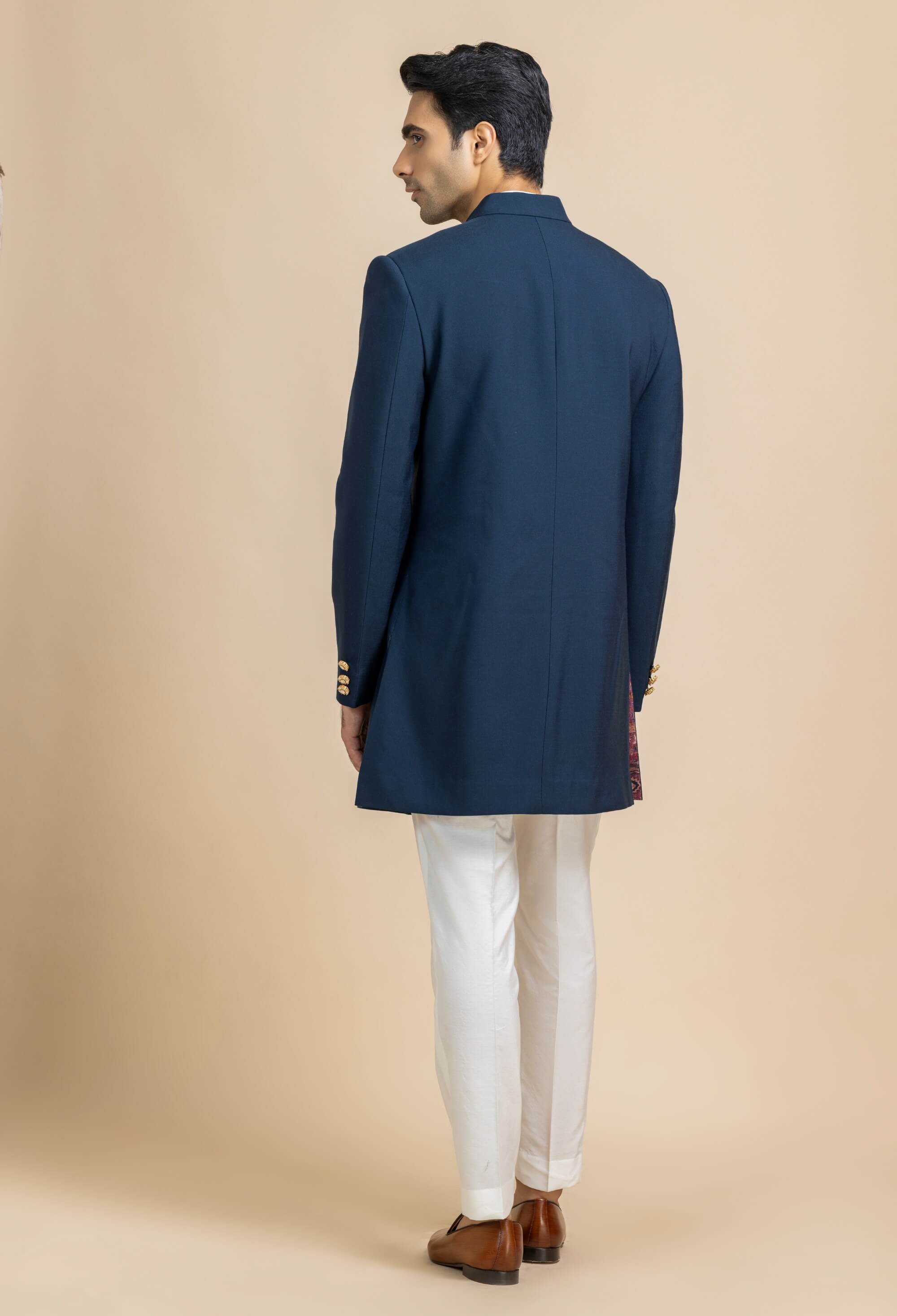 A study in refined tailoring, this navy achkan is designed with a structured silhouette and distinguished statement buttons. The elegant pocket detail adds a touch of understated luxury. Blending traditional sensibilities with modern design, it offers timeless versatility. Ideal for weddings, formal ceremonies, and celebratory occasions.