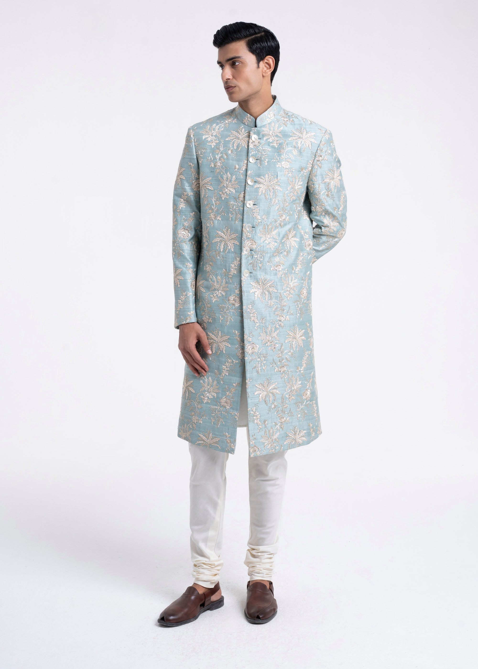 Ethereal elegance finds form in this powder blue silk sherwani. Detailed with intricate floral zari embroidery and paired with a churidar, it captures classic grace with a modern sensibility. Ideal for daytime weddings, engagement ceremonies, or festive celebrations.