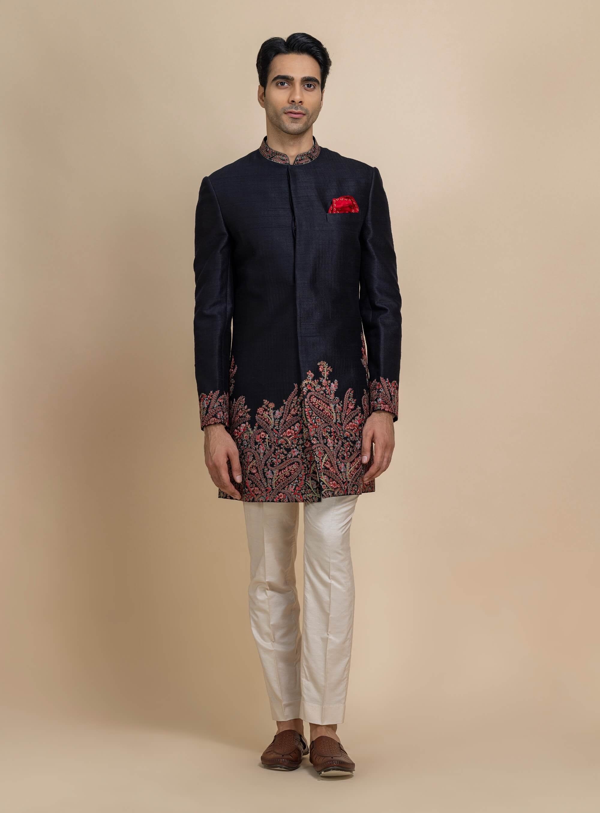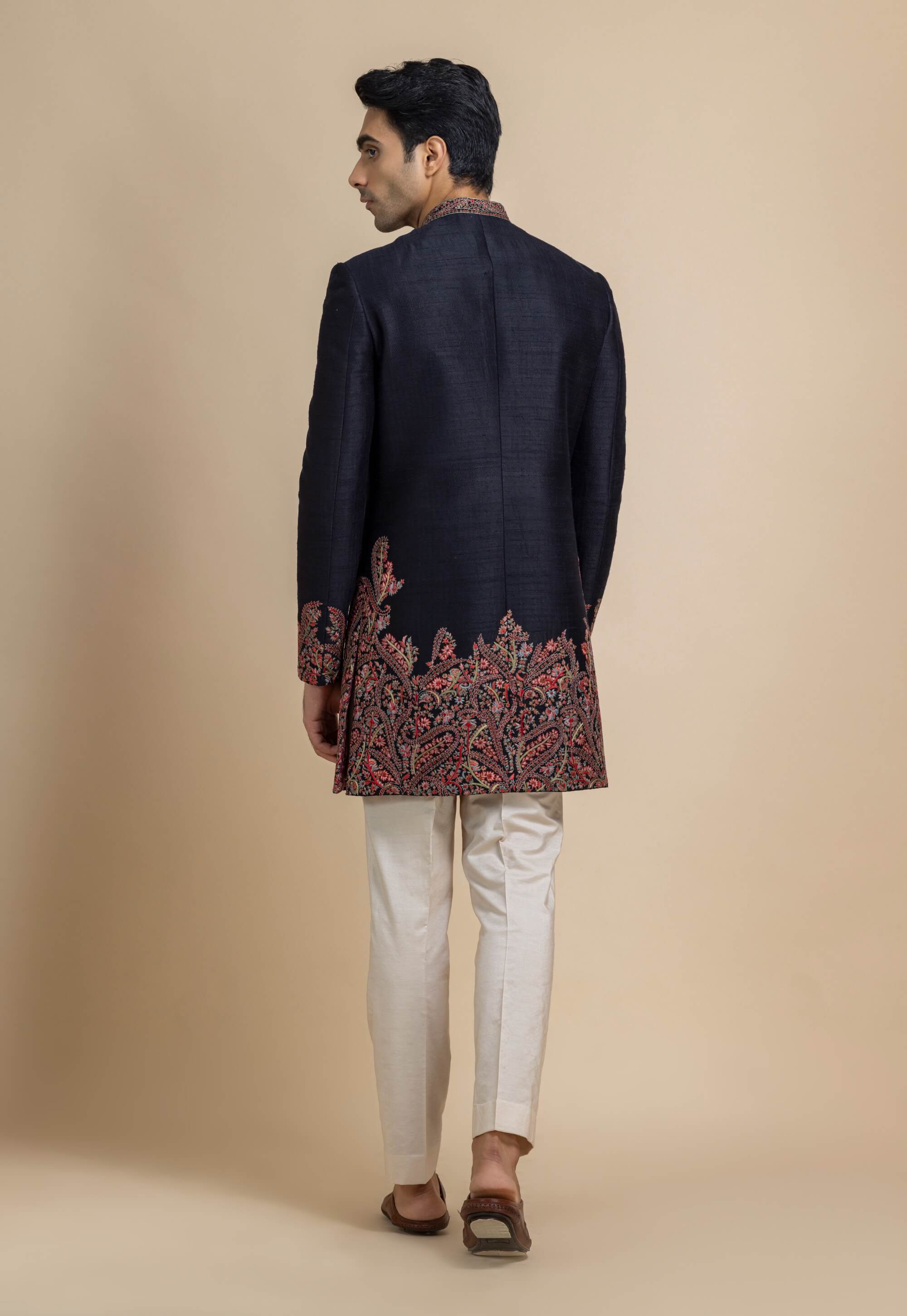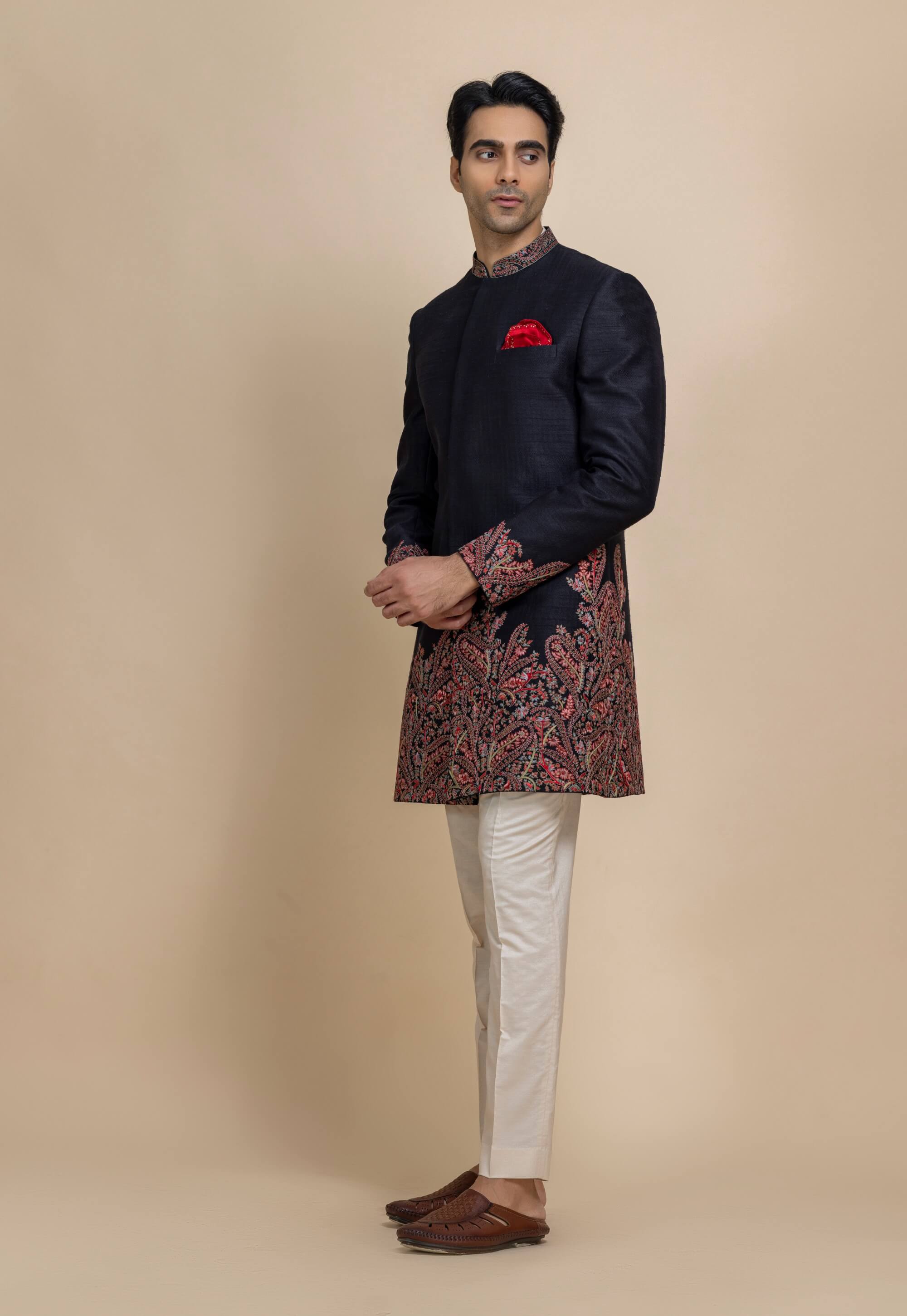 Rooted in heritage craftsmanship, this deep black raw silk achkan features meticulously hand-embroidered Kashmiri motifs brought to life through tonal Kashidakari. The contemporary silhouette balances richness with restraint, allowing the detailing to shine subtly. Paired with matching trousers and kurta, it offers effortless versatility. Perfect for weddings, festive gatherings, and distinguished soirées