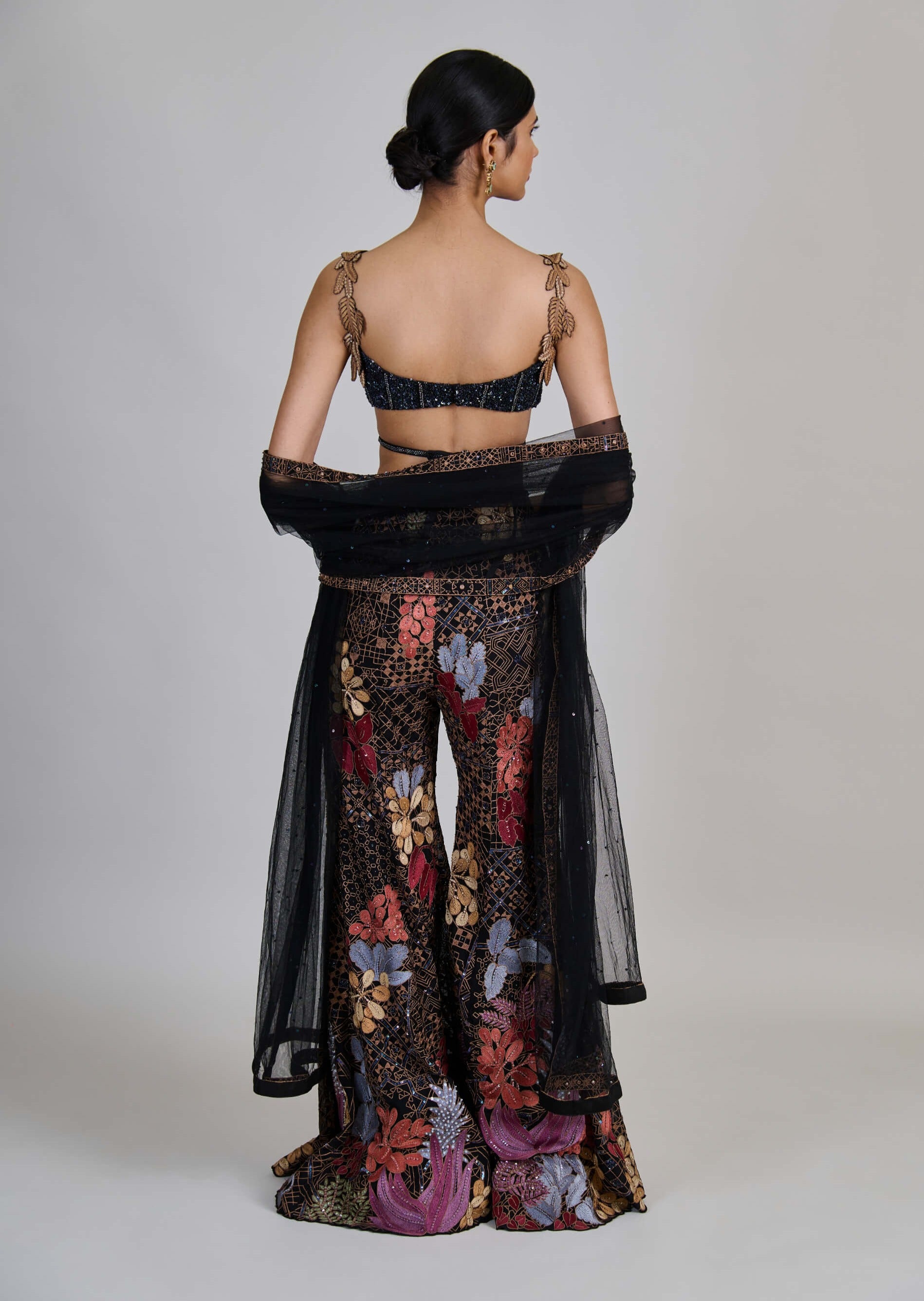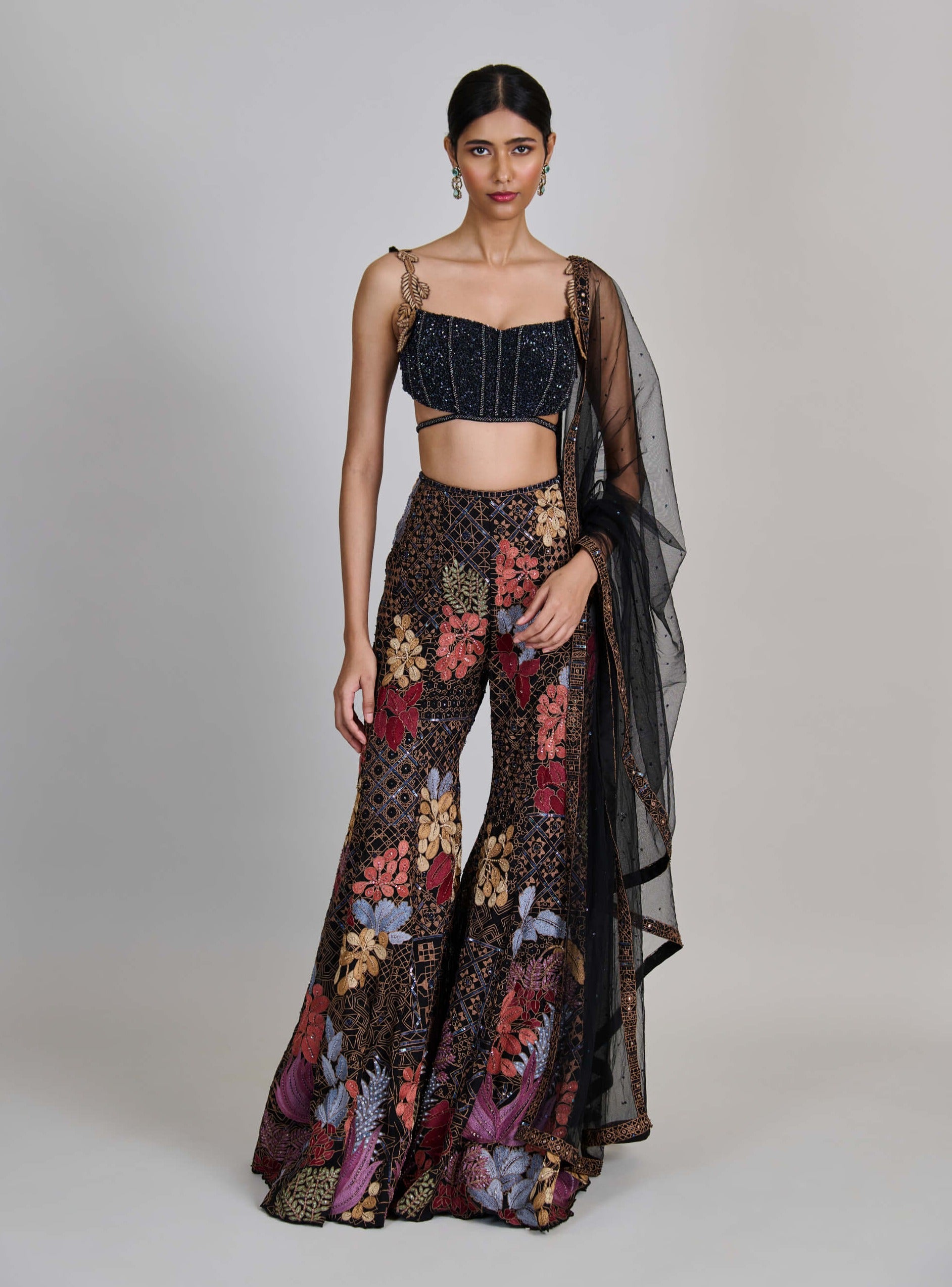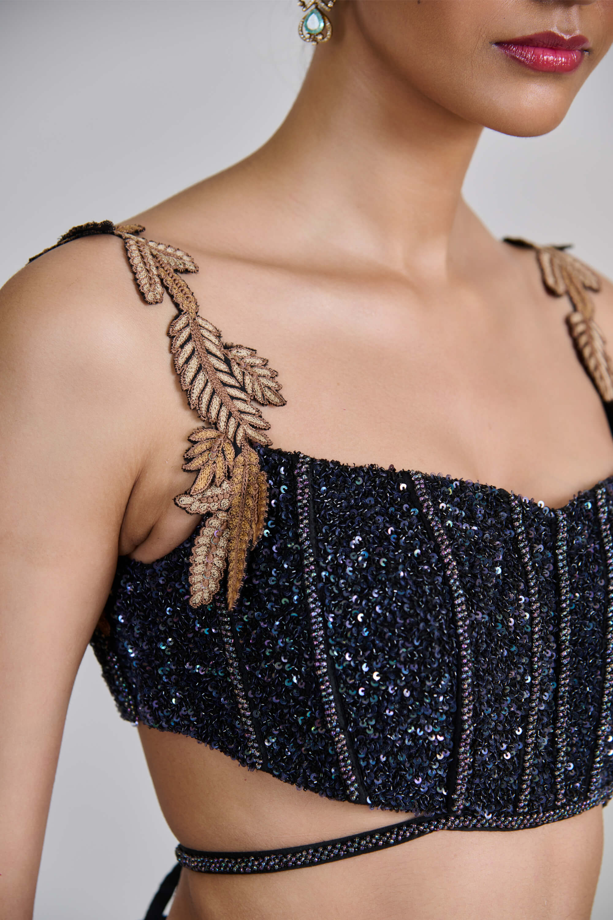A smocked peplum corset with wildflower applique and a draped skirt. Sculptural and chic. Ideal for evening celebrations or contemporary weddings.
