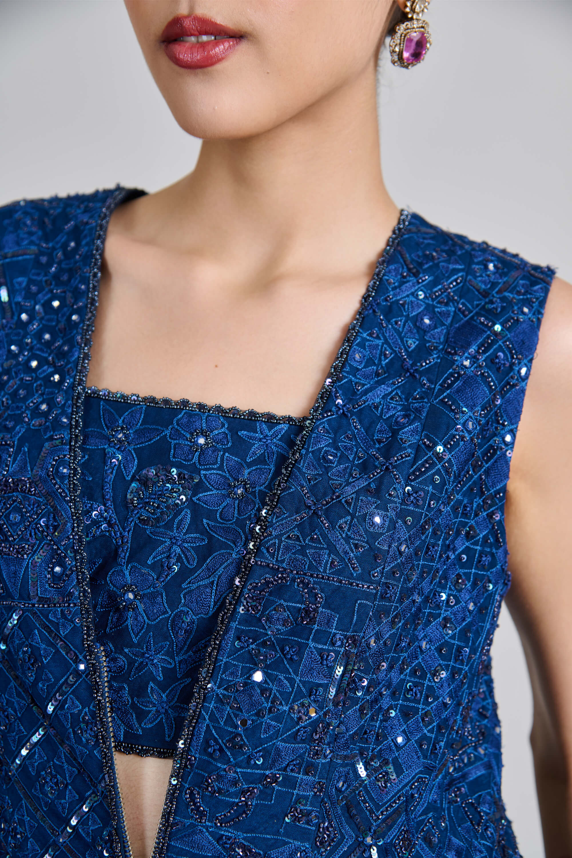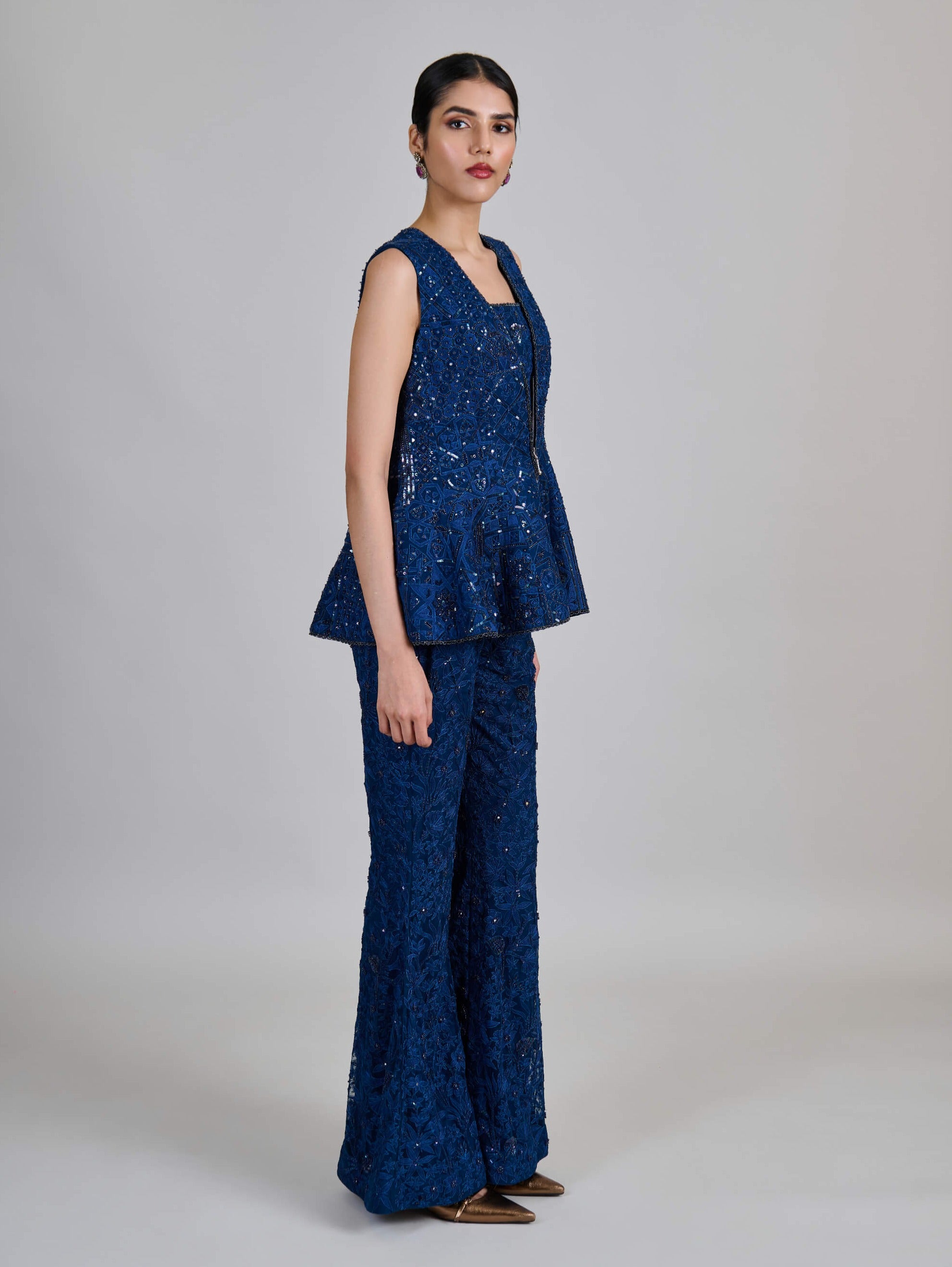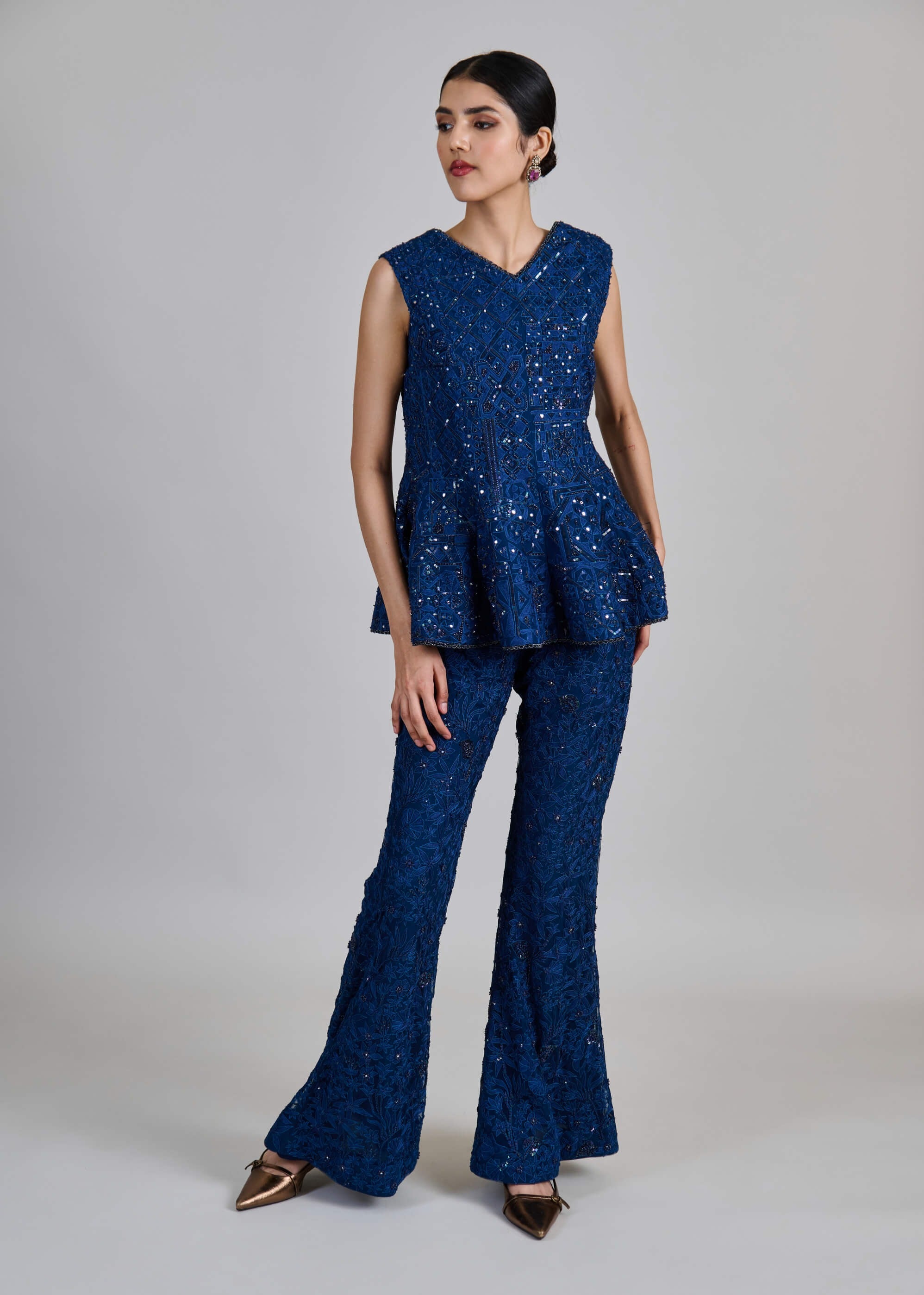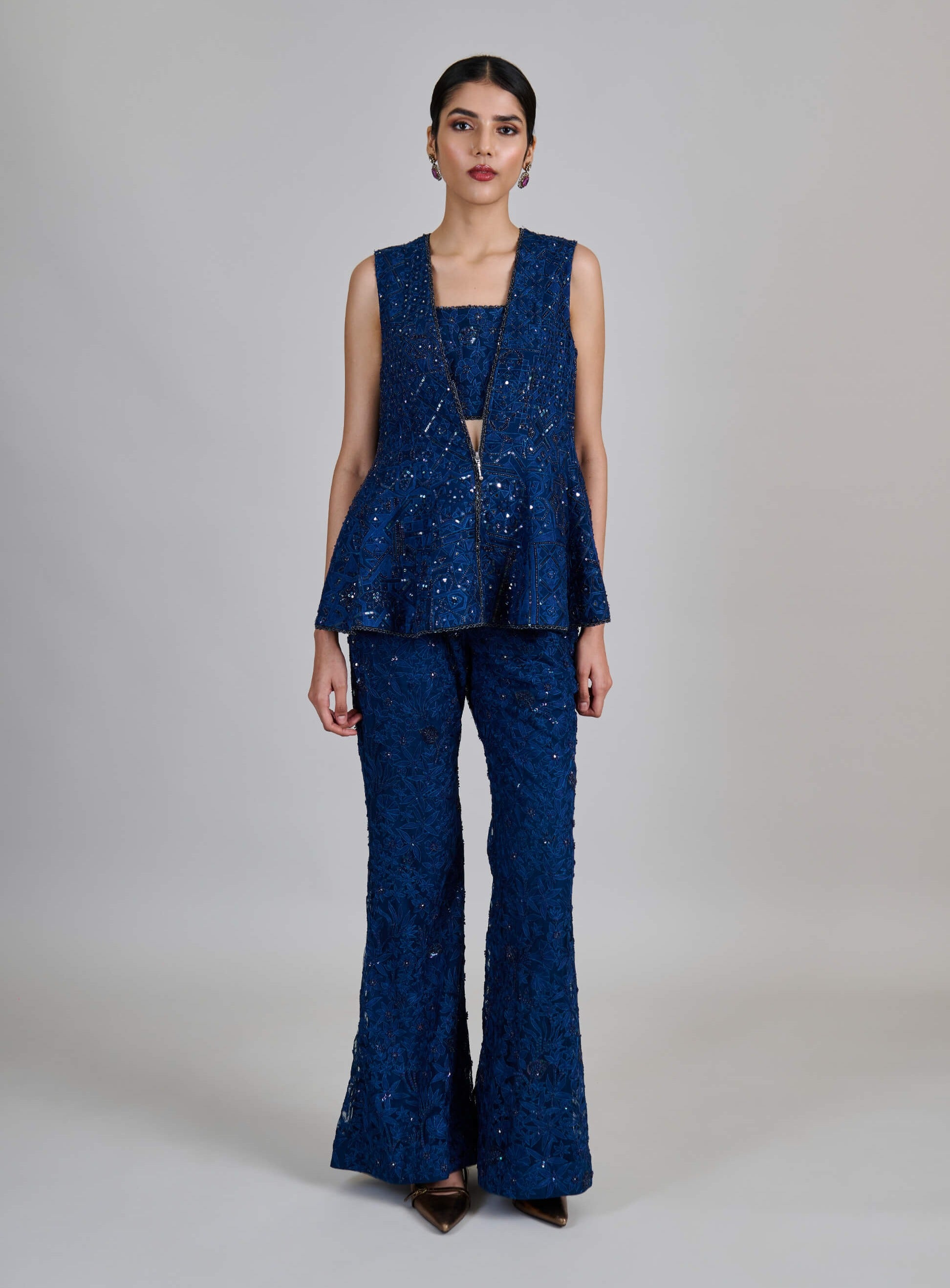 A tonal geometric peplum jacket paired with a wildflower bustier and slim pants. Polished and fashion-forward. Ideal for modern celebrations or evening gatherings.