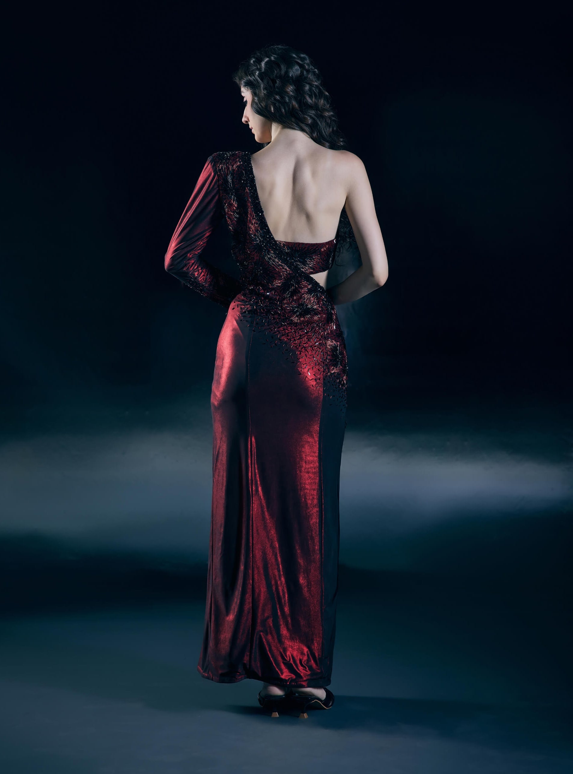 Cut in stretch shimmer lycra, this flame-red sari gown stands out with an asymmetric neckline, single sleeve, and radiant beadwork anchored by a fully embroidered bralette.