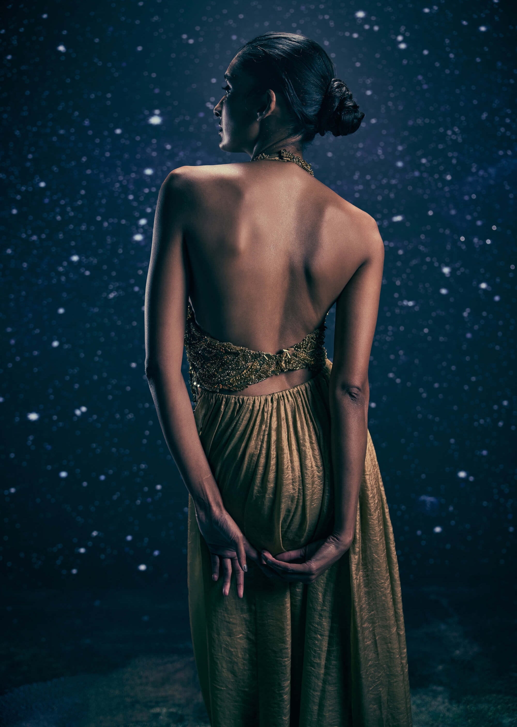 Defined by a halter neckline and backless silhouette, this solar-gold gown is sculpted with a cinched waist and abstract embroidery that glimmers with strength and movement.