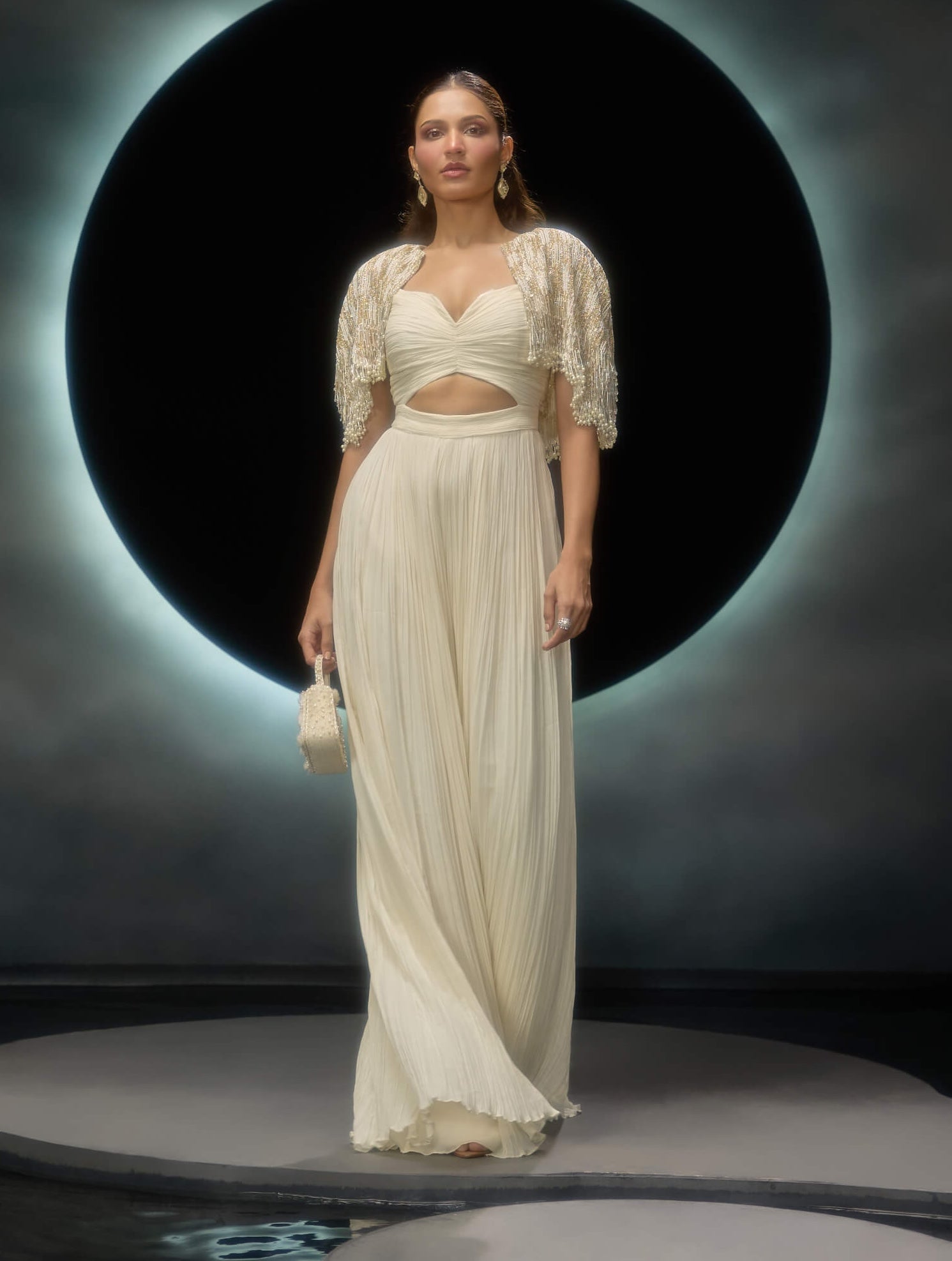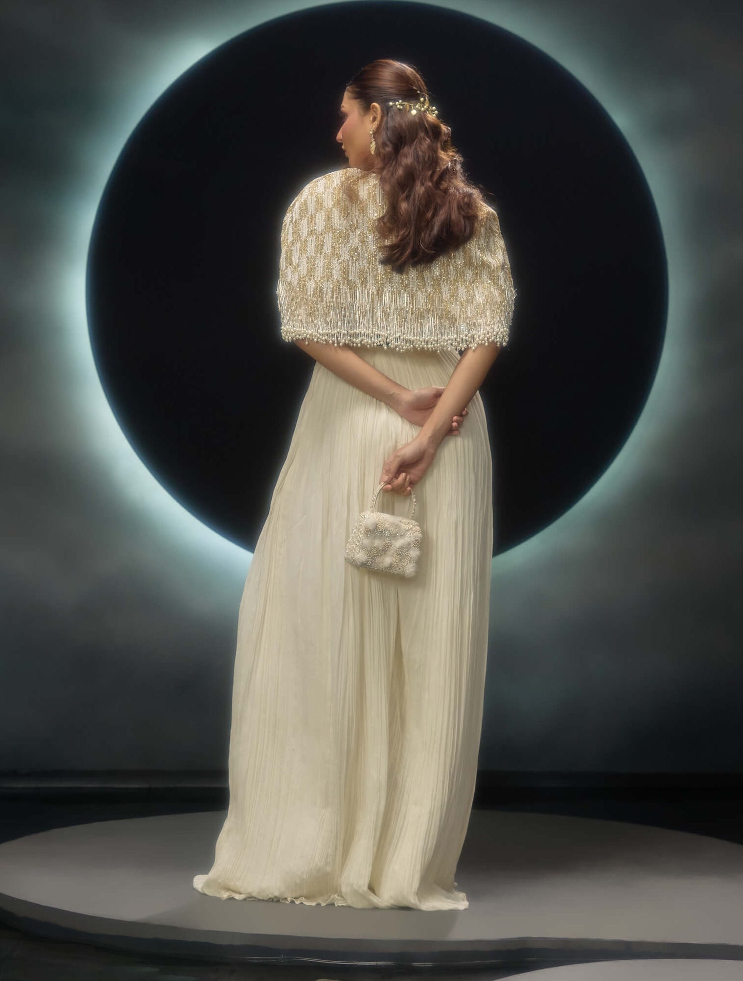 A cloud-like fusion of fluidity and strength, the ivora jumpsuit set offers a contemporary take on occasion dressing. The hand-embroidered cape drapes effortlessly over a viscose-organza jumpsuit, creating sleek vertical movement. Textural details add richness without overpowering. Perfect for sangeet performances, cocktail nights, and chic evening affairs. A statement ensemble for the modern muse.