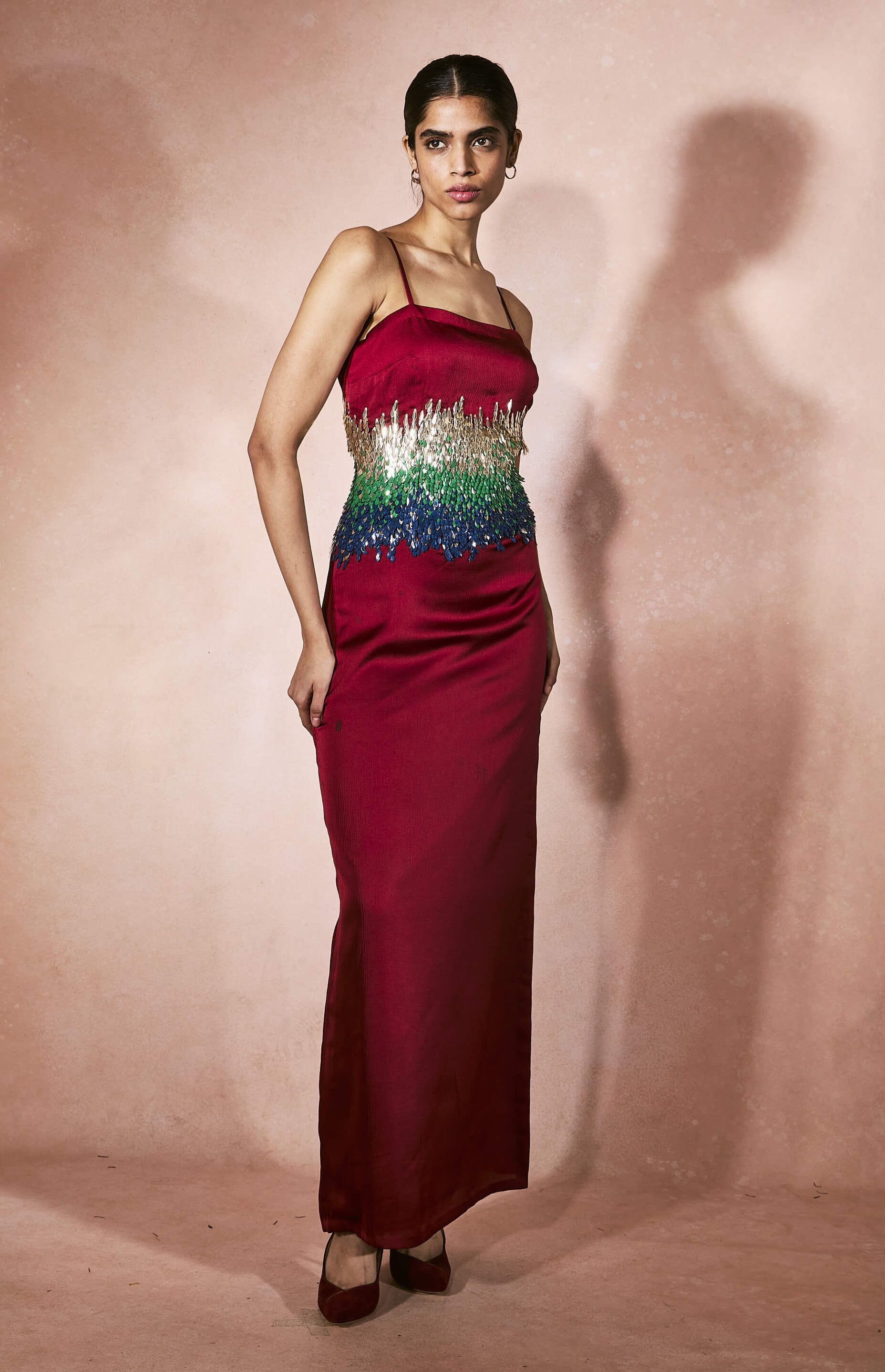 Rendered in sacred crimson, this sleek slip dress features an elongated silhouette accented with peacock-inspired embroidery at the waist, where minimal lines meet vivid detail for nights of quiet power and modern celebration.
